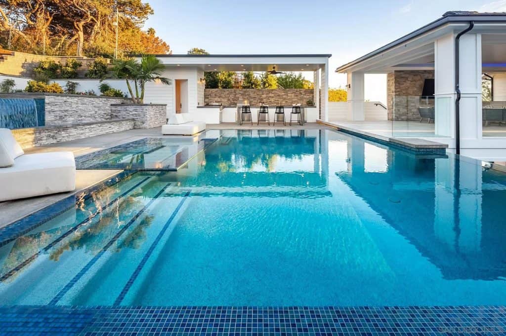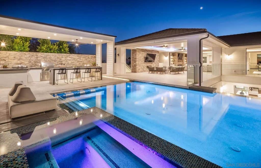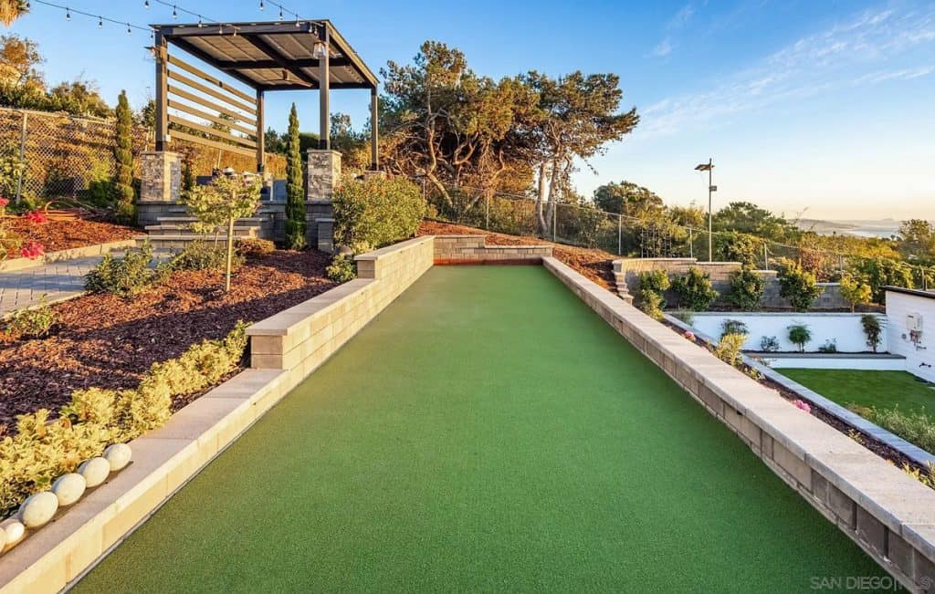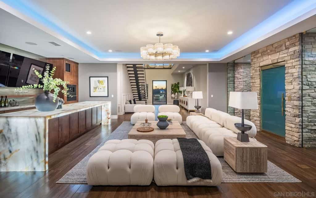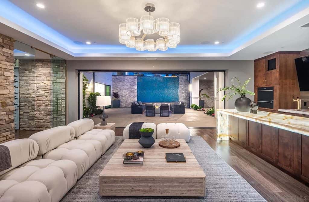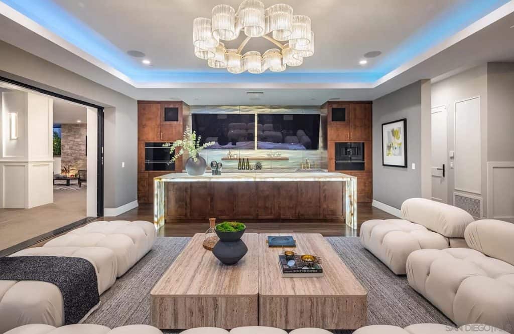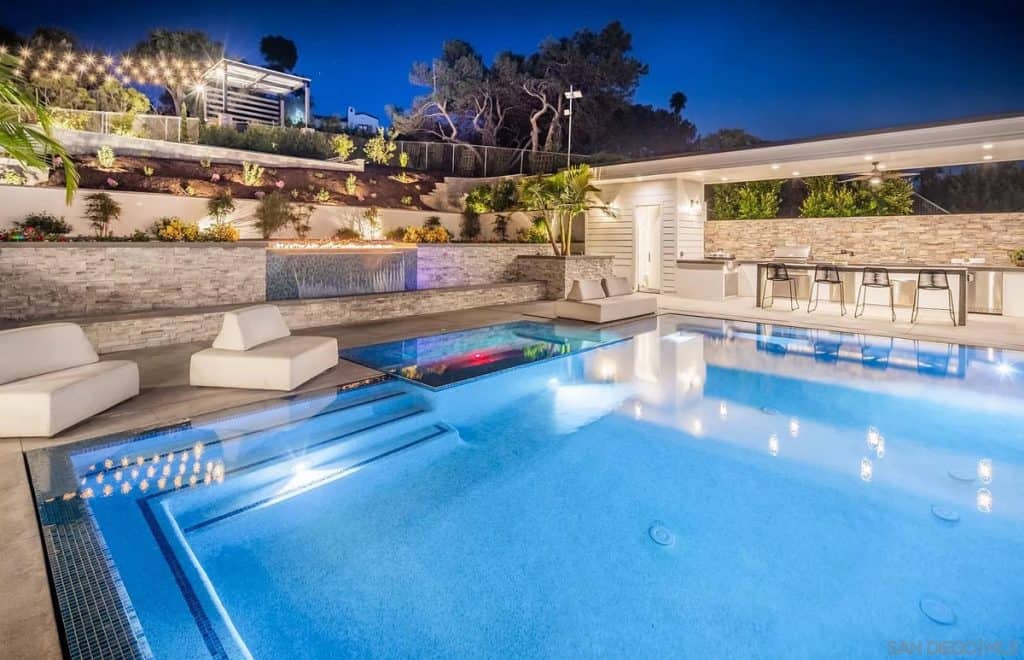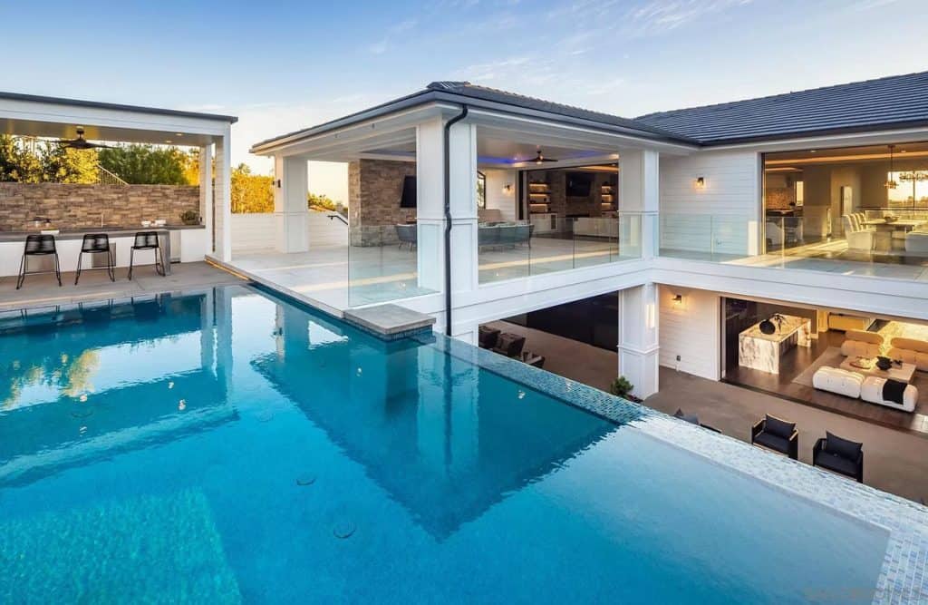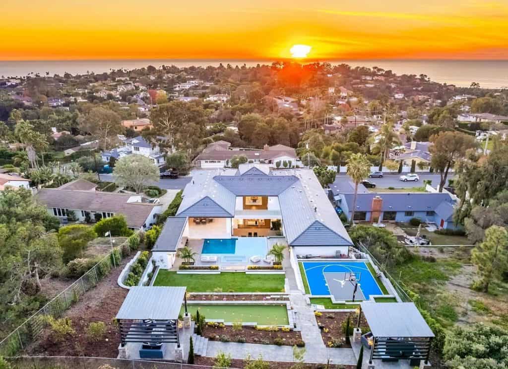 With its contemporary design and breathtaking ocean views, this 11,000 square foot masterpiece is truly perfect in every way. The first floor boasts a grand foyer, an outdoor pavilion with a magnificent 20-foot waterfall, a full bar/kitchen, and a wine room, making it the ideal space for hosting events and gatherings. Additionally, you’ll find a primary bedroom, a gym, an office, and an extra bedroom on this level, providing all the amenities of a luxurious resort home. Take the beautifully designed elevator up to the second floor, where you’ll be greeted by sweeping hillside and ocean views from every window. The spacious family room opens up to the dining room, breakfast nook, kitchen, and a veranda overlooking the pool. The second primary suite offers dual access to the living room hallway and the outdoor entertaining area, allowing for easy enjoyment of the ocean view basketball and bocce courts, as well as the heated swimming pool and spa.