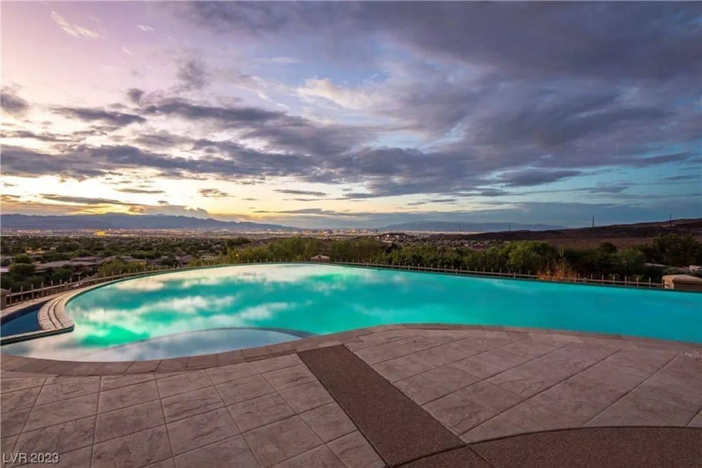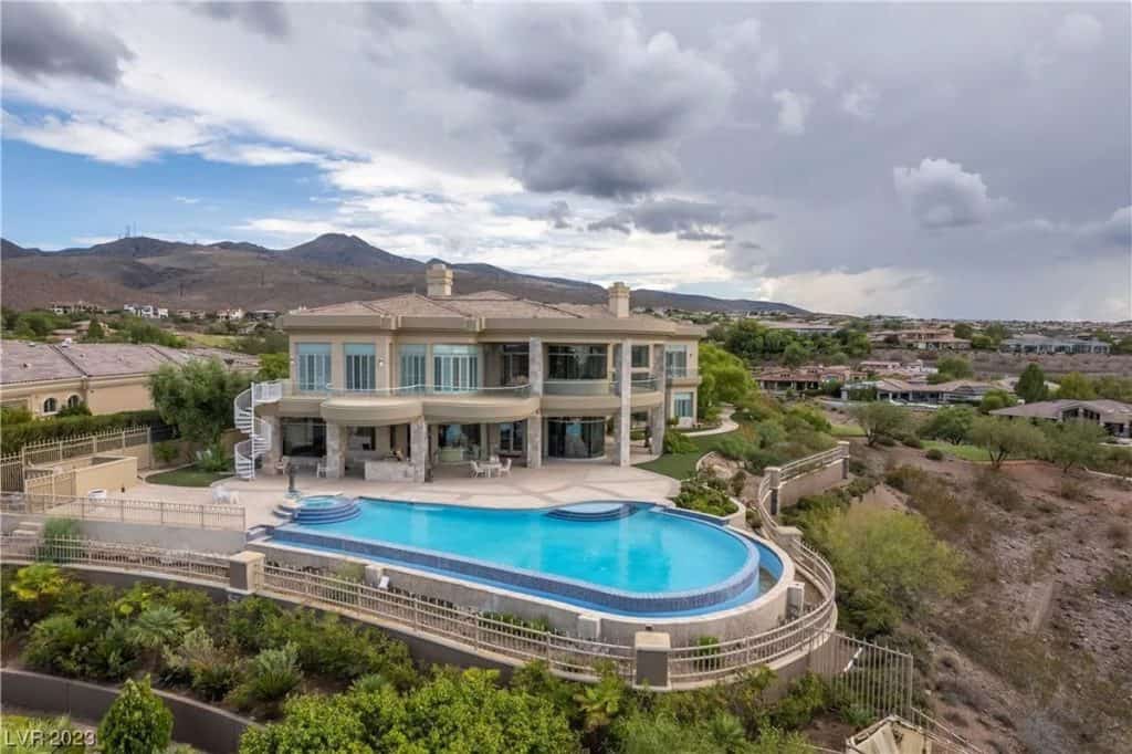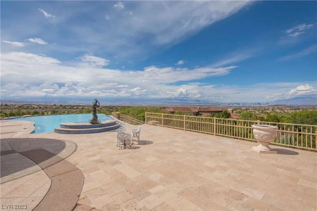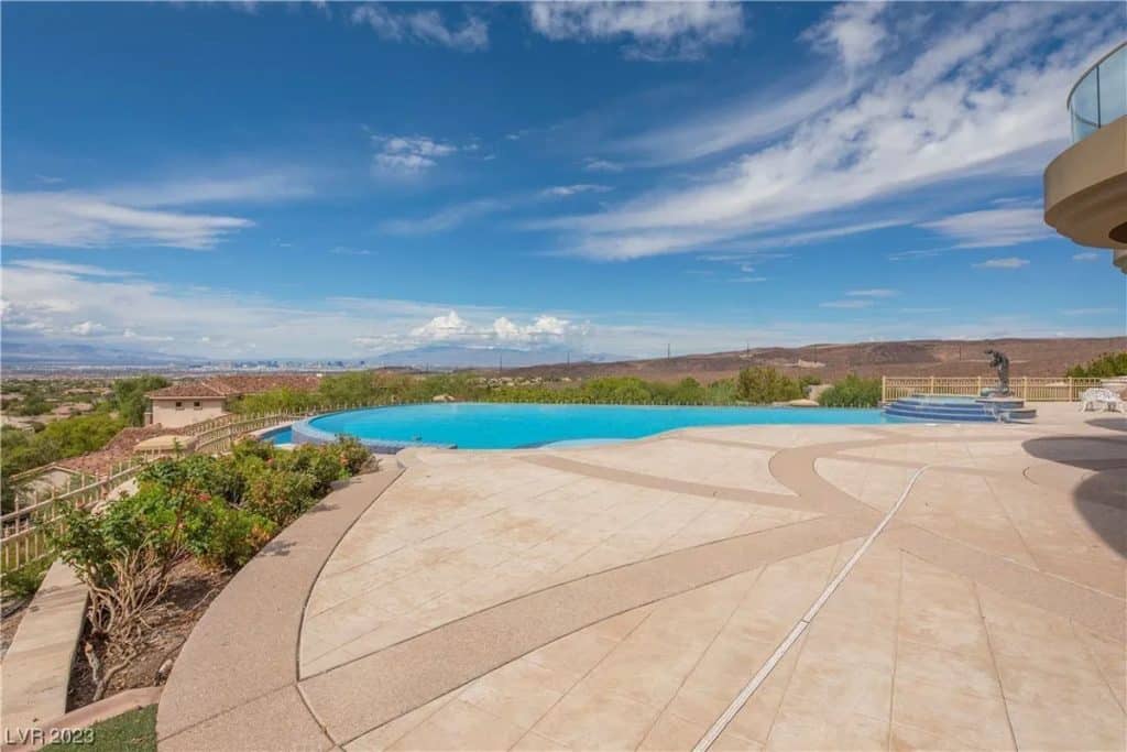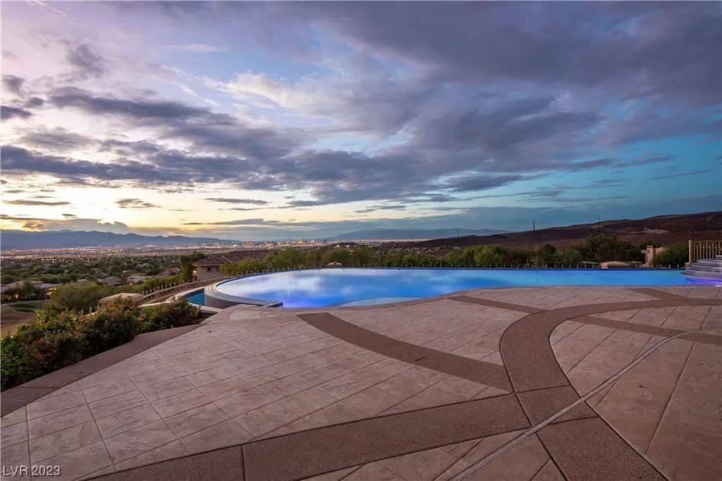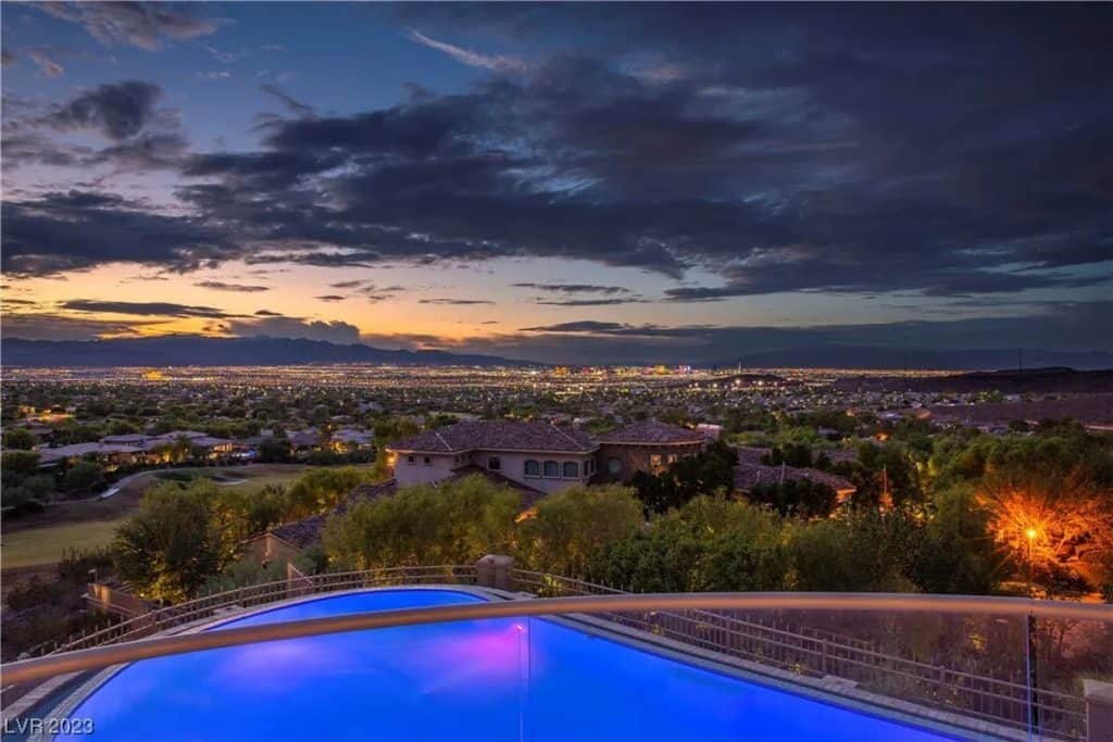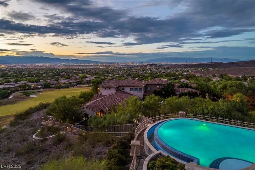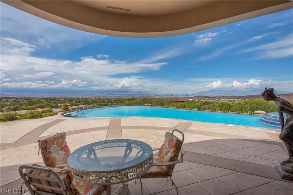 Perched on a 1.2 acre view lot above Anthem Country Club Golf Course, this trophy property offers breathtaking panoramic views of the valley, Strip, and Mountain ranges. Inside, you’ll find vaulted ceilings, a spiraling staircase, custom cherrywood, and curved glass nooks and balconies throughout. Step outside to the covered patios, outdoor kitchen and dining areas, and a custom tiled pool deck that overlooks the massive infinity edge pool, providing you with captivating views of the entire Las Vegas valley.