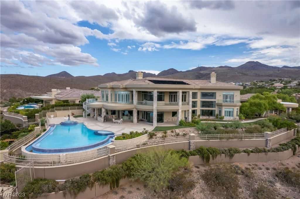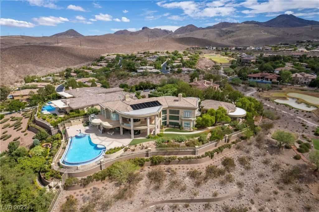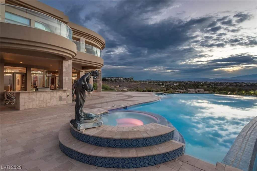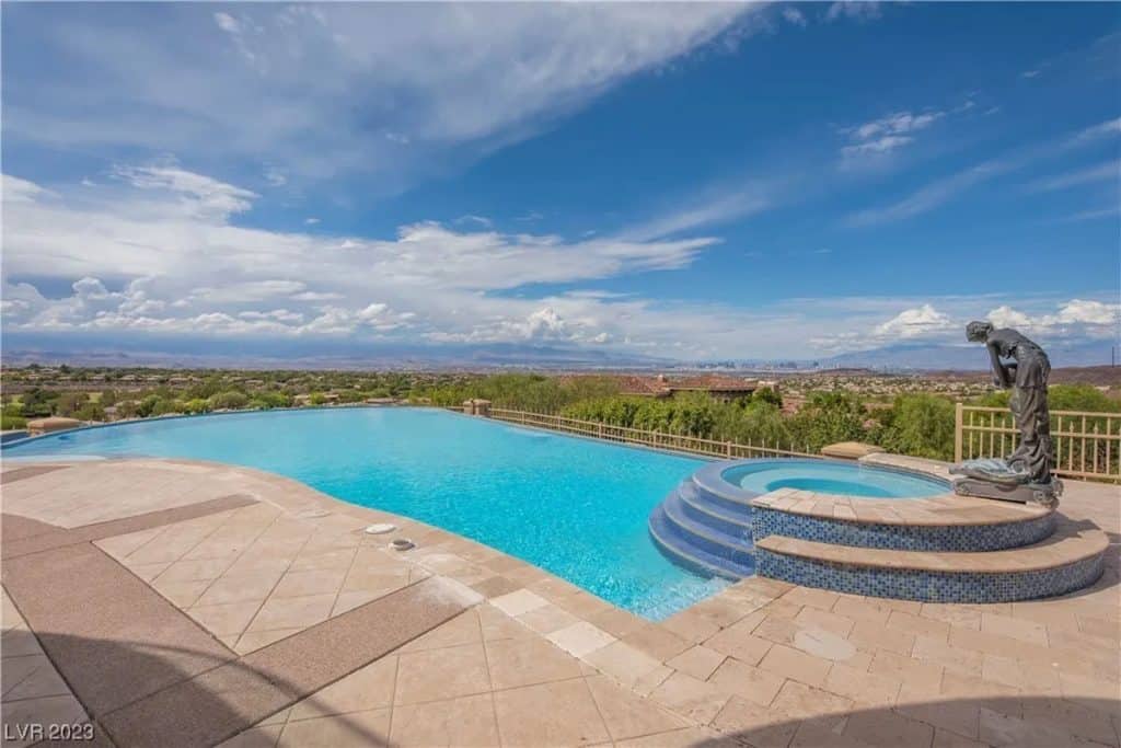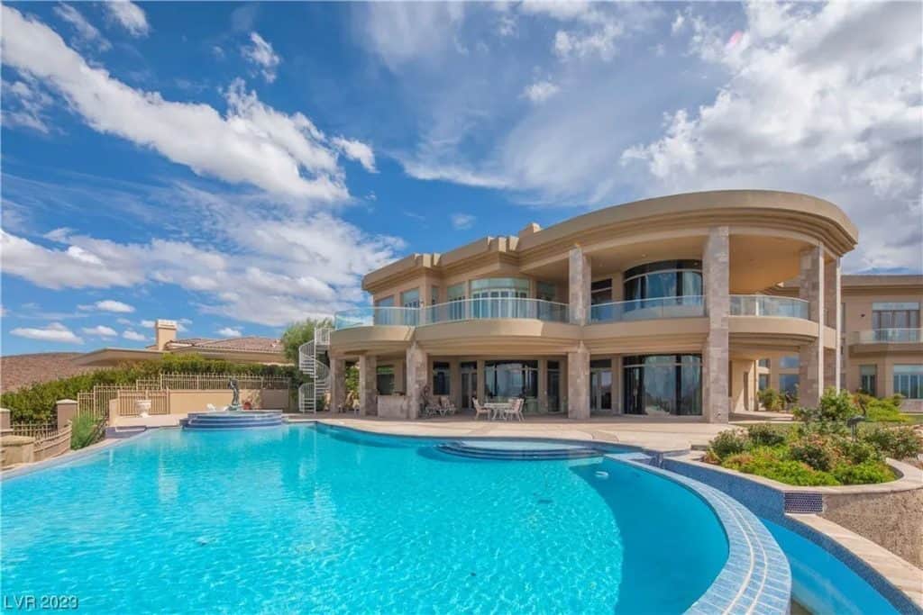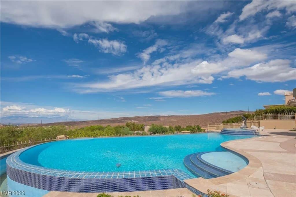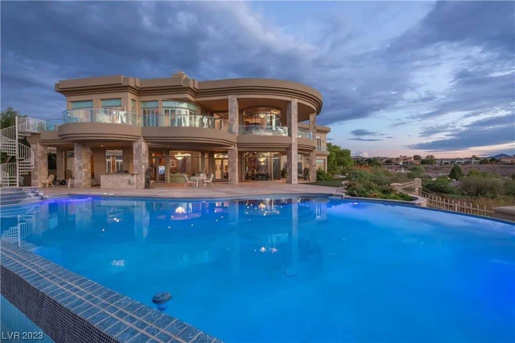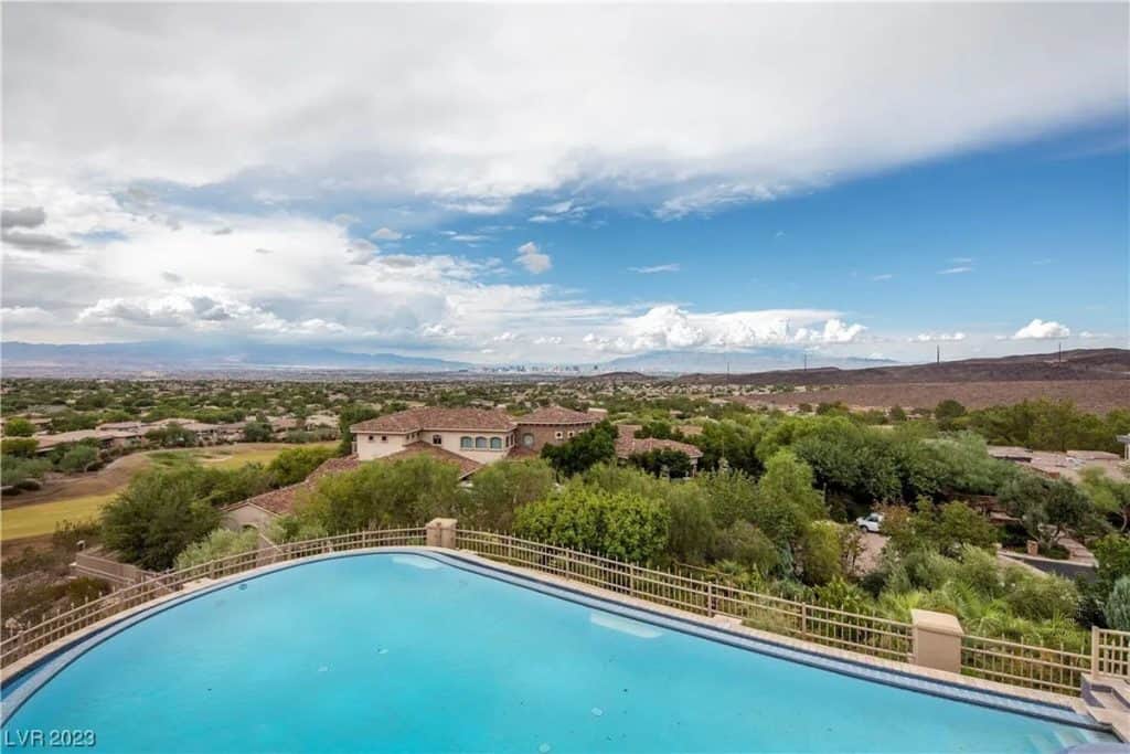 Perched on a 1.2 acre view lot above Anthem Country Club Golf Course, this trophy property offers breathtaking panoramic views of the valley, Strip, and Mountain ranges. Inside, you’ll find vaulted ceilings, a spiraling staircase, custom cherrywood, and curved glass nooks and balconies throughout. Step outside to the covered patios, outdoor kitchen and dining areas, and a custom tiled pool deck that overlooks the massive infinity edge pool, providing you with captivating views of the entire Las Vegas valley.