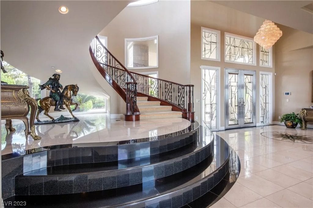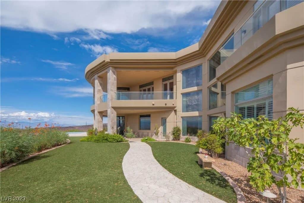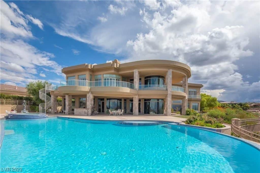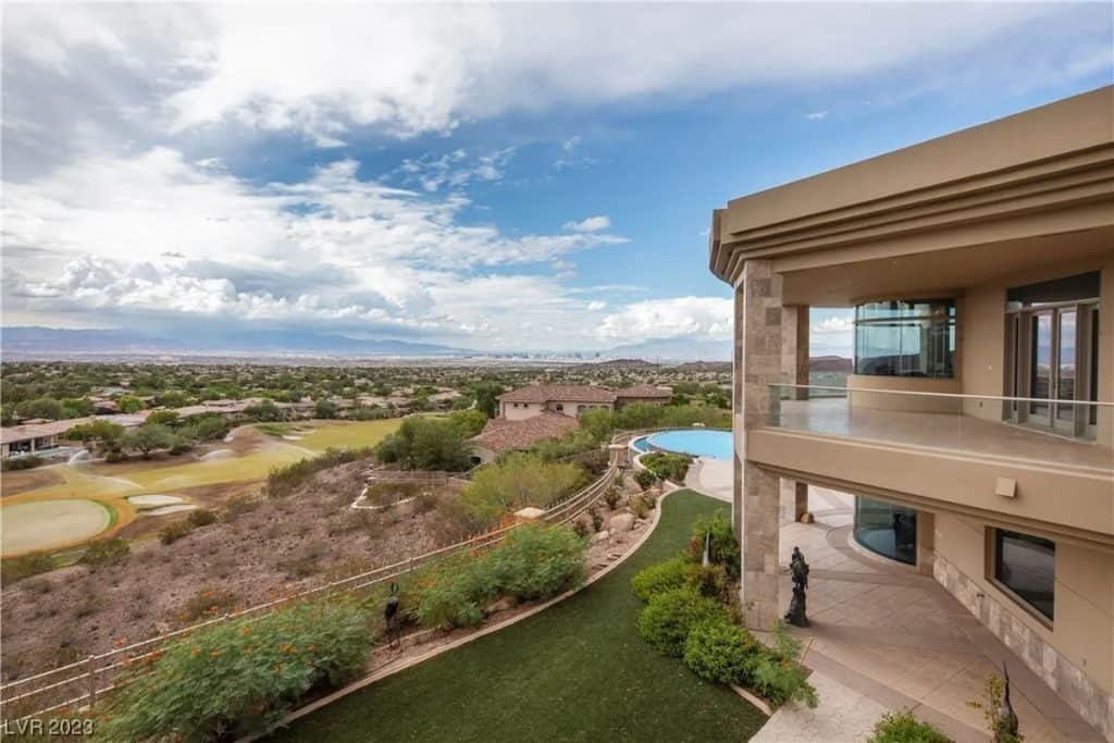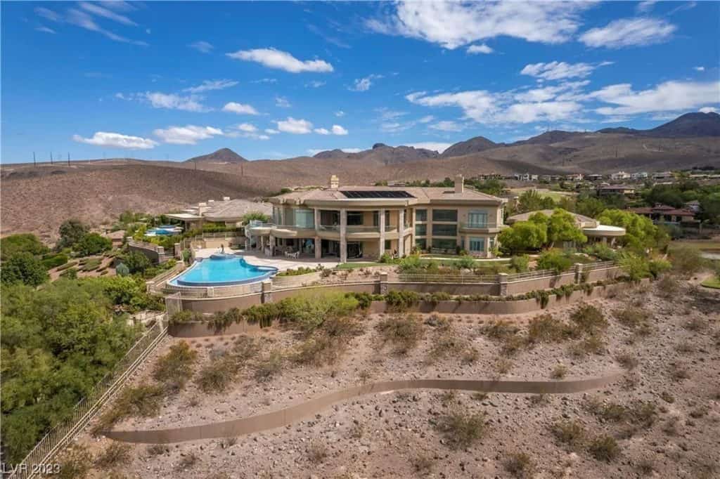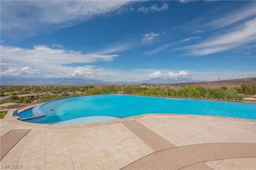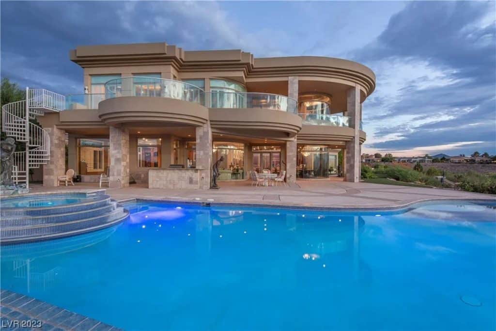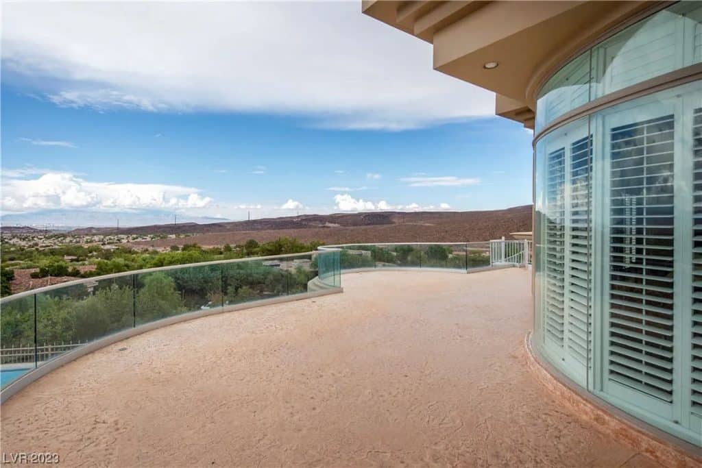 Perched on a 1.2 acre view lot above Anthem Country Club Golf Course, this trophy property offers breathtaking panoramic views of the valley, Strip, and Mountain ranges. Inside, you’ll find vaulted ceilings, a spiraling staircase, custom cherrywood, and curved glass nooks and balconies throughout. Step outside to the covered patios, outdoor kitchen and dining areas, and a custom tiled pool deck that overlooks the massive infinity edge pool, providing you with captivating views of the entire Las Vegas valley.