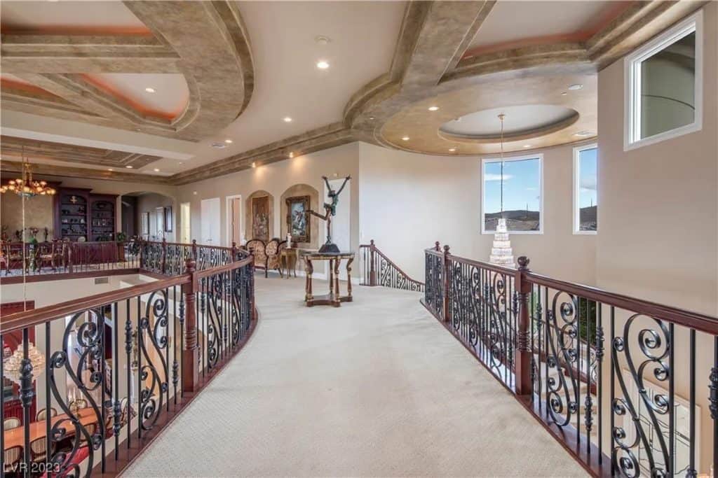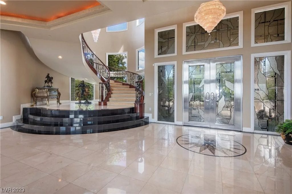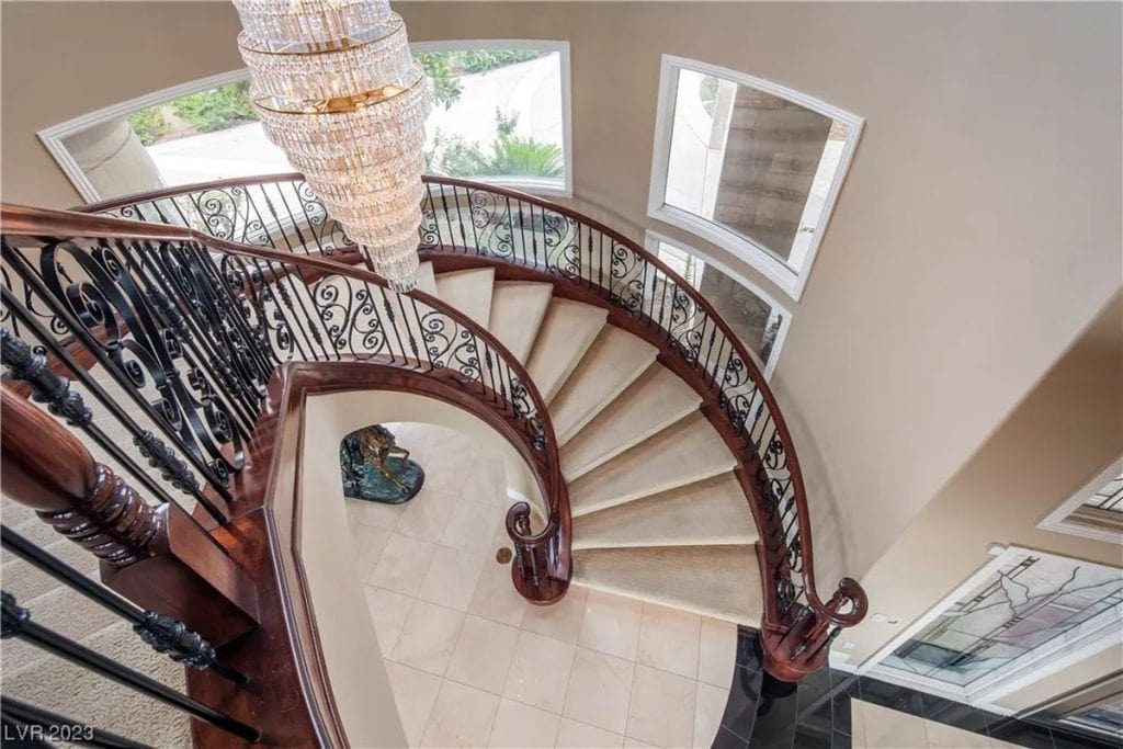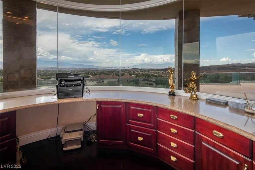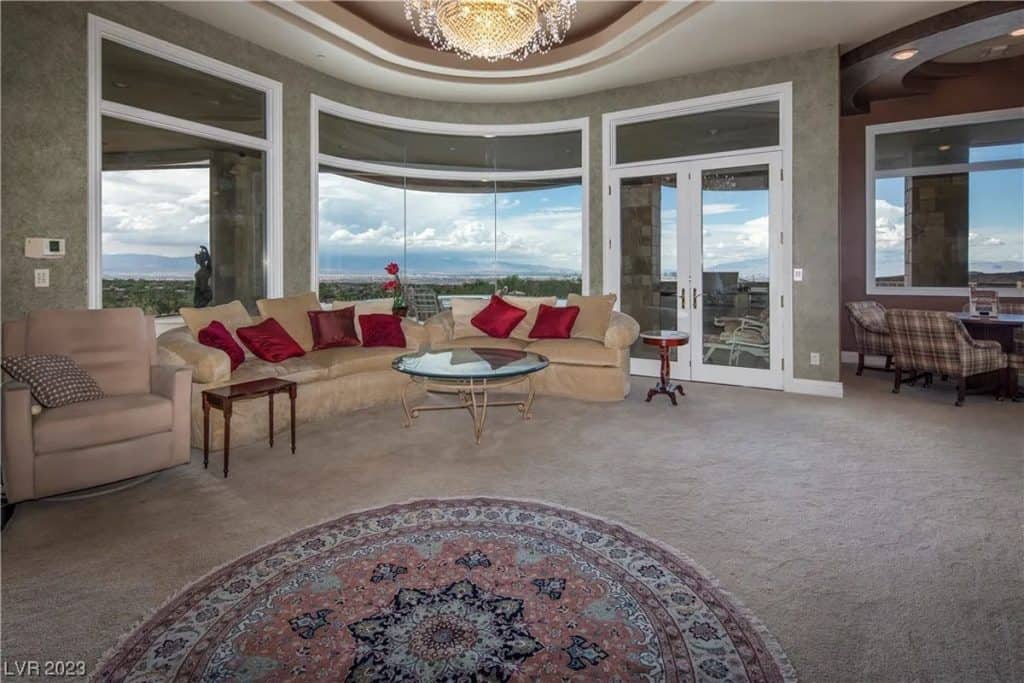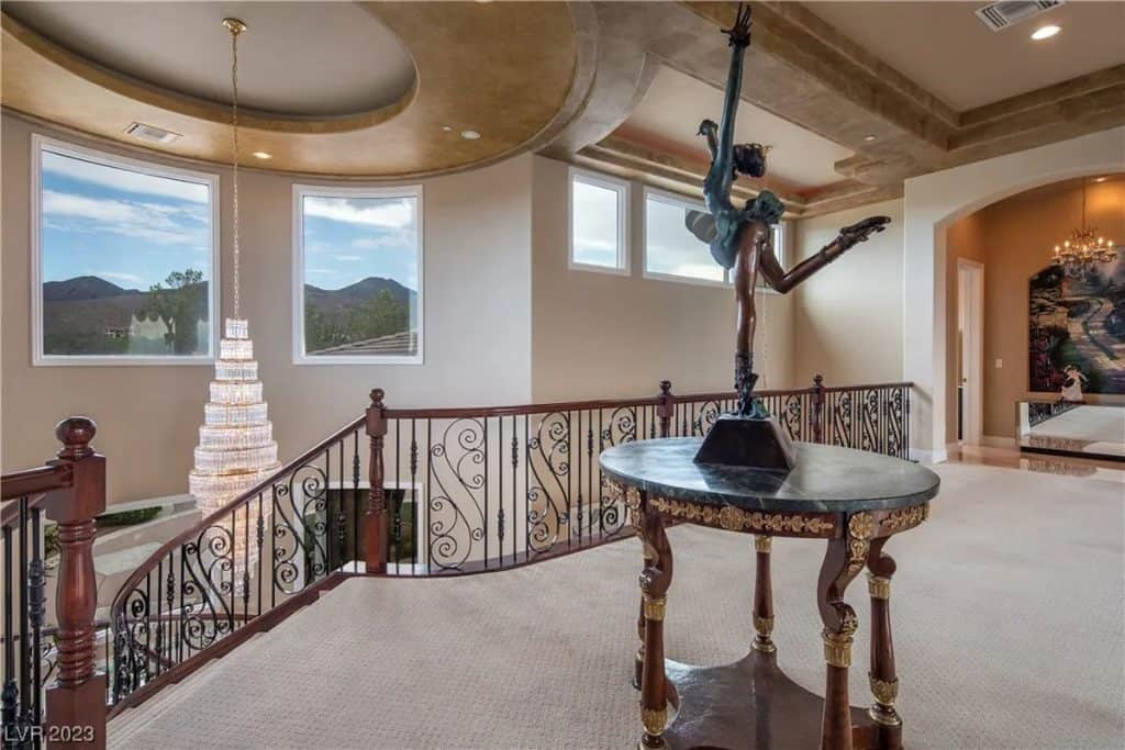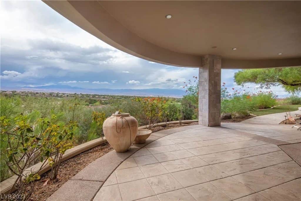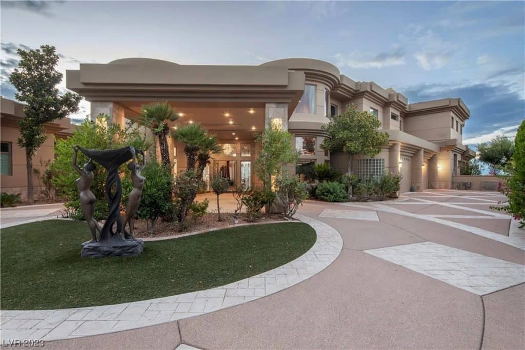 Perched on a 1.2 acre view lot above Anthem Country Club Golf Course, this trophy property offers breathtaking panoramic views of the valley, Strip, and Mountain ranges. Inside, you’ll find vaulted ceilings, a spiraling staircase, custom cherrywood, and curved glass nooks and balconies throughout. Step outside to the covered patios, outdoor kitchen and dining areas, and a custom tiled pool deck that overlooks the massive infinity edge pool, providing you with captivating views of the entire Las Vegas valley.