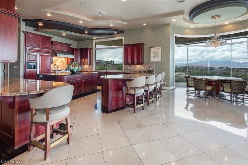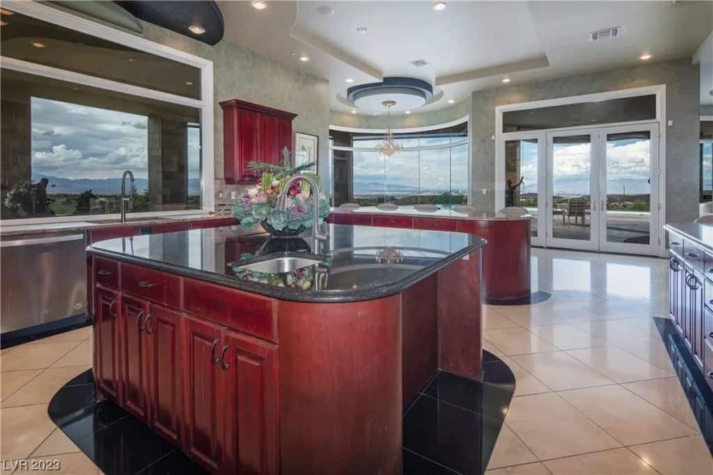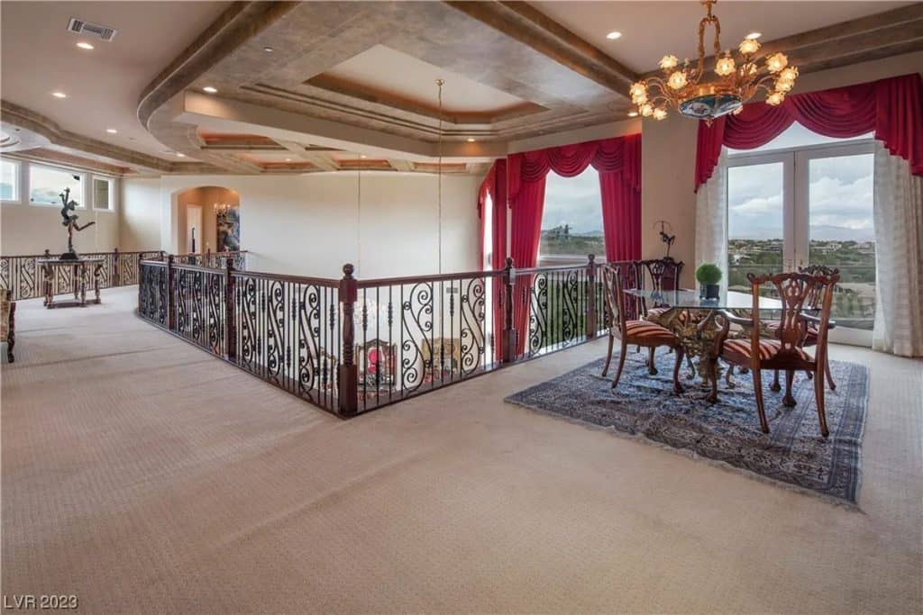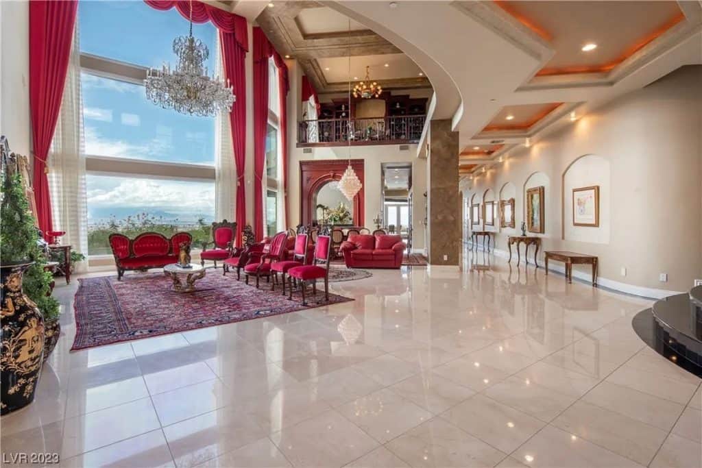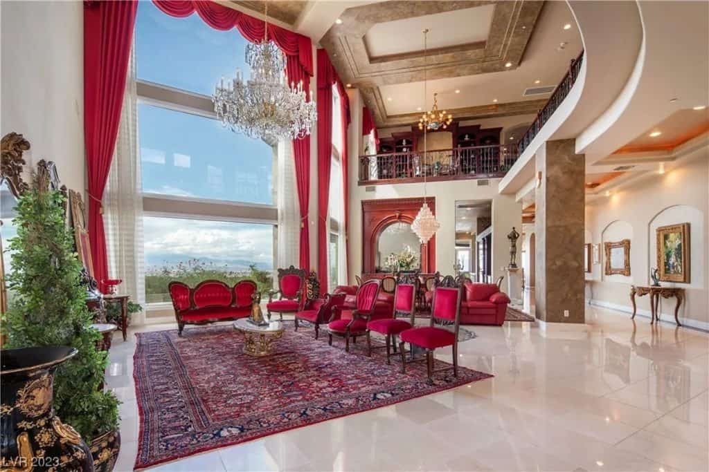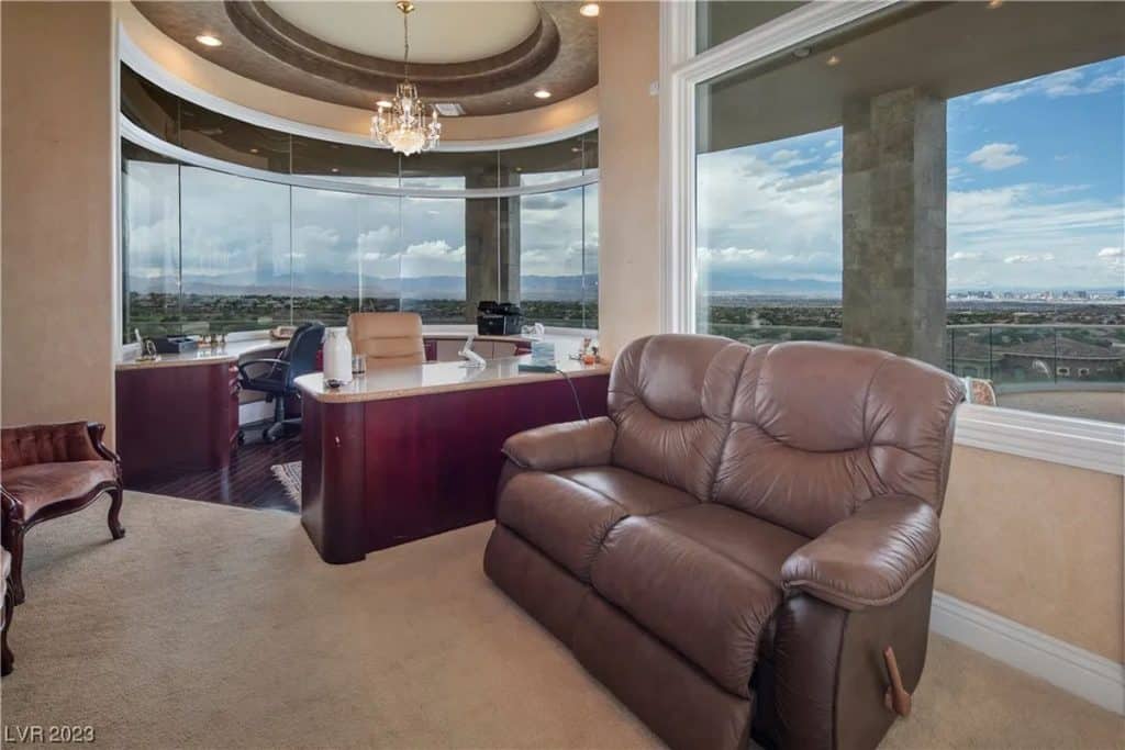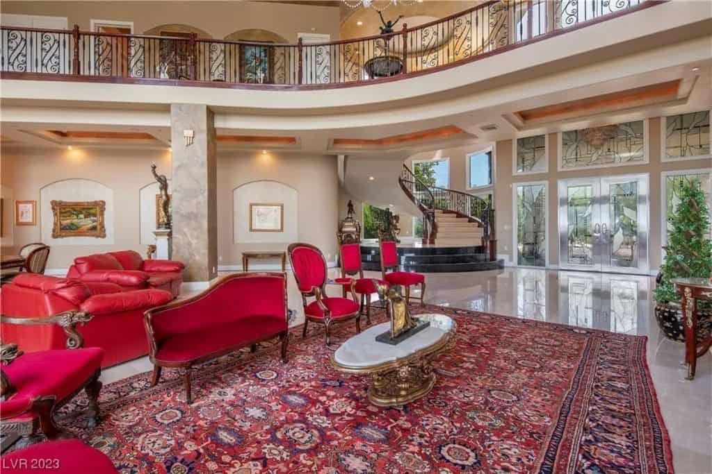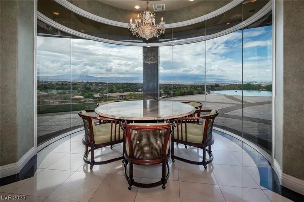 Perched on a 1.2 acre view lot above Anthem Country Club Golf Course, this trophy property offers breathtaking panoramic views of the valley, Strip, and Mountain ranges. Inside, you’ll find vaulted ceilings, a spiraling staircase, custom cherrywood, and curved glass nooks and balconies throughout. Step outside to the covered patios, outdoor kitchen and dining areas, and a custom tiled pool deck that overlooks the massive infinity edge pool, providing you with captivating views of the entire Las Vegas valley.