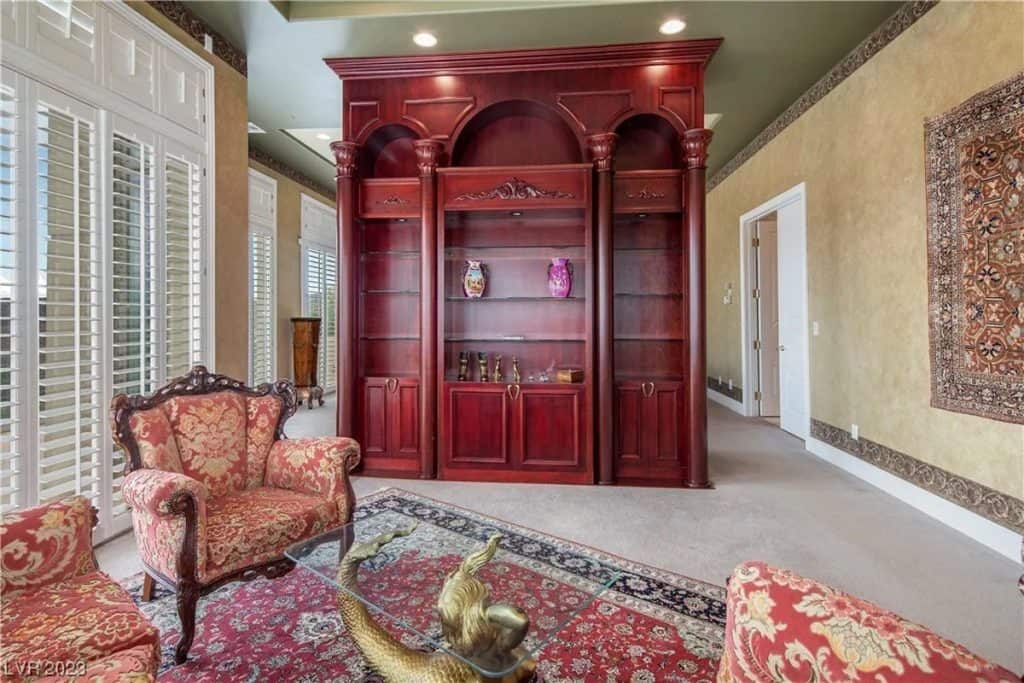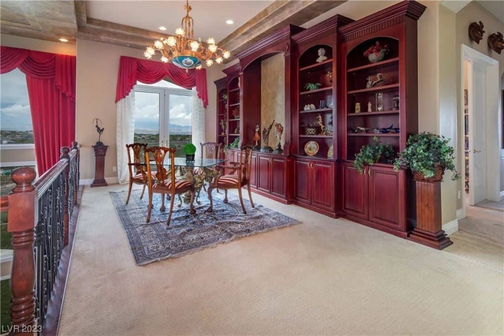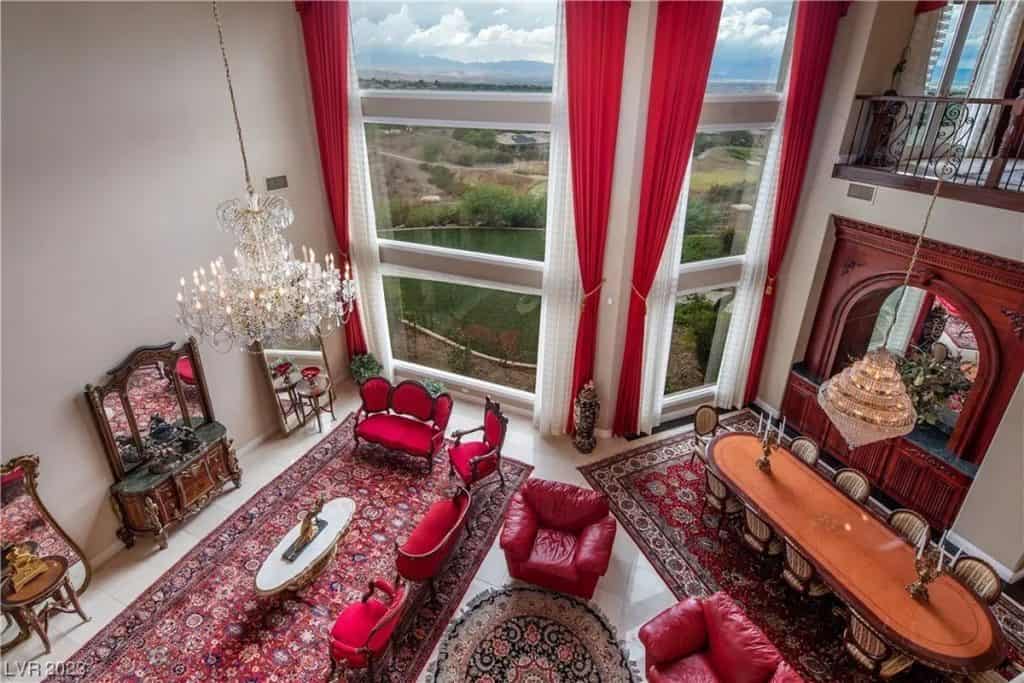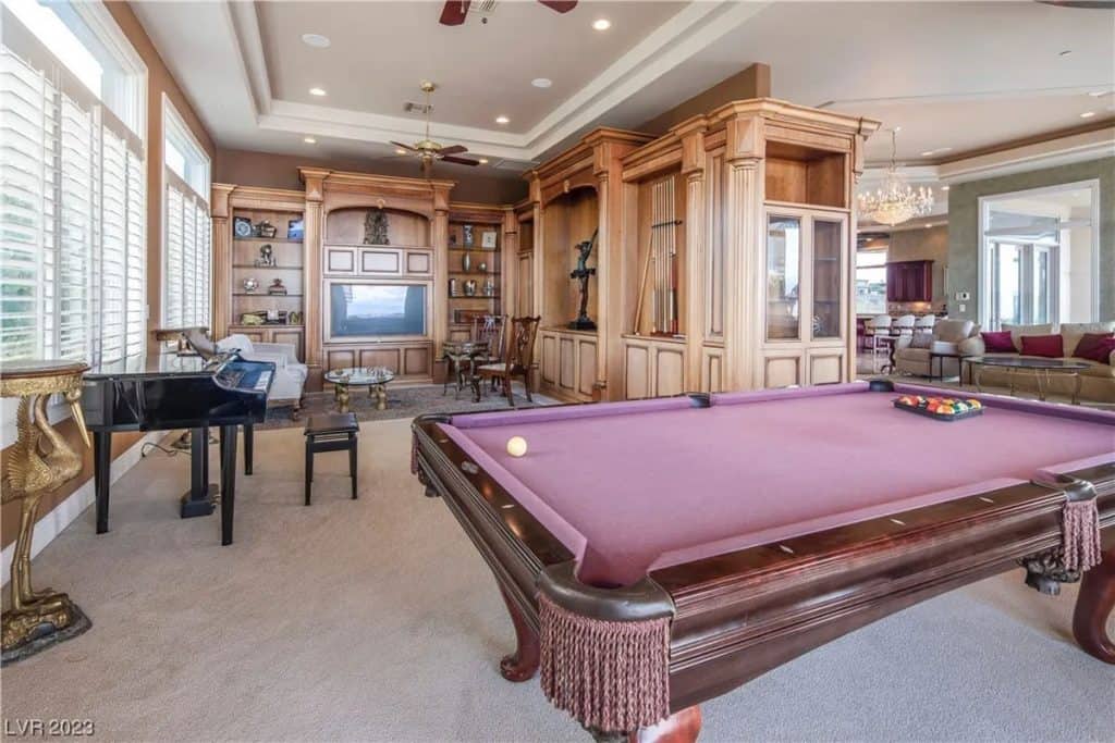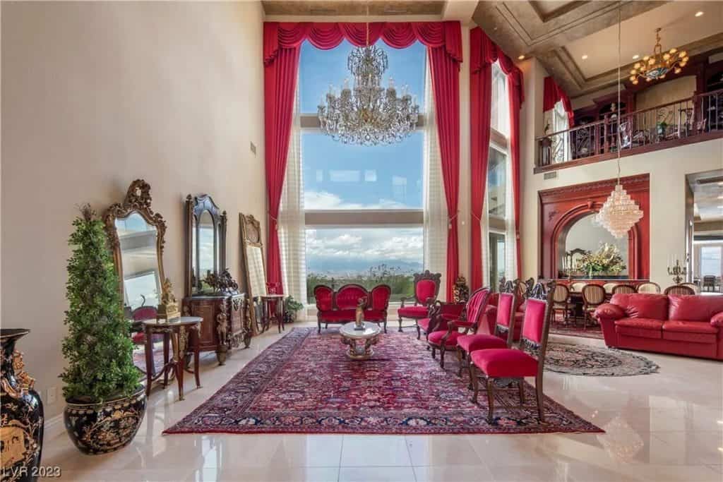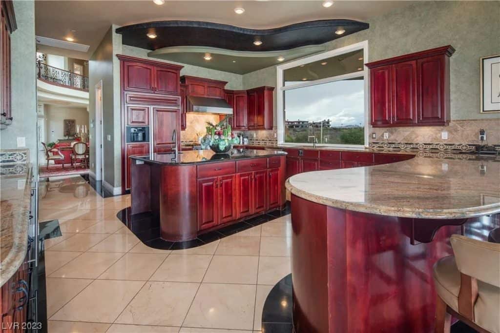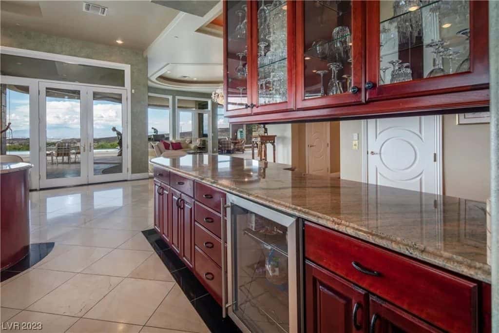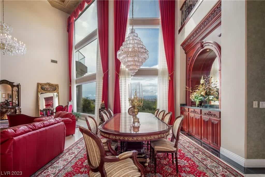 Perched on a 1.2 acre view lot above Anthem Country Club Golf Course, this trophy property offers breathtaking panoramic views of the valley, Strip, and Mountain ranges. Inside, you’ll find vaulted ceilings, a spiraling staircase, custom cherrywood, and curved glass nooks and balconies throughout. Step outside to the covered patios, outdoor kitchen and dining areas, and a custom tiled pool deck that overlooks the massive infinity edge pool, providing you with captivating views of the entire Las Vegas valley.