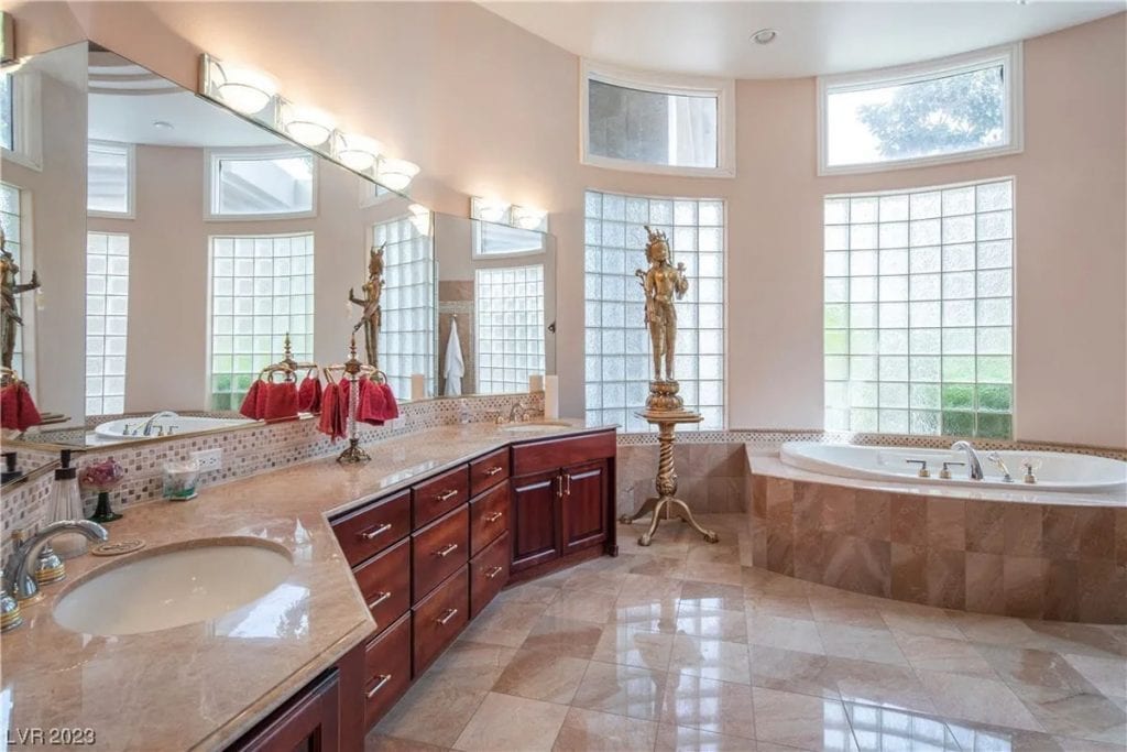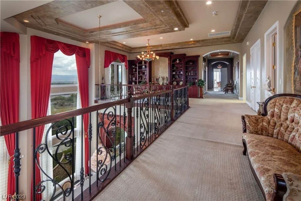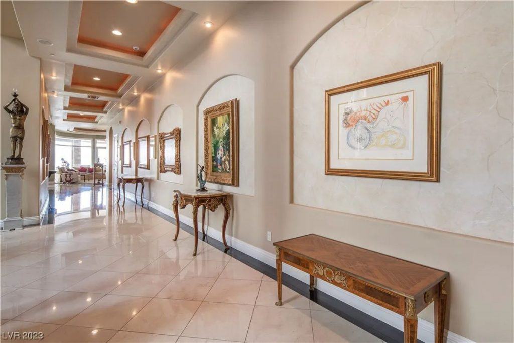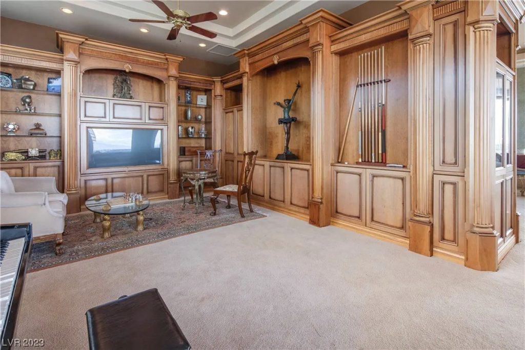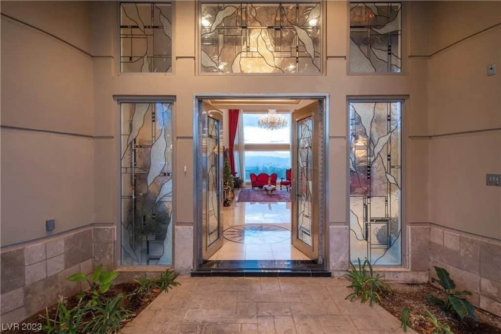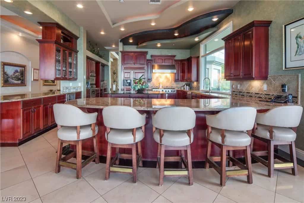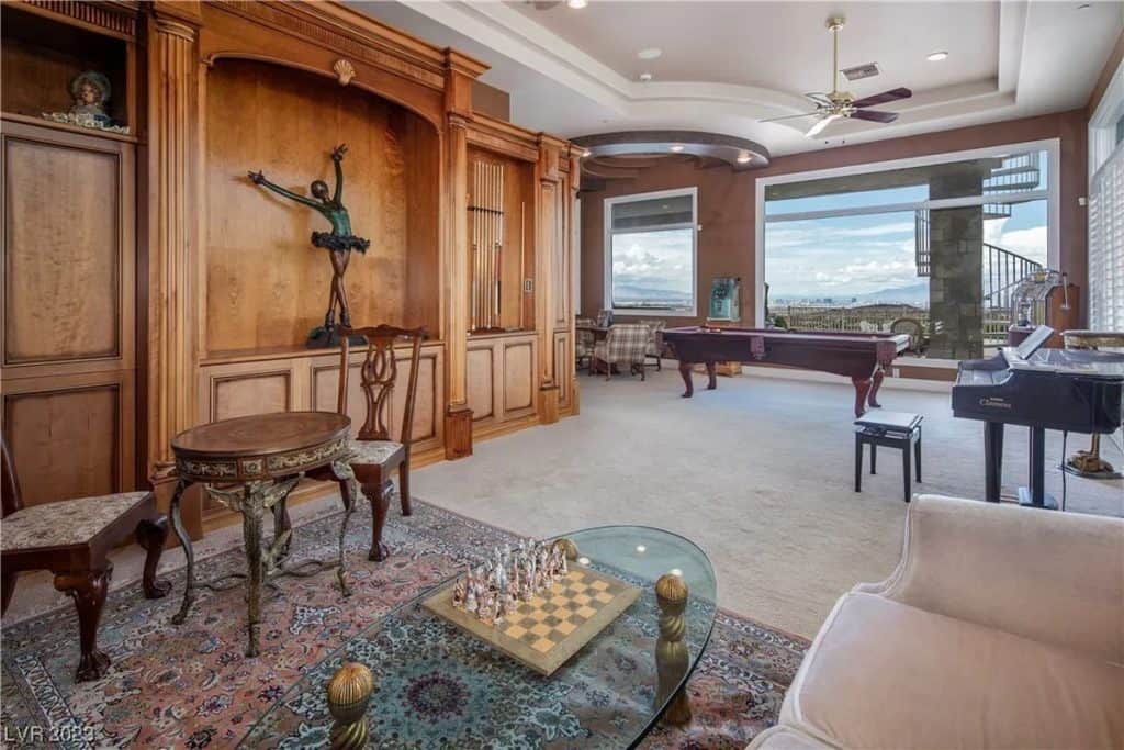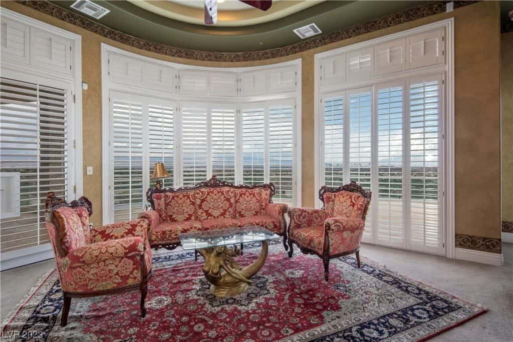 Perched on a 1.2 acre view lot above Anthem Country Club Golf Course, this trophy property offers breathtaking panoramic views of the valley, Strip, and Mountain ranges. Inside, you’ll find vaulted ceilings, a spiraling staircase, custom cherrywood, and curved glass nooks and balconies throughout. Step outside to the covered patios, outdoor kitchen and dining areas, and a custom tiled pool deck that overlooks the massive infinity edge pool, providing you with captivating views of the entire Las Vegas valley.