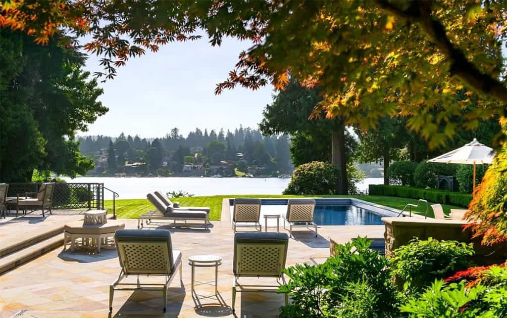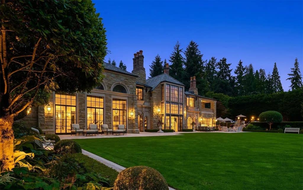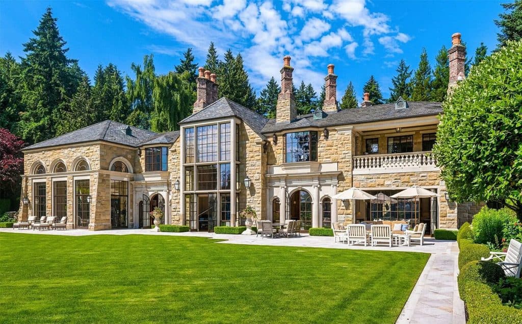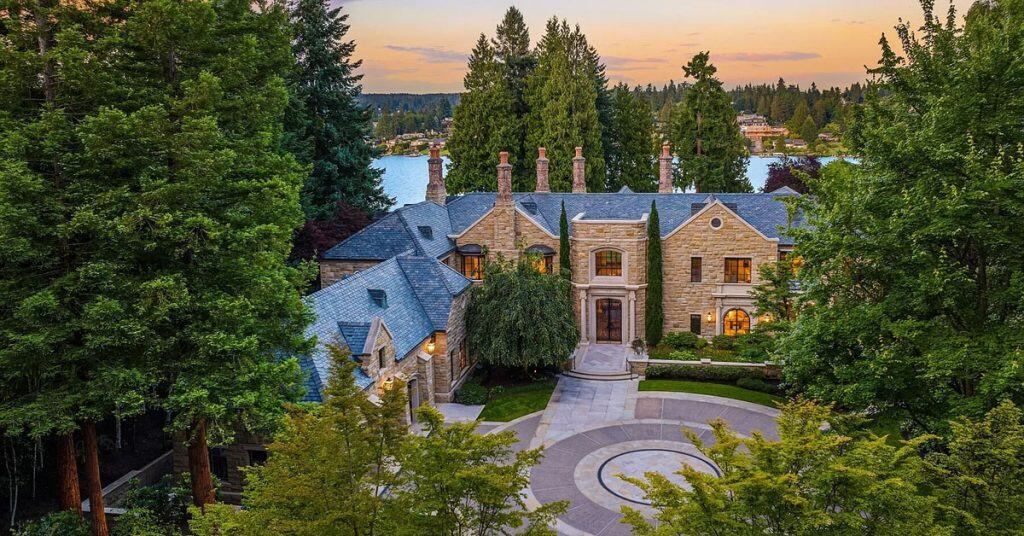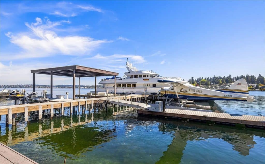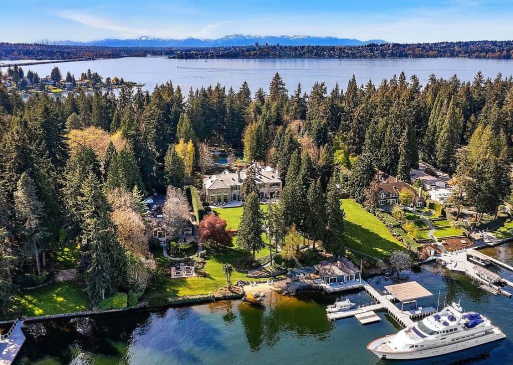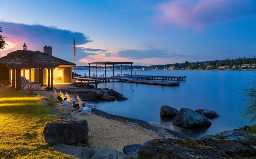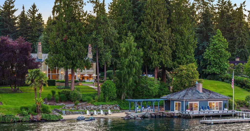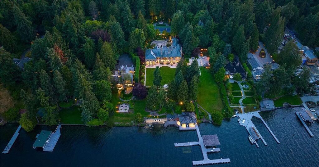 This exceptional 4.3-acre estate on Lake Washington is located in one of the most desirable waterfront communities globally. With 327 feet of shoreline, a stunning dock awaits your aquatic adventures; it can accommodate boats, a seaplane, jet skis, and a yacht over 150 feet. Summers are enjoyed at the beach, on the expansive lawn, by the pool, playing tennis, or wandering through the gardens. The beautifully designed sandstone mansion is perfect for peaceful daily living and impressive entertaining. The floor-to-ceiling black steel windows showcase the shimmering lake and verdant grounds, flooding the interiors with natural light. Featuring an in-home gym, cabana, beach house/guest cottage, and staff house, all your needs are catered to.