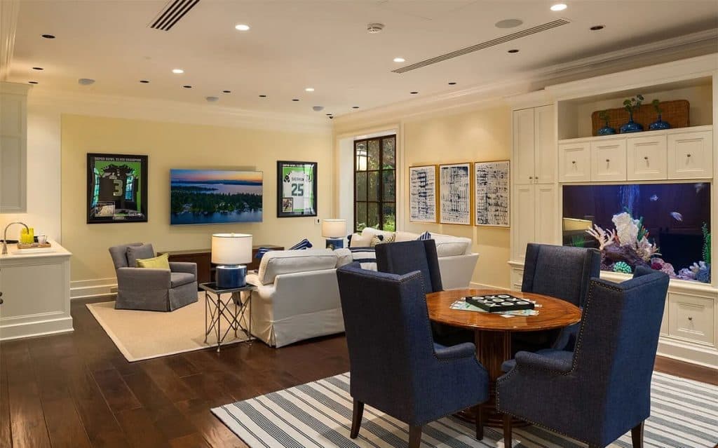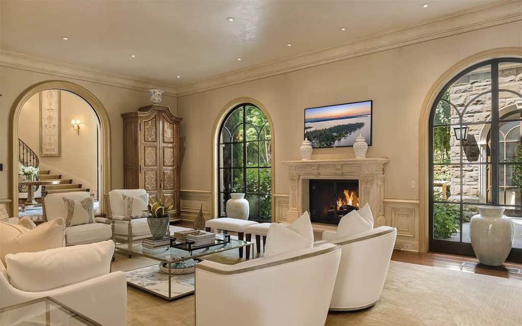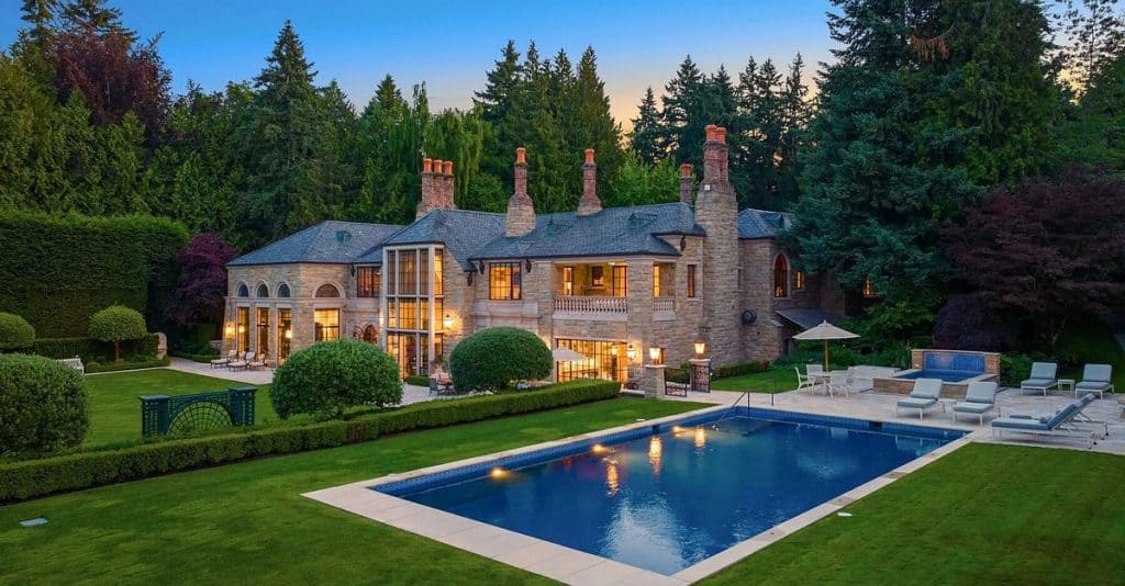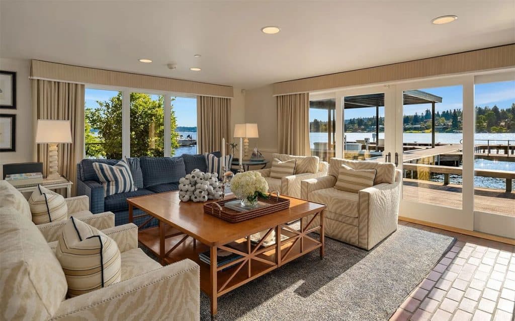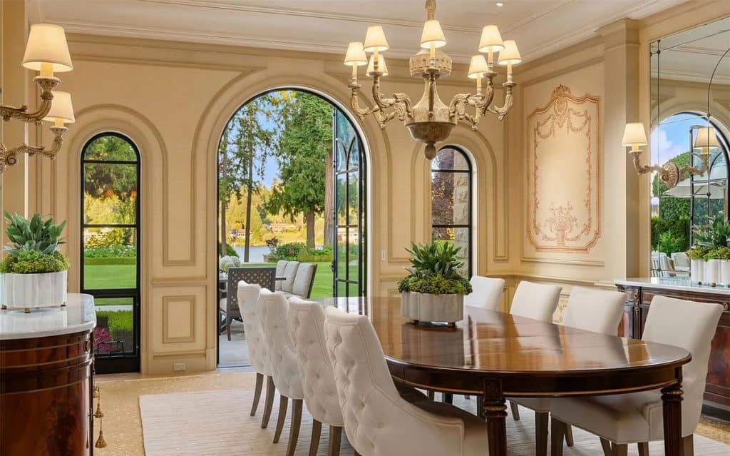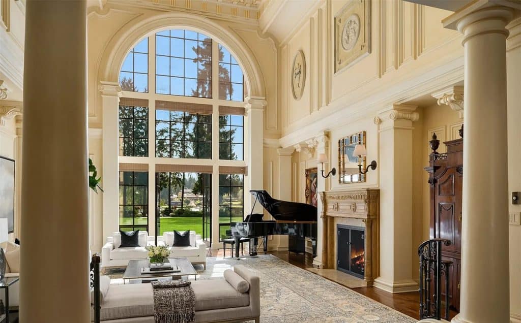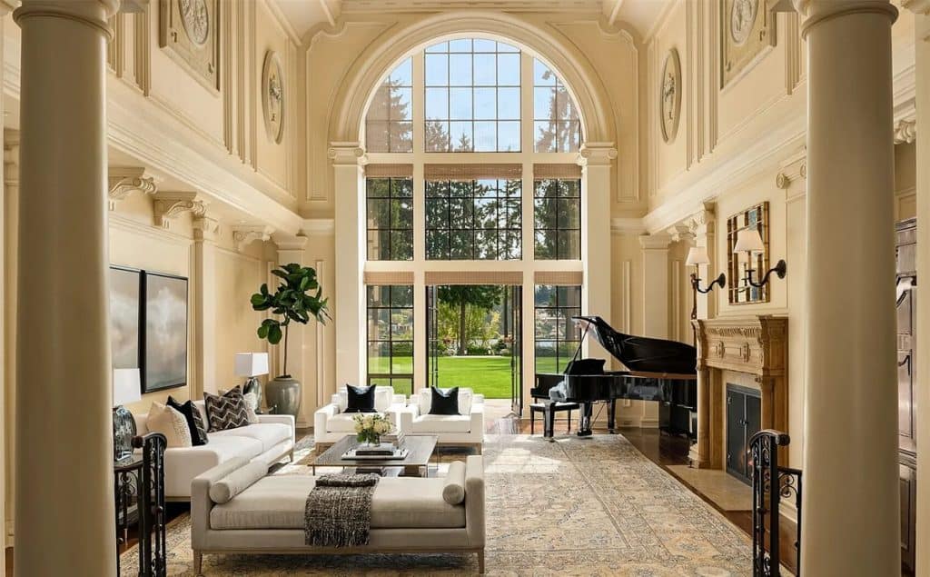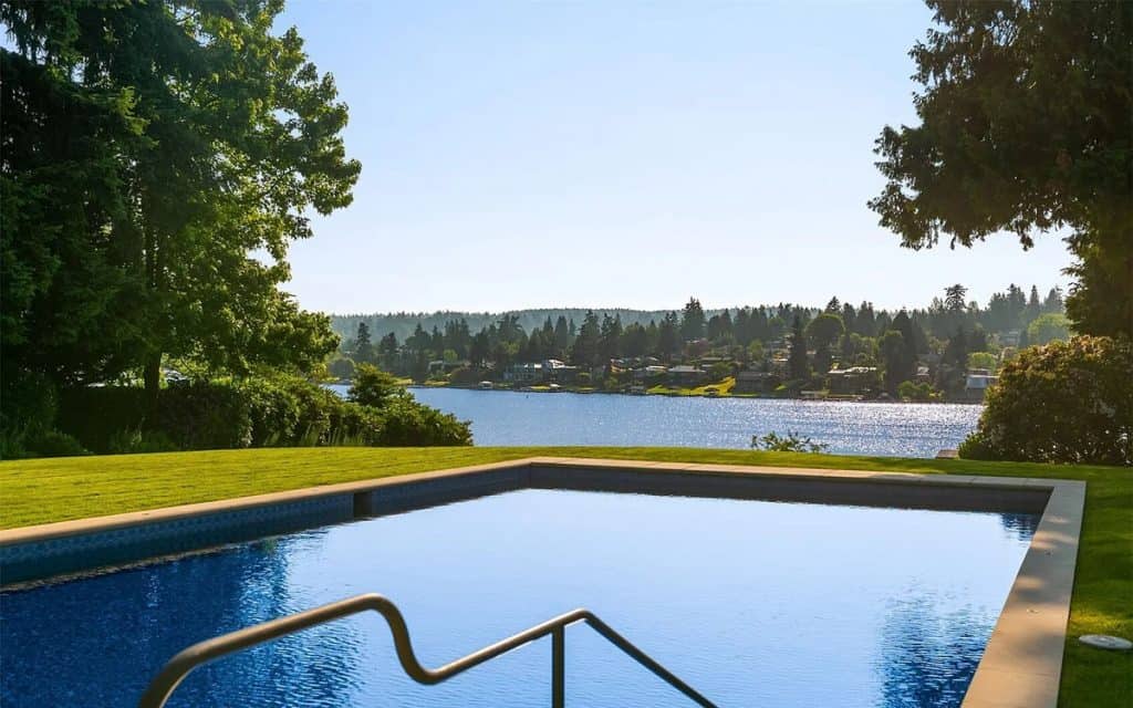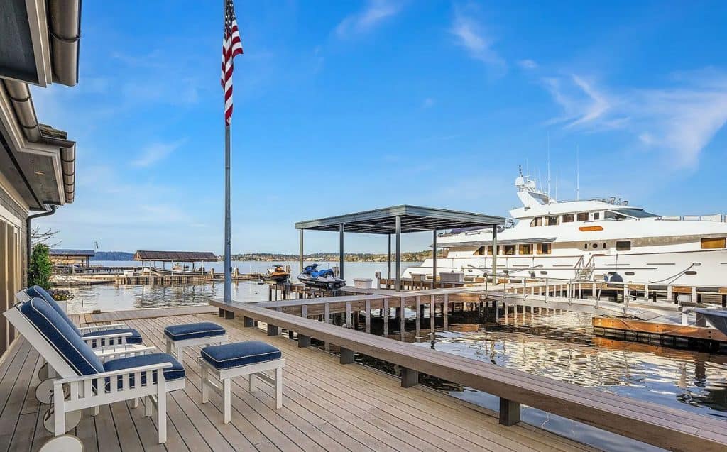 This exceptional 4.3-acre estate on Lake Washington is located in one of the most desirable waterfront communities globally. With 327 feet of shoreline, a stunning dock awaits your aquatic adventures; it can accommodate boats, a seaplane, jet skis, and a yacht over 150 feet. Summers are enjoyed at the beach, on the expansive lawn, by the pool, playing tennis, or wandering through the gardens. The beautifully designed sandstone mansion is perfect for peaceful daily living and impressive entertaining. The floor-to-ceiling black steel windows showcase the shimmering lake and verdant grounds, flooding the interiors with natural light. Featuring an in-home gym, cabana, beach house/guest cottage, and staff house, all your needs are catered to.