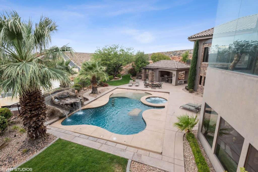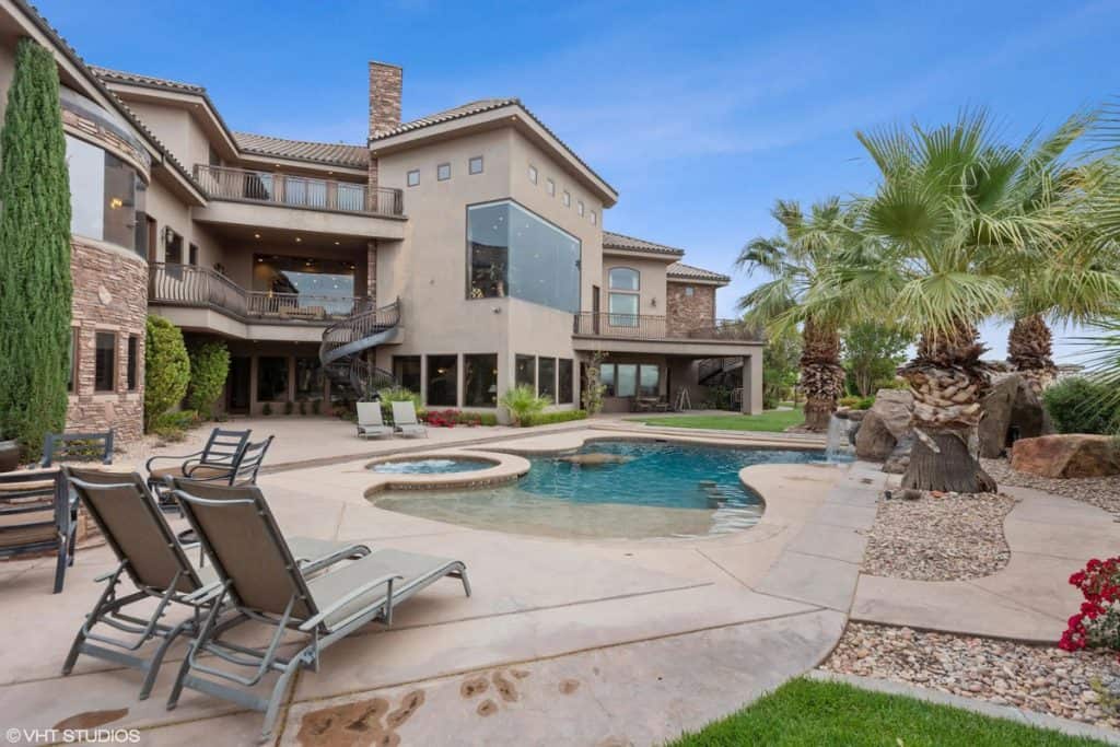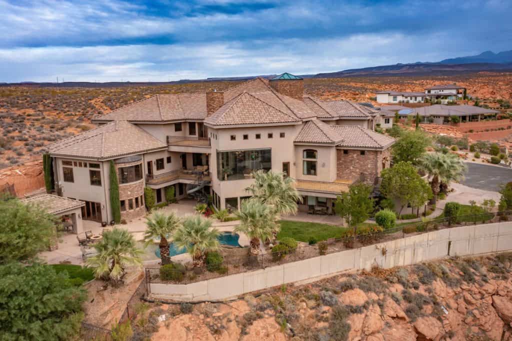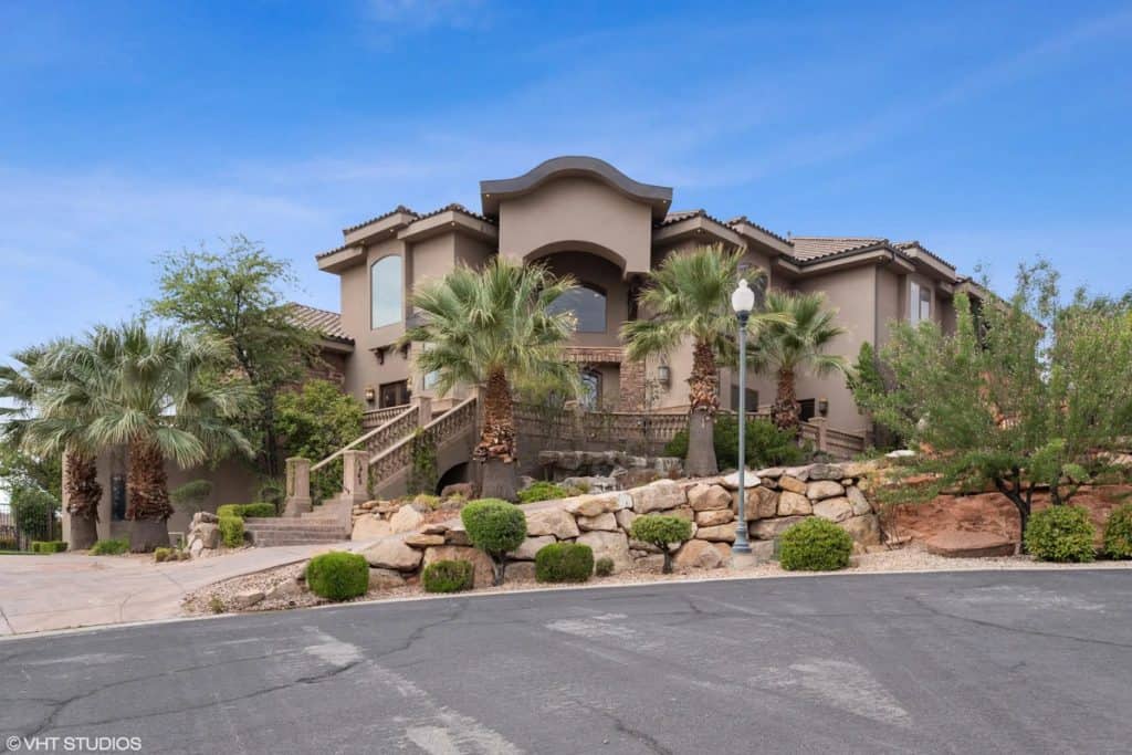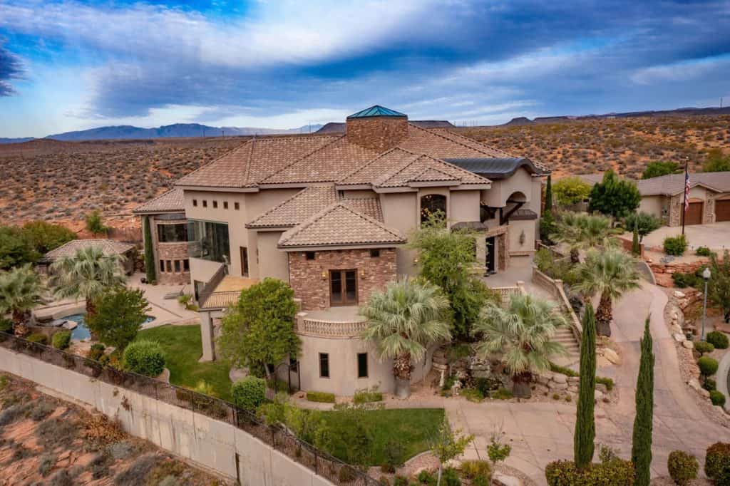 Perched on a sunny hillside in an exclusive gated community, this stunning estate boasts breathtaking views of the lush fairways of Green Springs Golf Course, the majestic stone temples of Zion National Park, and the serene blue-green hues of Pine Valley Mountain. Every detail of this home is magnificent, from the grand 30′ entryway with a skylight-lit rotunda staircase that welcomes your guests, to the luxurious resort-style pool area. No expense was spared in creating the impeccable stone and woodwork, showcasing incredible craftsmanship. Surprisingly, this ultra-luxury home is also warm, inviting, and perfect for families, with full A.D.A compliance. It goes way beyond your imagination with multiple theaters (one for the kids, another for the adults), an “arcade” featuring state-of-the-art sound and lighting, a top-notch 2-lane bowling alley, a Sports Pub, a spa, a gym, an elevator, and of course, a tropical pool and cabana to enjoy under the sun.
