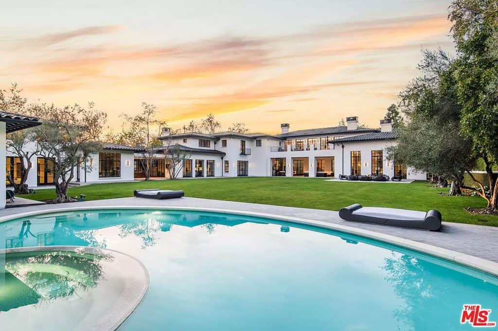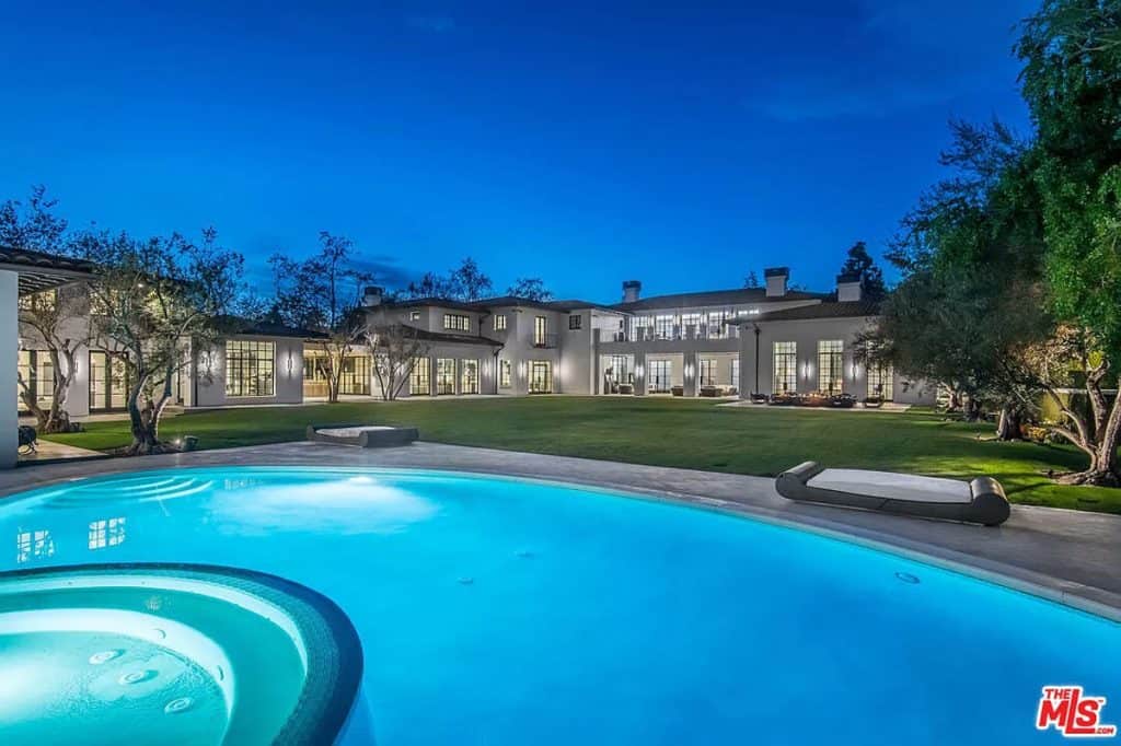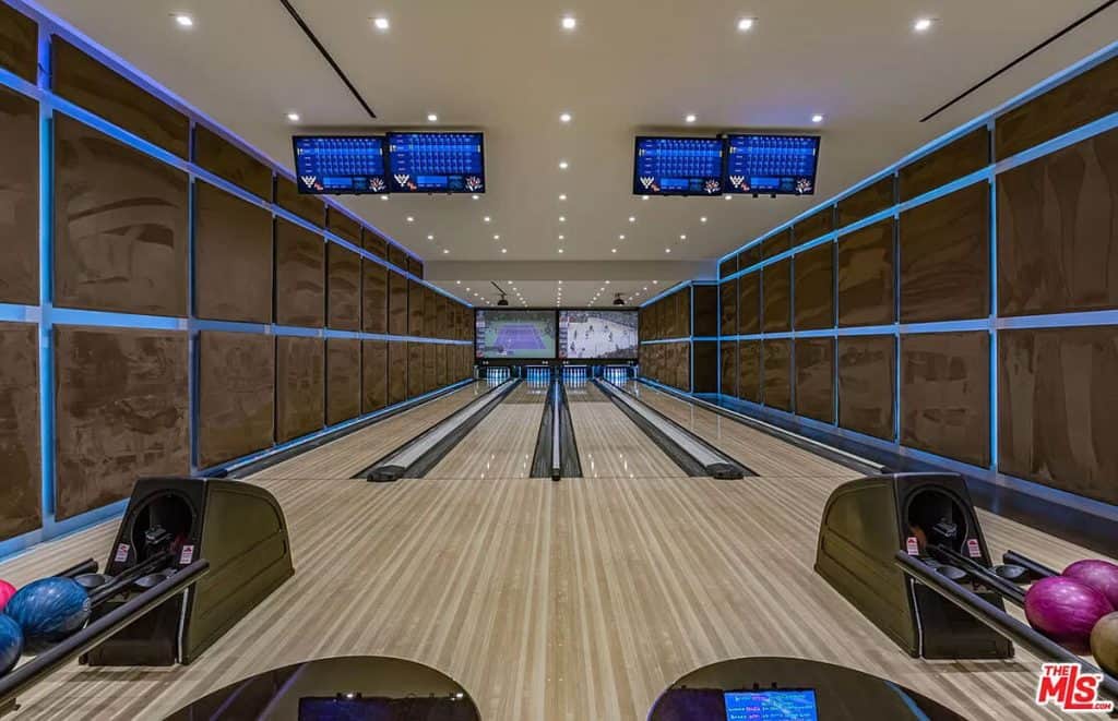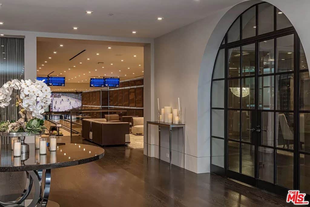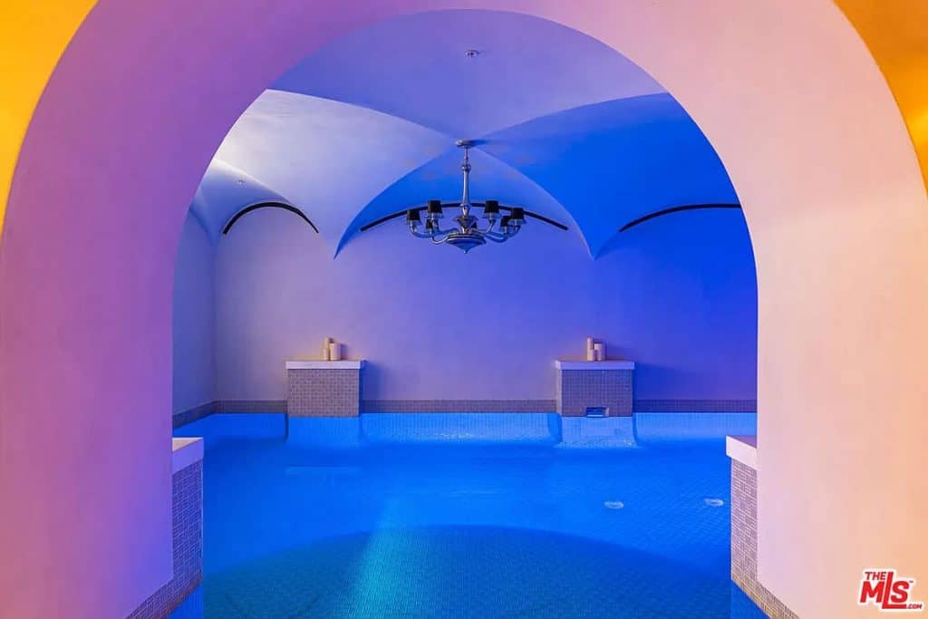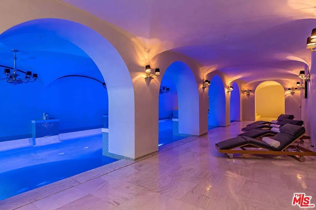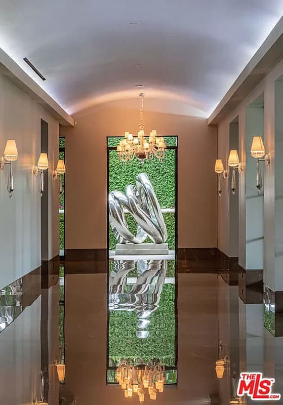 Take a look at this stunning estate situated on Billionaire’s Row, secured behind gates. It boasts a magnificent main entry hall with a guard gate, a spacious motor court, and a separate driveway for staff. Spanning over 31,000 square feet of pure luxury on approximately 1.4 flat acres, this property features beautifully proportioned rooms and expansive grounds with vast lawns. The compound is elegantly furnished by Fendi and offers an array of amenities. Enjoy a bowling alley with a game room, a well-stocked bar, a movie theater, a fully-equipped gym, a hair salon, a medical room, a golf simulator, a wine cellar with a tasting room, an indoor pool, and a complete spa with a steam shower. Additionally, there is a two-bedroom guesthouse, an outdoor kitchen, and a cabana equipped with misters to keep you cool under the Southern California sun. The main house includes a grand master suite with his and hers bathrooms, oversized closets, an elevator, and a lovely terrace that overlooks the lush grounds and a luxurious pool cabana area complete with fountains.