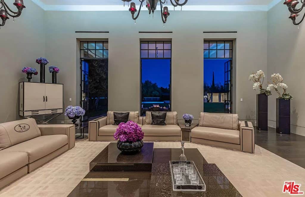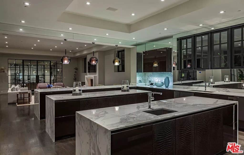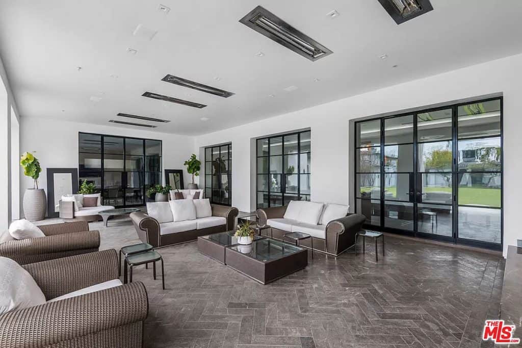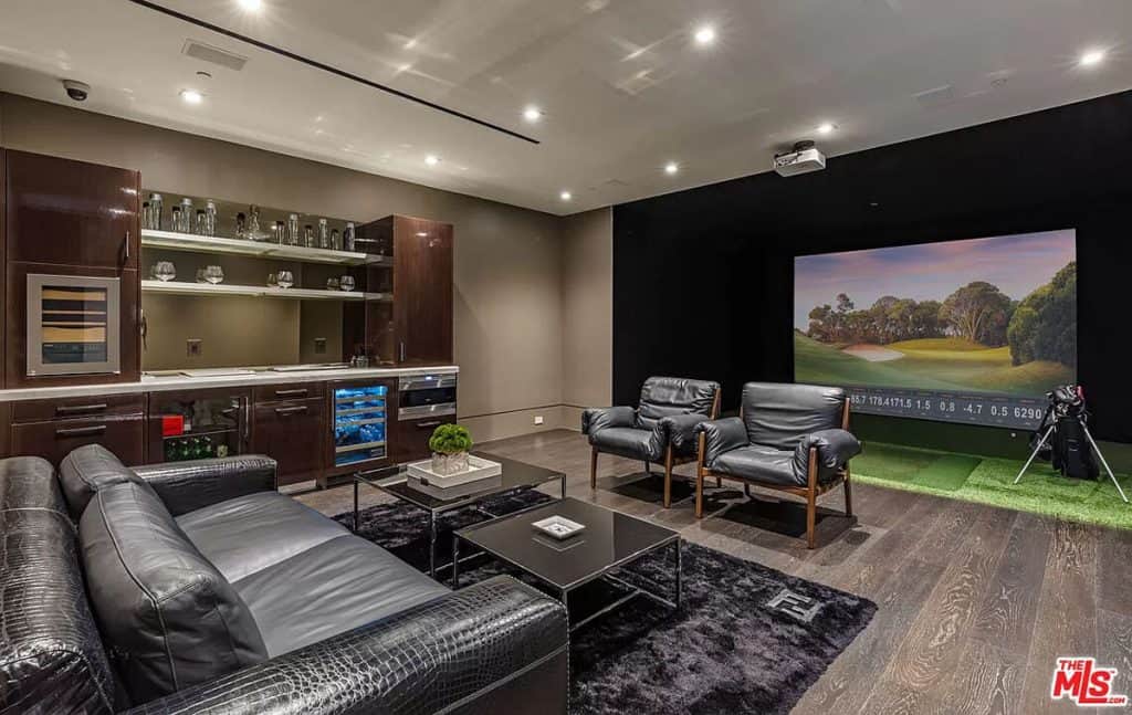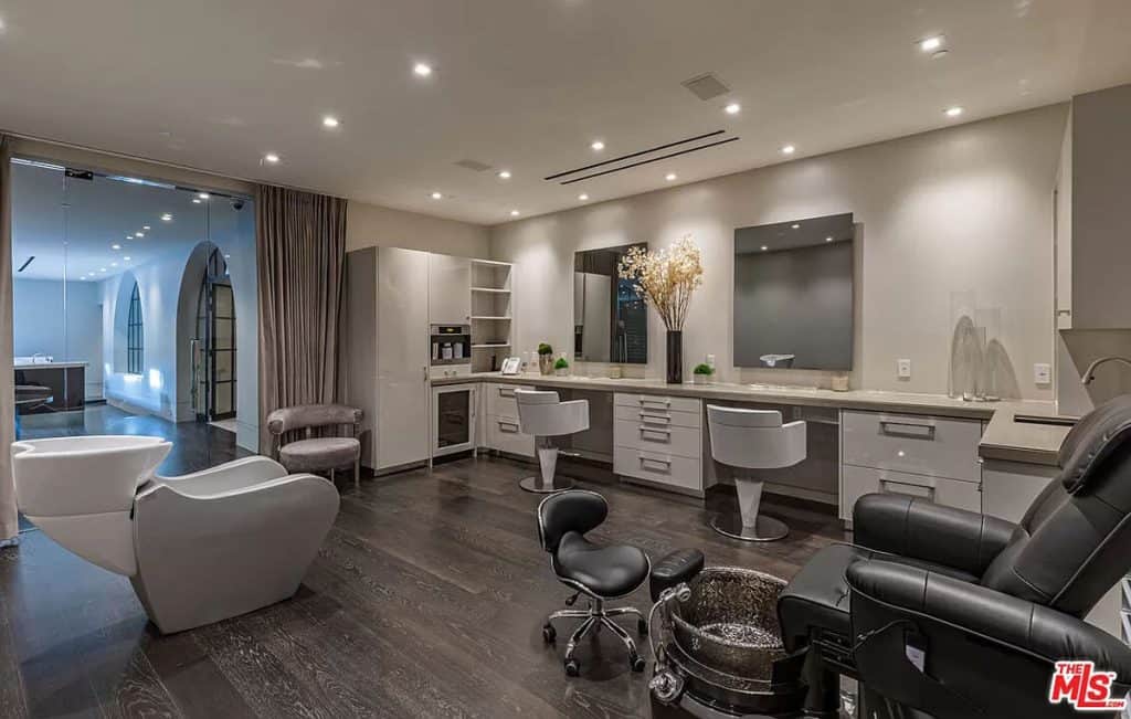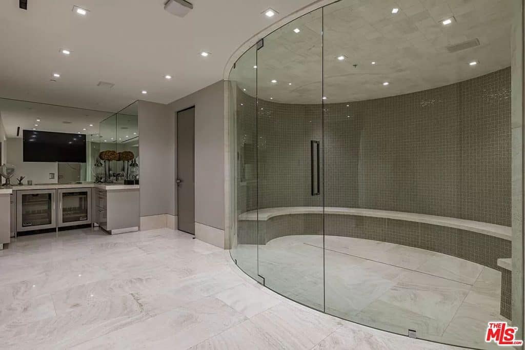 Take a look at this stunning estate situated on Billionaire’s Row, secured behind gates. It boasts a magnificent main entry hall with a guard gate, a spacious motor court, and a separate driveway for staff. Spanning over 31,000 square feet of pure luxury on approximately 1.4 flat acres, this property features beautifully proportioned rooms and expansive grounds with vast lawns. The compound is elegantly furnished by Fendi and offers an array of amenities. Enjoy a bowling alley with a game room, a well-stocked bar, a movie theater, a fully-equipped gym, a hair salon, a medical room, a golf simulator, a wine cellar with a tasting room, an indoor pool, and a complete spa with a steam shower. Additionally, there is a two-bedroom guesthouse, an outdoor kitchen, and a cabana equipped with misters to keep you cool under the Southern California sun. The main house includes a grand master suite with his and hers bathrooms, oversized closets, an elevator, and a lovely terrace that overlooks the lush grounds and a luxurious pool cabana area complete with fountains.