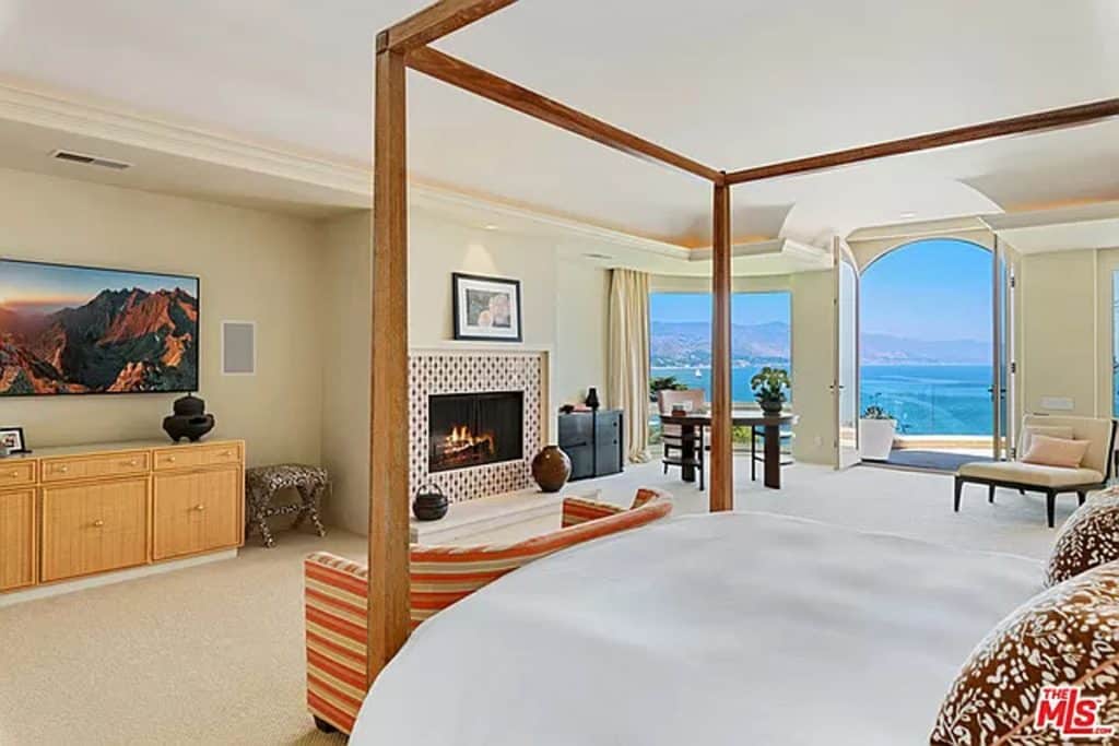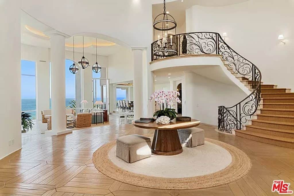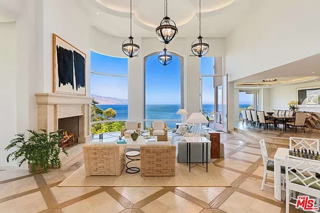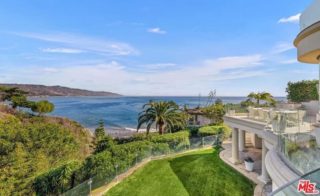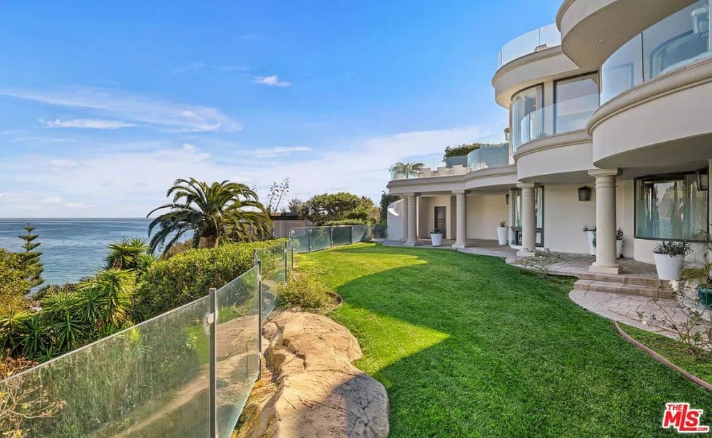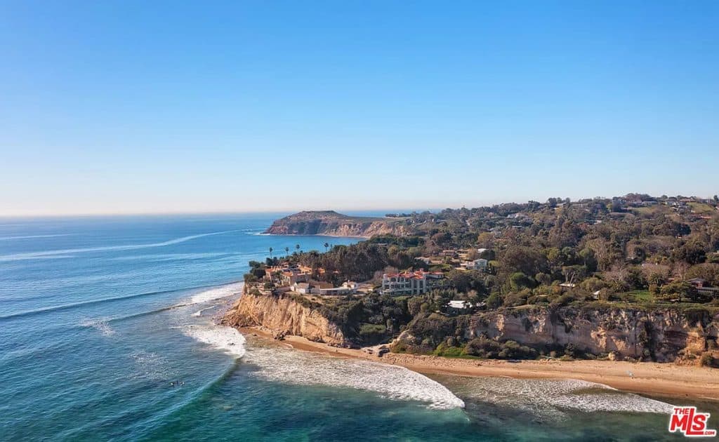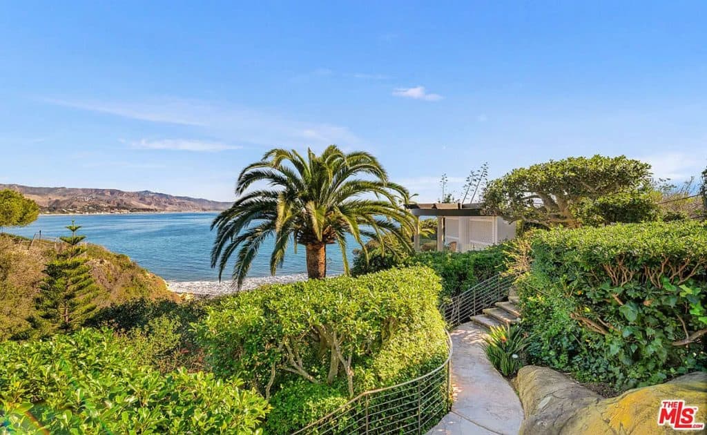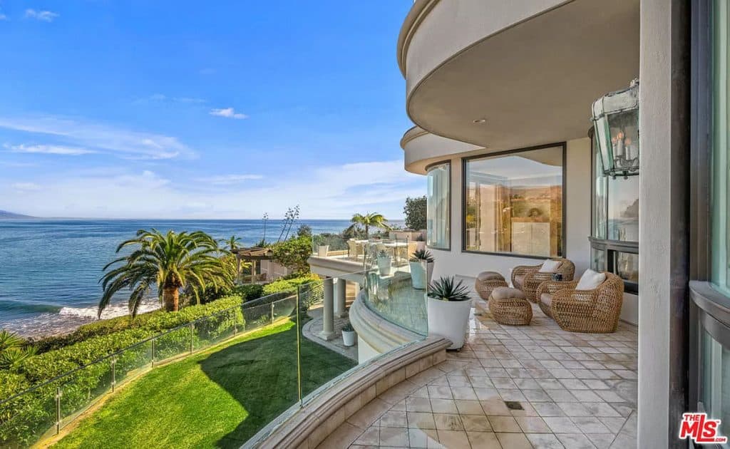 This luxurious estate on Point Dume bluff boasts stunning ocean, whitewater, and coastline views. The grand residence features parklike grounds, a private path to the beach, and multiple surf breaks. With three levels of living space, including an elevator, high ceilings, curved windows, fireplaces, and hardwood floors, this home is perfect for entertaining. The circular drive, lush landscaping, and resort-style porte-cochre welcome guests. Inside, a grand circular foyer leads to a living room with a fireplace and ocean views. The chef’s kitchen has top-of-the-line appliances and a walk-in pantry. The main floor also includes a guest bedroom, office, and powder rooms. Upstairs, the owner’s suite offers stunning views, a fireplace, and a marble spa.
