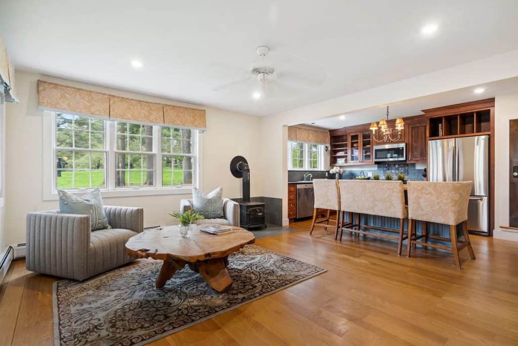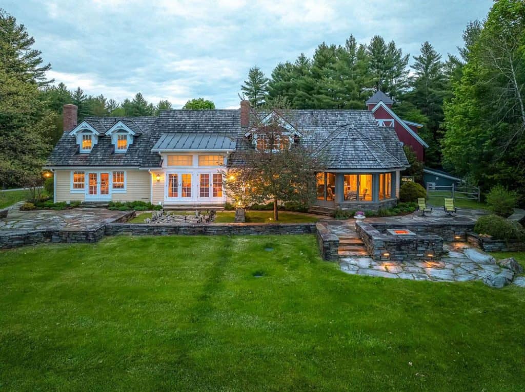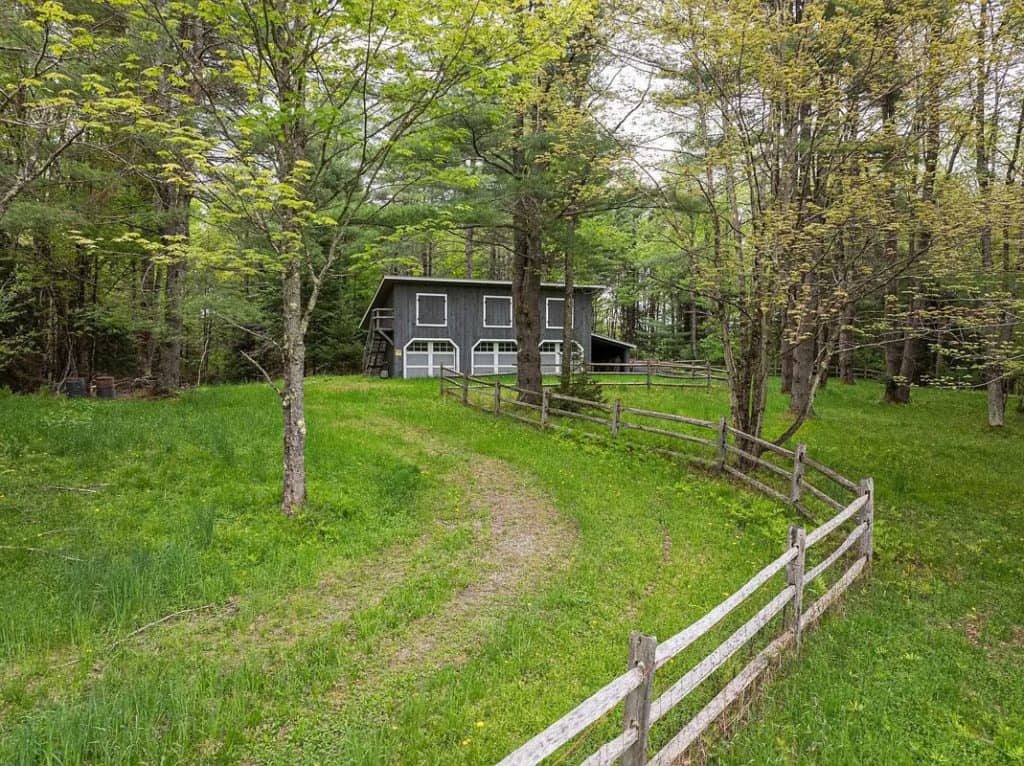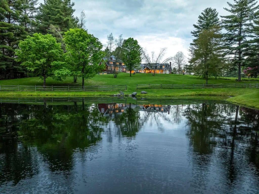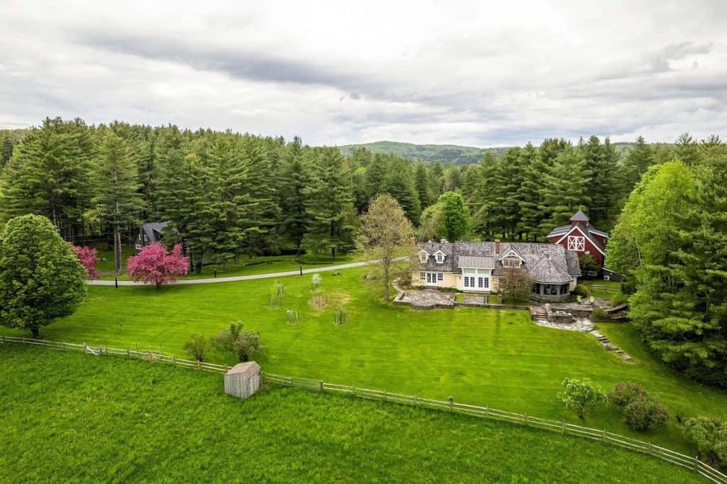 A beautiful Gentleman’s Farm situated on 28 acres of picturesque Vermont scenery. Beyond its gates, you’ll find rolling hills and secluded views with direct access to Sterling Brook. Step into this elegant home to enjoy exquisite custom workmanship, from renovated windows to unique iron railings. The Chef’s kitchen features custom cabinets, top-of-the-line appliances, and a spacious island, ideal for hosting guests. A farmhouse-style dining area with a fireplace and a second kitchen add to the atmosphere. Relax and unwind in the 3-season room with vaulted wood ceilings and a vented gas grill, or gather in the library by the fireplace. The East wing boasts a primary suite with a walk-in closet, Carrera Marble bathroom, steam shower, and soaking tub. The other bedrooms have ensuite bathrooms and large closets, including the tree house suite with its own living space and observatory. The lower level offers a game room and entertainment area.