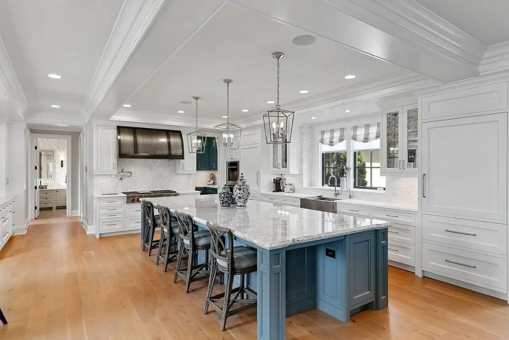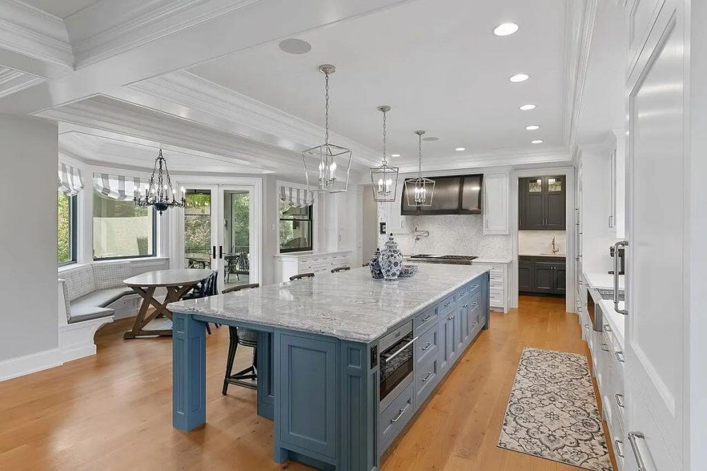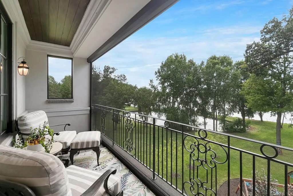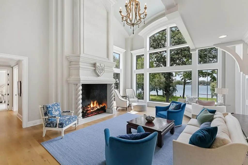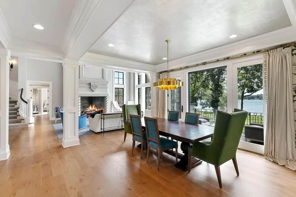 The spacious, open floor plan boasts floor-to-ceiling windows that reveal breathtaking water views across 190 feet of lakeshore. The gourmet kitchen includes both formal and informal dining areas, top-of-the-line appliances, a prep pantry, and leads to a screened-in porch. The primary suite is equipped with a fireplace, a private screened-in porch, a luxurious spa-like bathroom with heated floors, and a beverage/coffee bar. Furthermore, the upper level features four junior suites, a bonus room, a library, and access to the rooftop deck that provides sweeping views of the lake! The walkout lower level is designed for entertaining, complete with a recreational area, wet bar, wine cellar, exercise room, sports court, and a movie theater! Additional highlights include a main-level guest suite with a fireplace, an elevator servicing all three levels, and a heated four-car garage.