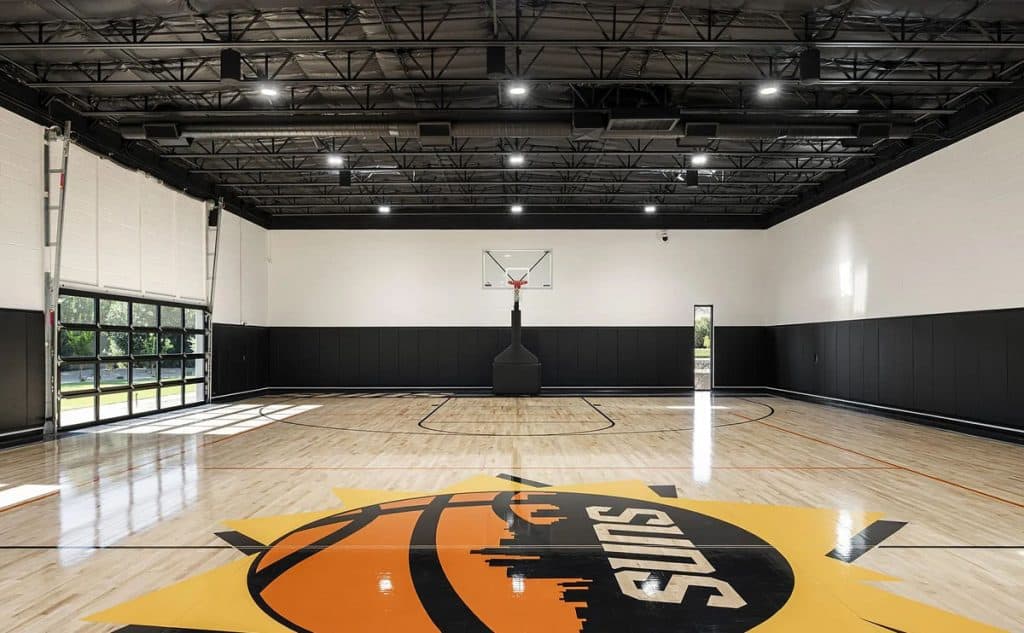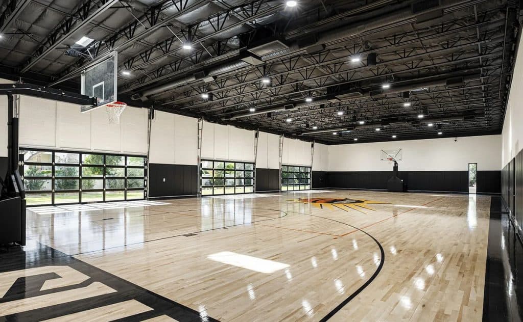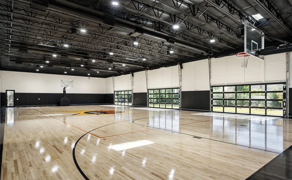 Continuing down the hallway from the wet bar, you can step into the indoor basketball court, a full-size, professional-grade arena featuring shiny hardwood floors, high ceilings, and stadium-style lighting that creates an atmosphere reminiscent of a professional stadium. Adjacent to the court, a door opens directly into the wellness center, a comprehensive recovery area equipped with a red-light sauna, steam room, and cold plunge.