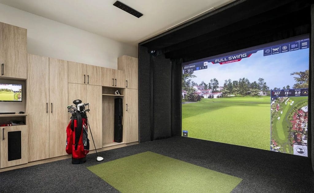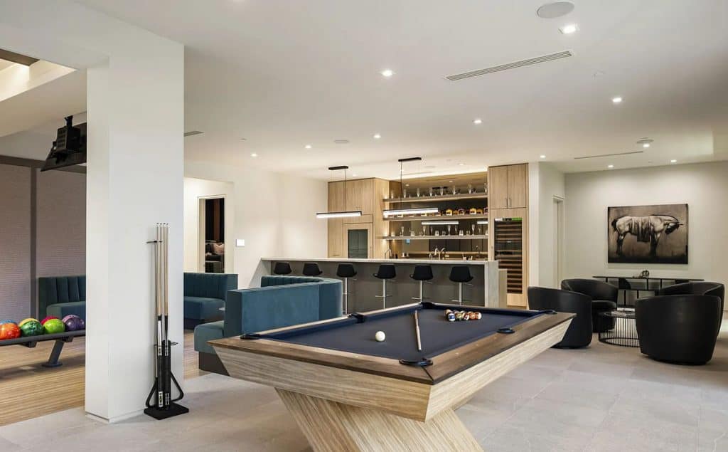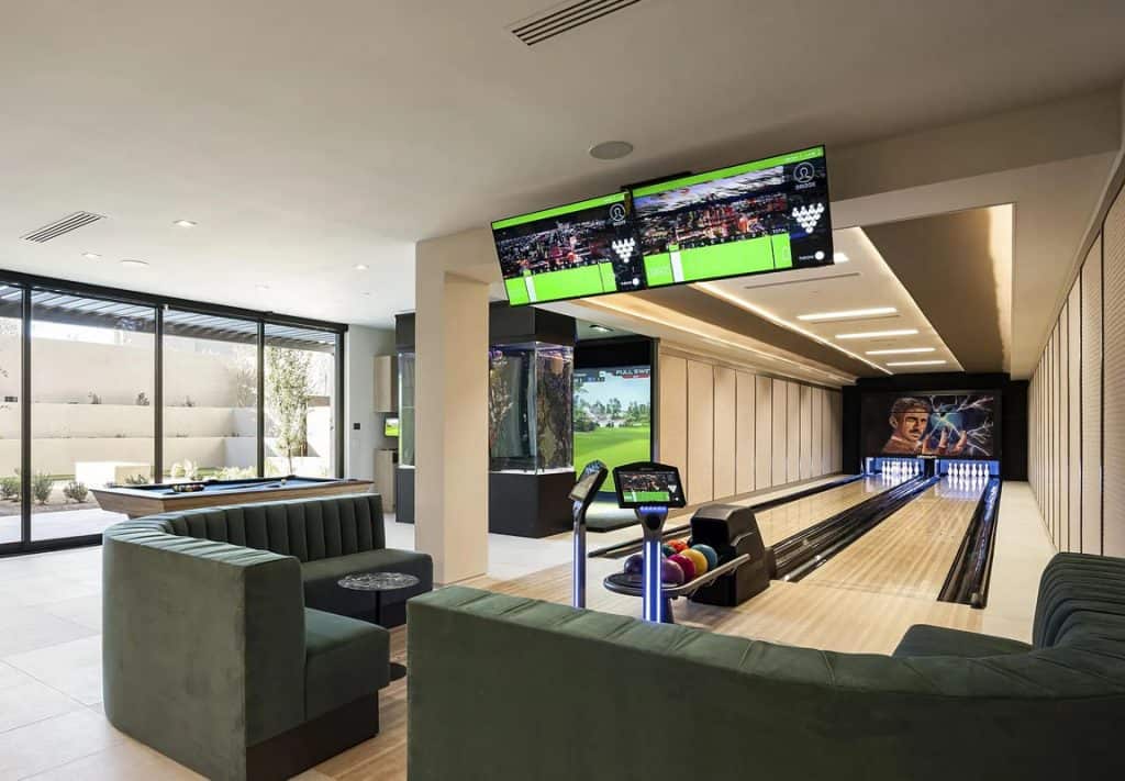 The basement boasts a fully equipped two-lane bowling alley, featuring an automatic ball return, a machine that cleans and oils the lanes, dual screens positioned above the lanes, and plenty of seating, all designed to recreate the feel of a commercial bowling alley while providing a more comfortable and private luxury atmosphere.