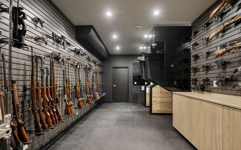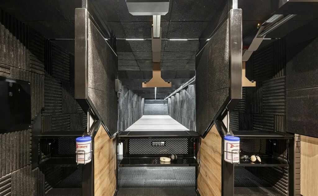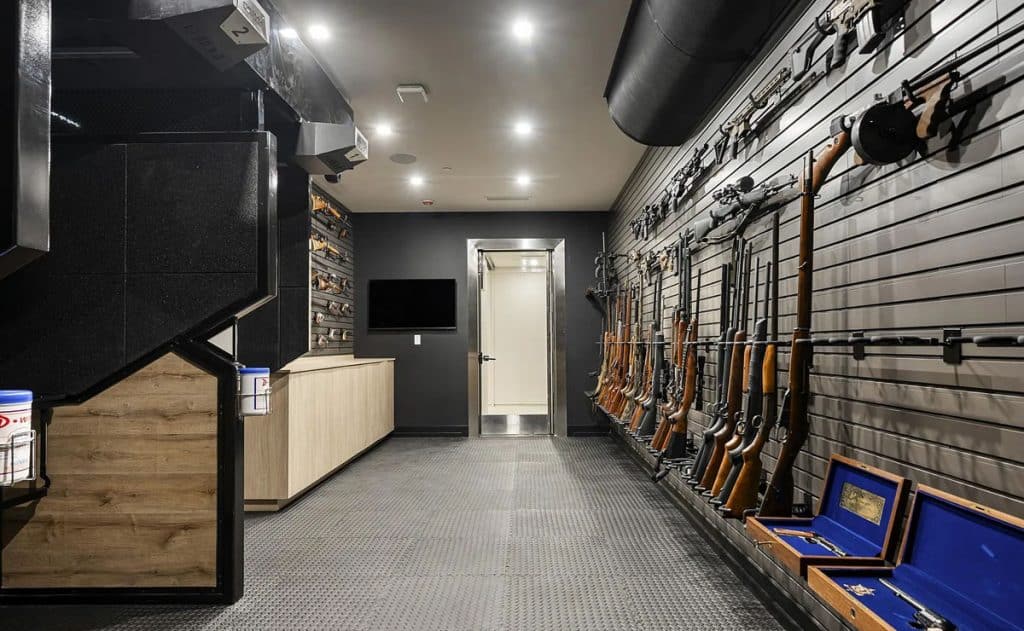 From the same hallway that leads to the basketball court, beautifully illuminated stairs lead down to the basement, where the space truly comes to life. A three-lane shooting range is ready for use, complete with a hospital-grade air purifier, ensuring a safe and clean environment that can even be transformed into a cigar lounge.
