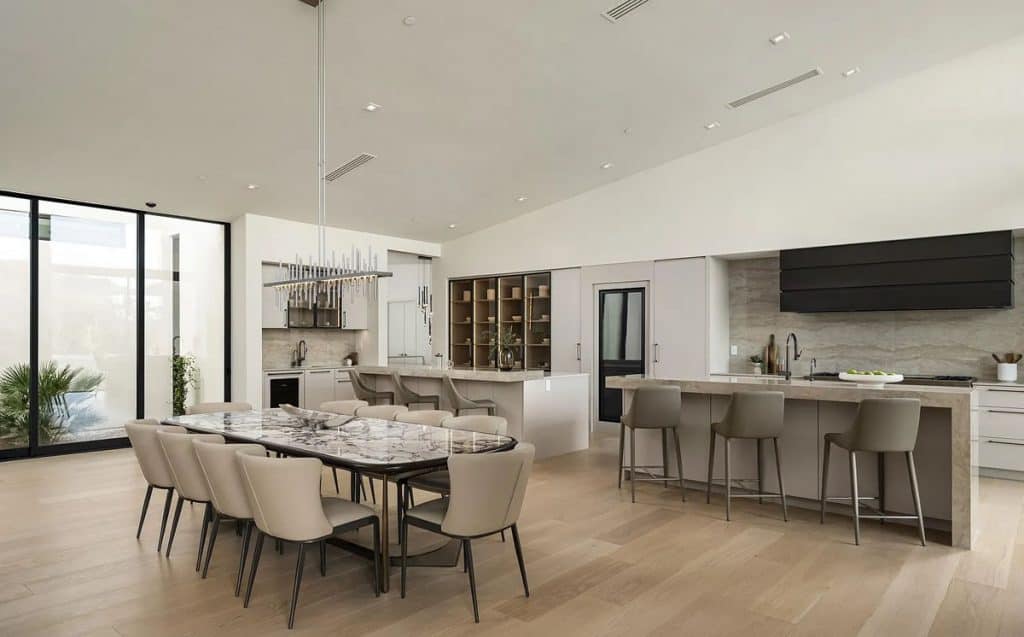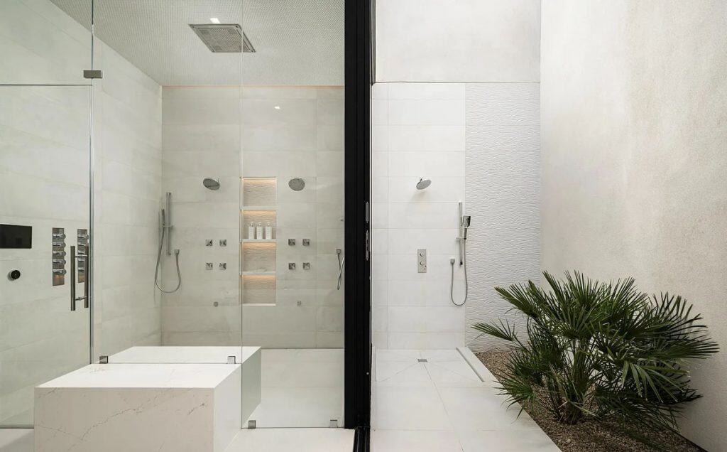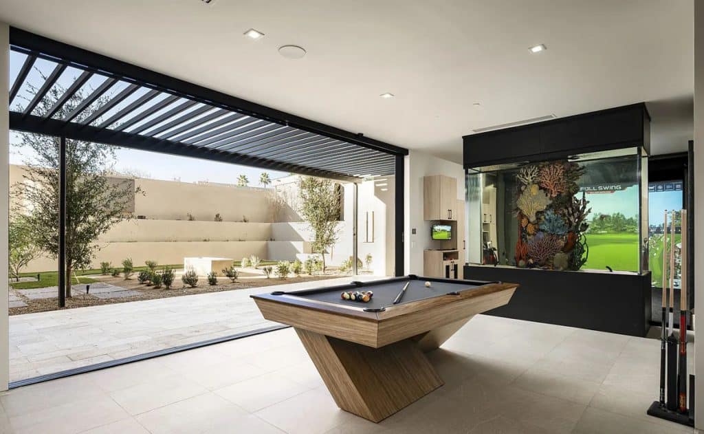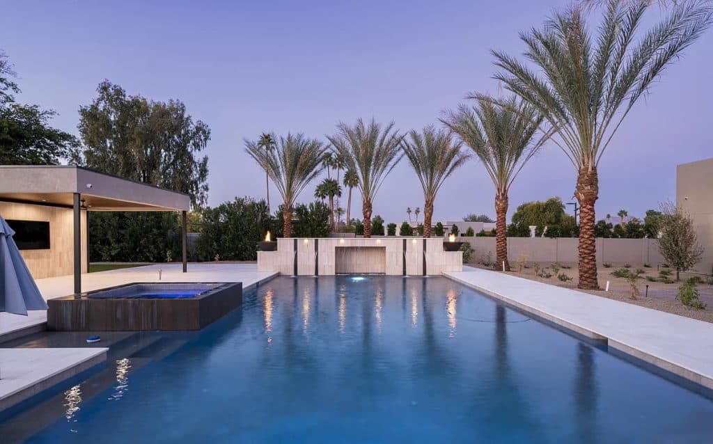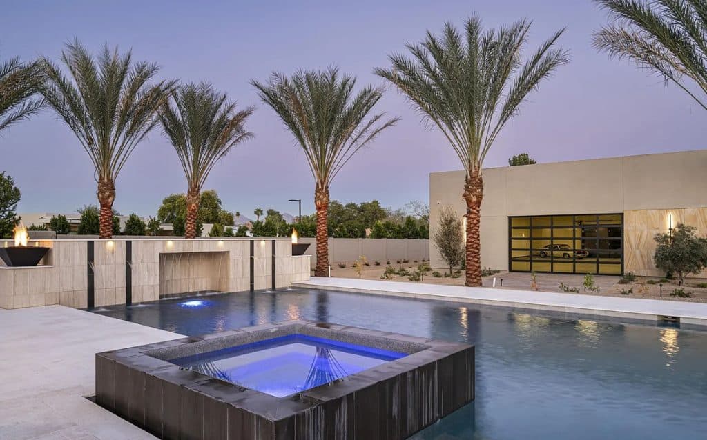 Stepping outside, you’ll find a vast, shimmering pool that caters to both relaxation and entertainment. An infinity-edge spa merges beautifully with the water, while a stunning grotto enhances the resort-like atmosphere.