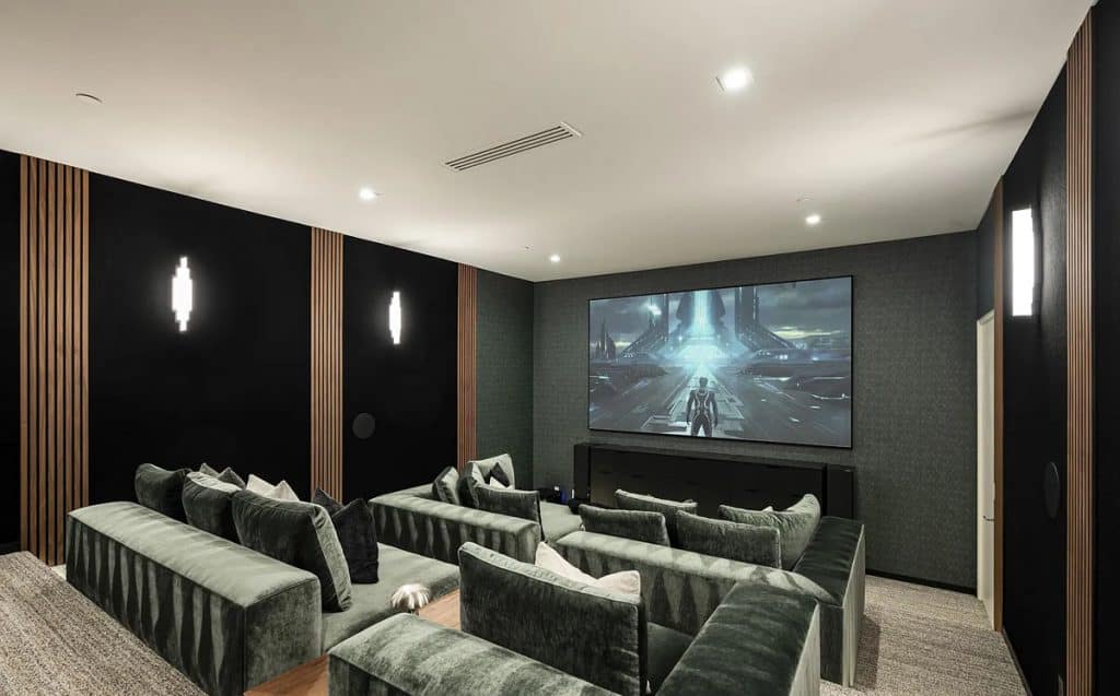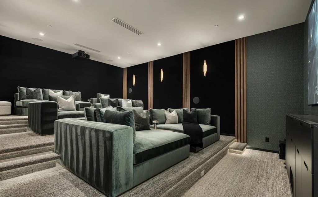 The 12-seat theater room offers a genuine cinematic experience, complete with Dolby surround sound.