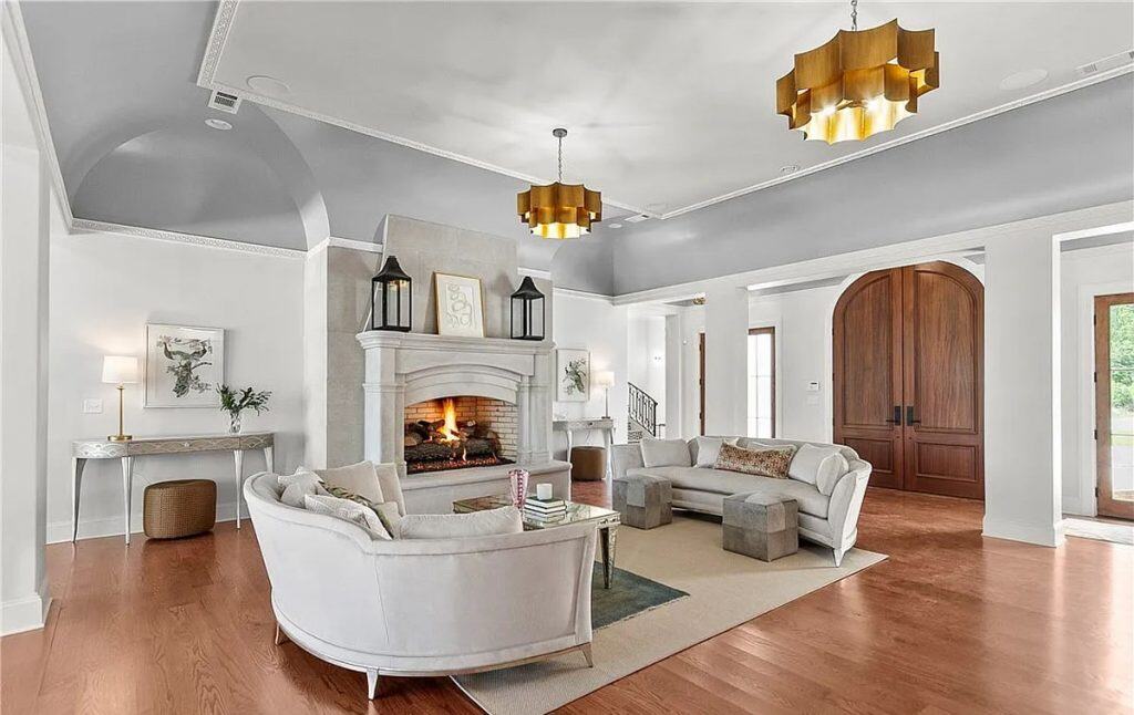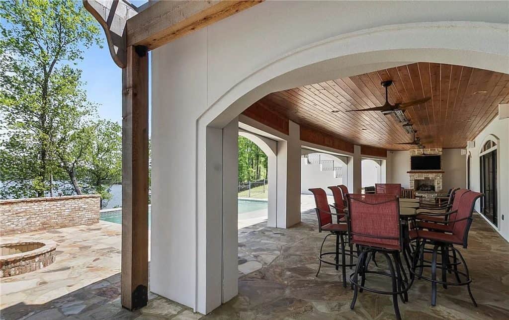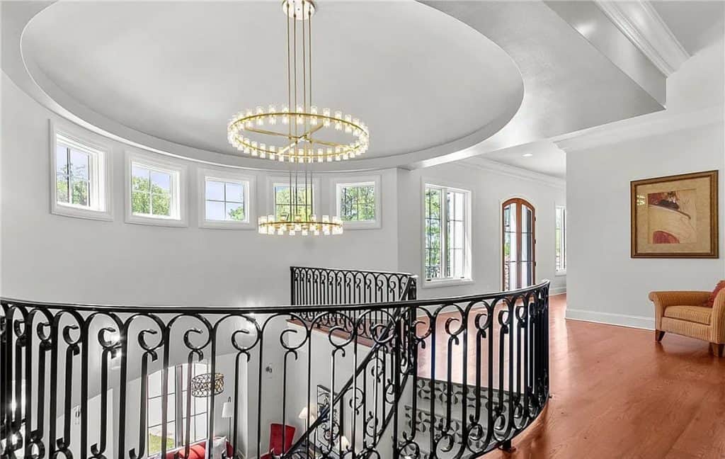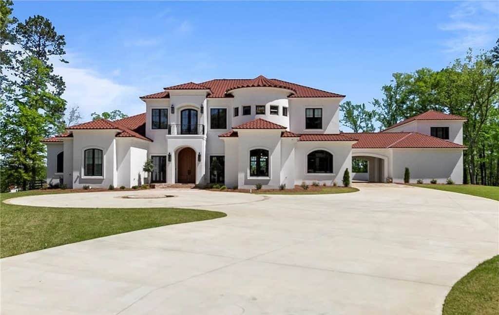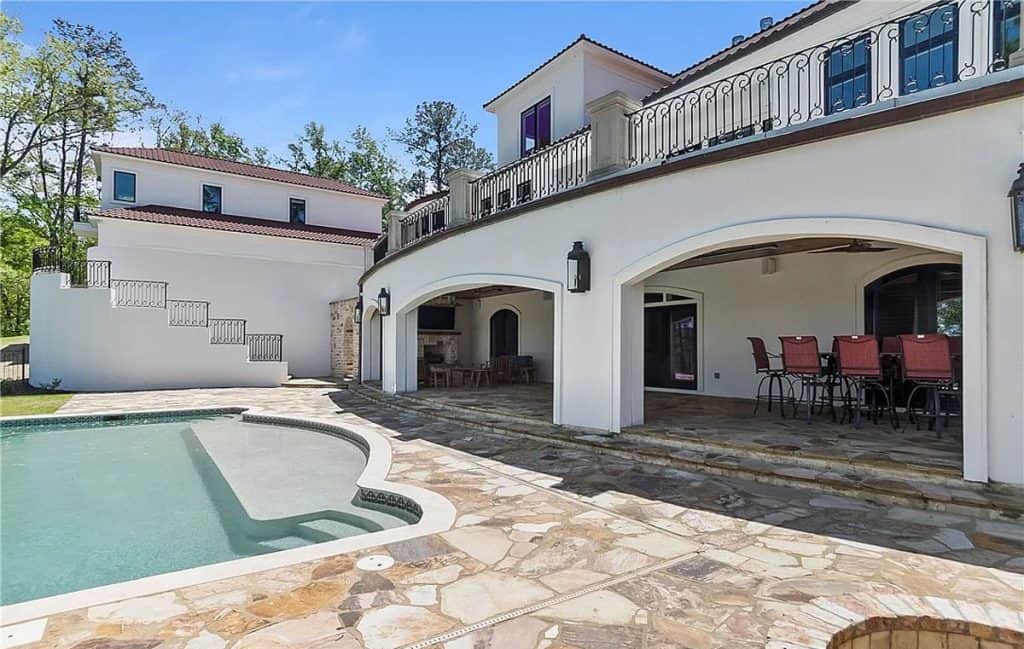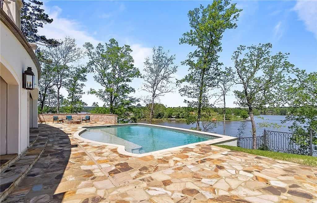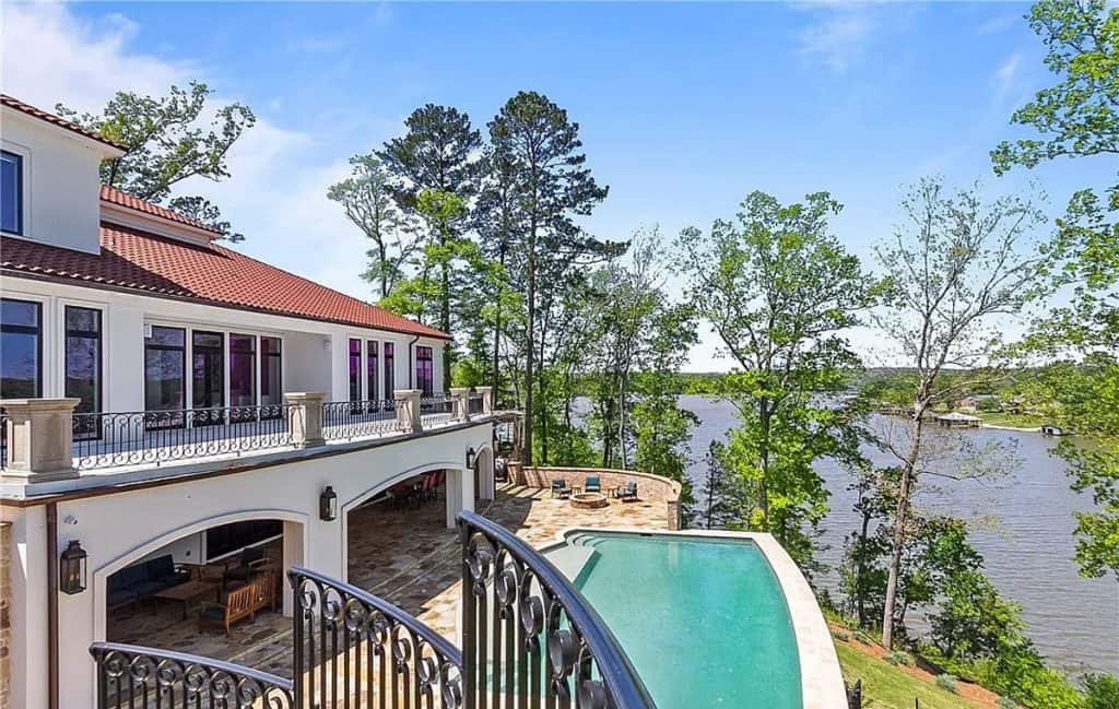 Exquisite crown molding, custom tile designs, and elegant finishes showcase timeless artistry. Revel in the generous living spaces, a formal dining area, and a cozy breakfast nook crafted for both comfort and style. The opulent primary suite features a his and hers bathroom complete with spa-like amenities. An elevator ensures effortless movement between all levels. Step outside to unwind by the shimmering saltwater pool, enveloped by lush greenery and stunning lake vistas. A beautifully appointed guest house above the garage reflects the main residence’s sophistication. The total square footage includes the guest house.
