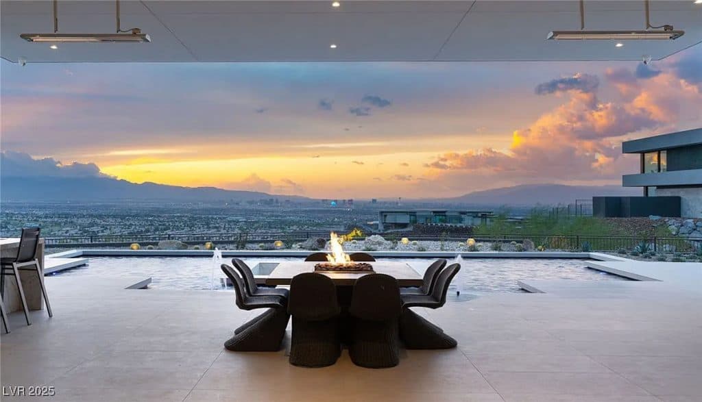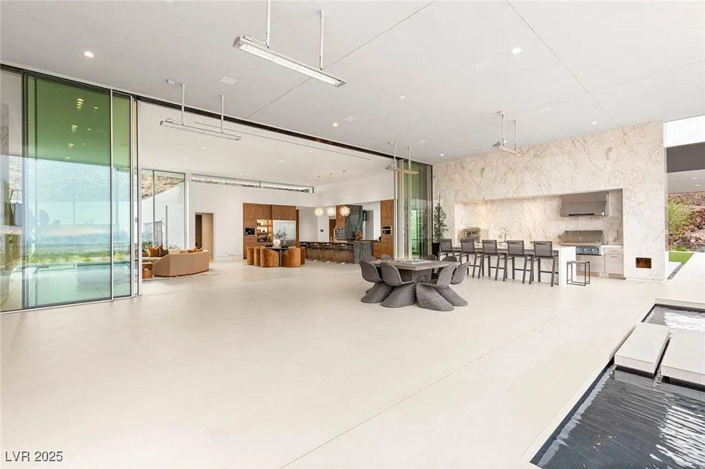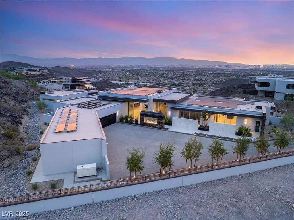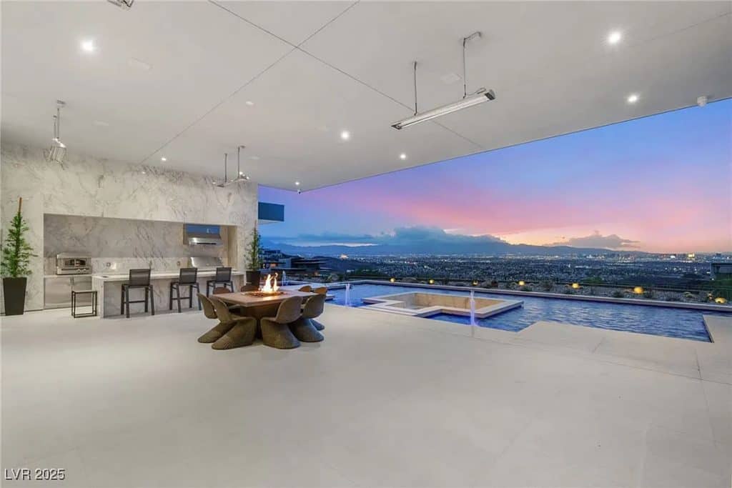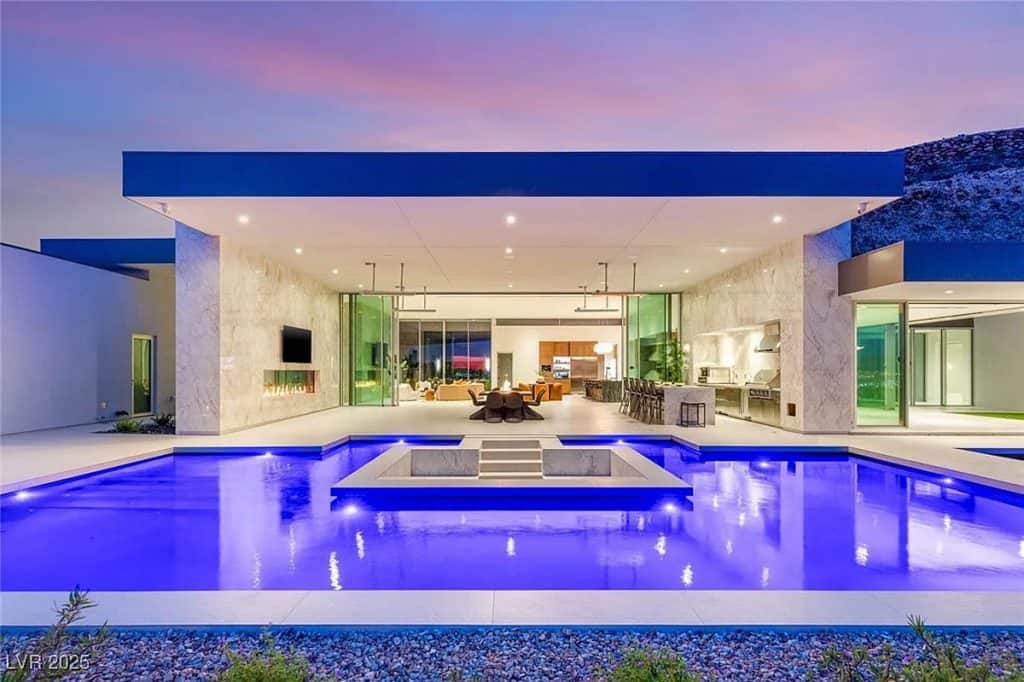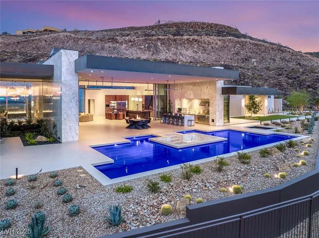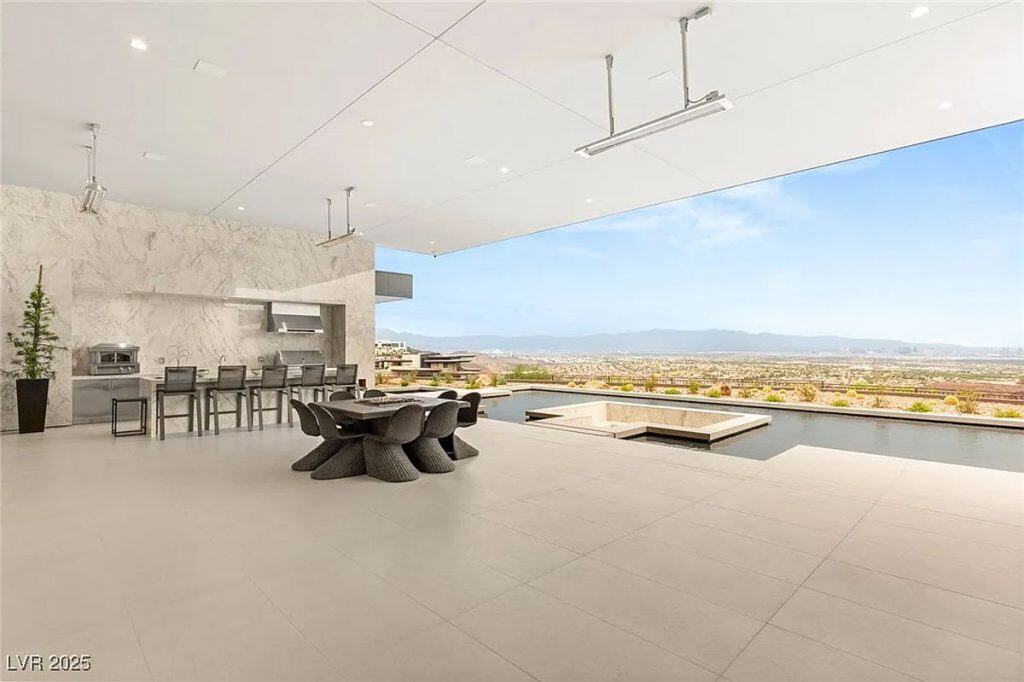 Brand new and never occupied, this stylish mansion features a private elevator leading to a theater, bar, and guest suite on the upper level, while all primary living spaces and bedrooms are gracefully situated on the ground floor. Flames flicker throughout—from the floating glass courtyard fireplace to the dual marble-surround fireplaces that adorn the great room and patio, as well as the firepits at the pool’s sunken lounge and outside the primary suite’s secluded retreat. Towering glass walls disappear to reveal breathtaking views of the Strip, mountains, and cityscape. The lavish primary suite captivates with expansive vistas, an indoor-outdoor shower, and a boutique-style closet. A resort-style pool, spa, outdoor kitchen, extravagant patios, and a 6-car gallery garage round out this architectural masterpiece.