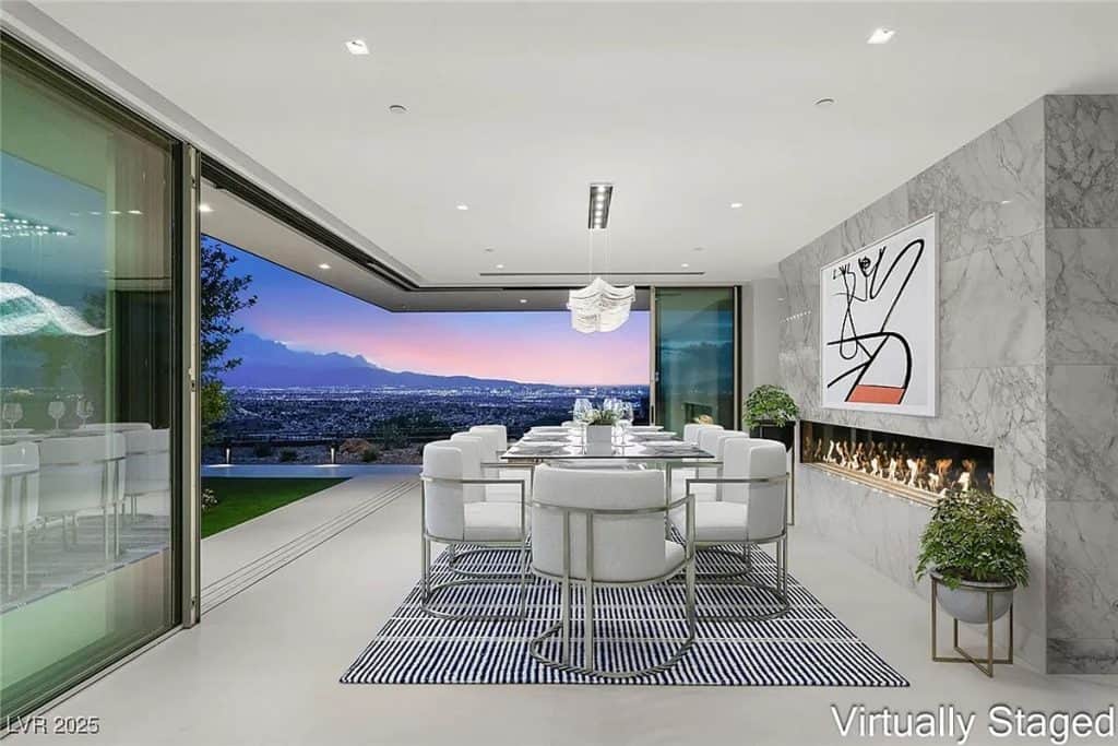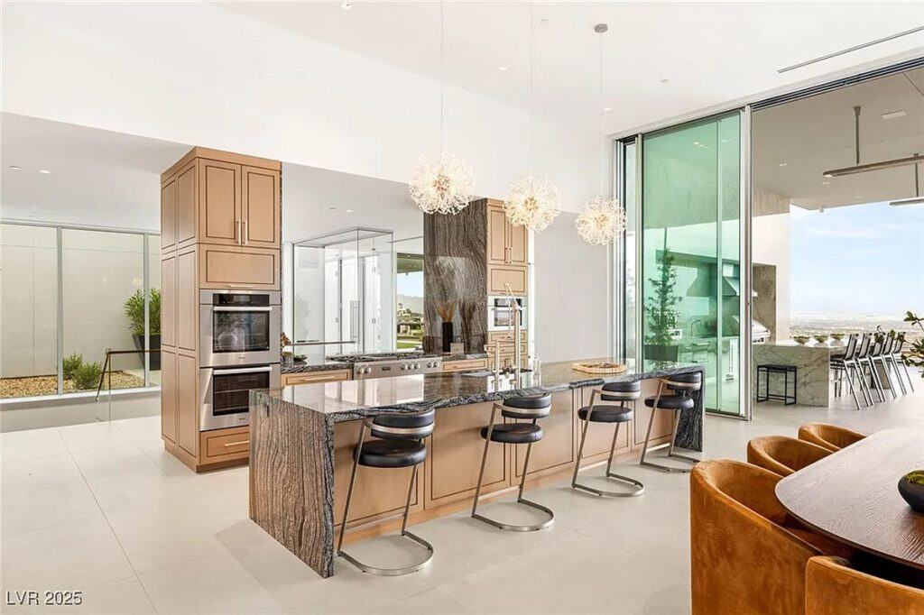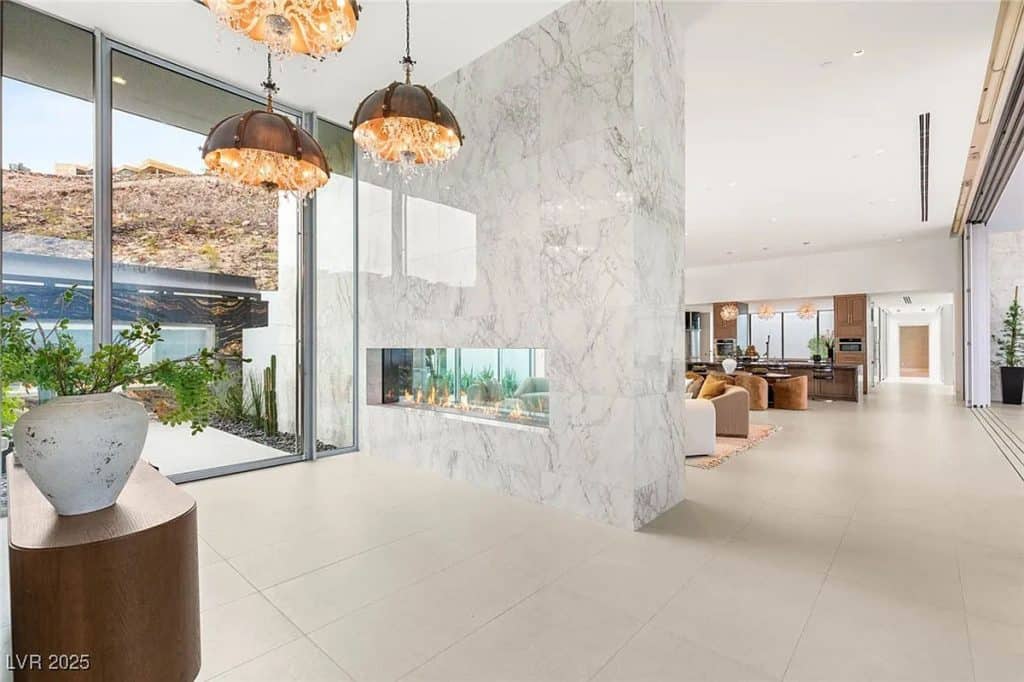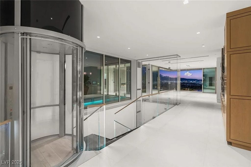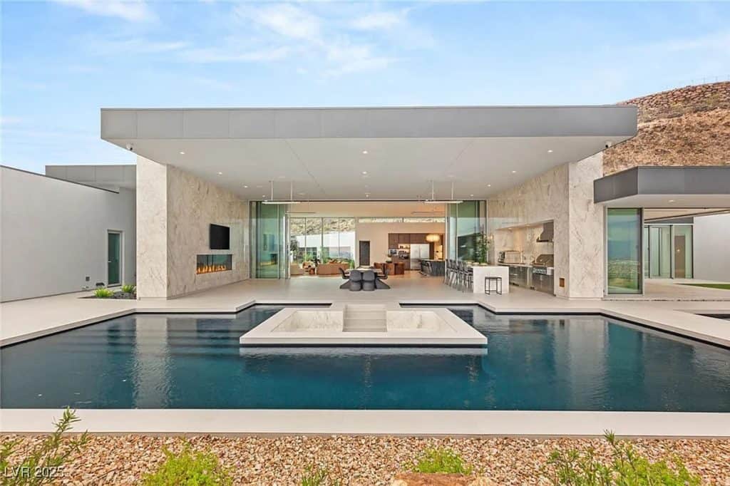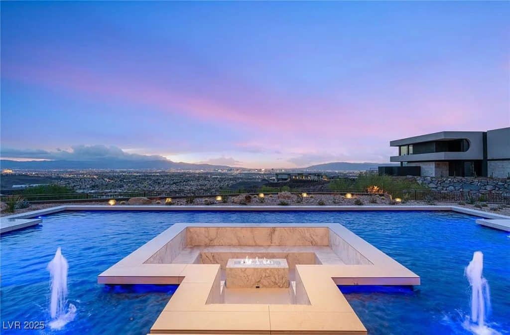 Brand new and never occupied, this stylish mansion features a private elevator leading to a theater, bar, and guest suite on the upper level, while all primary living spaces and bedrooms are gracefully situated on the ground floor. Flames flicker throughout—from the floating glass courtyard fireplace to the dual marble-surround fireplaces that adorn the great room and patio, as well as the firepits at the pool’s sunken lounge and outside the primary suite’s secluded retreat. Towering glass walls disappear to reveal breathtaking views of the Strip, mountains, and cityscape. The lavish primary suite captivates with expansive vistas, an indoor-outdoor shower, and a boutique-style closet. A resort-style pool, spa, outdoor kitchen, extravagant patios, and a 6-car gallery garage round out this architectural masterpiece.