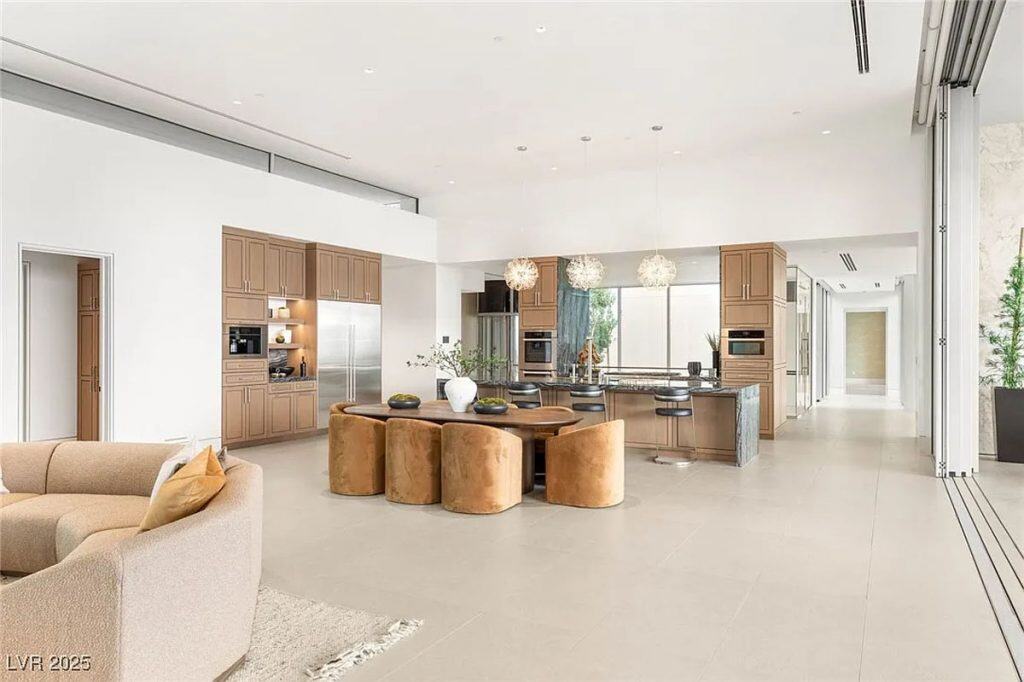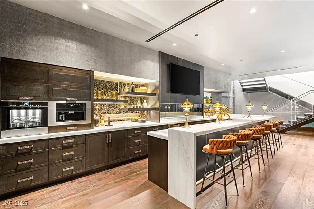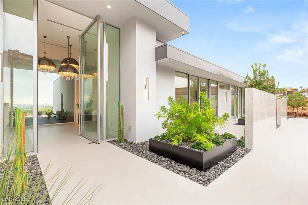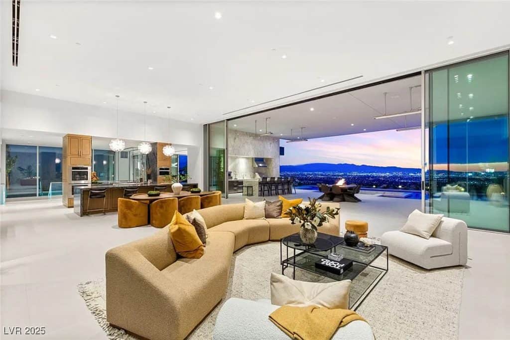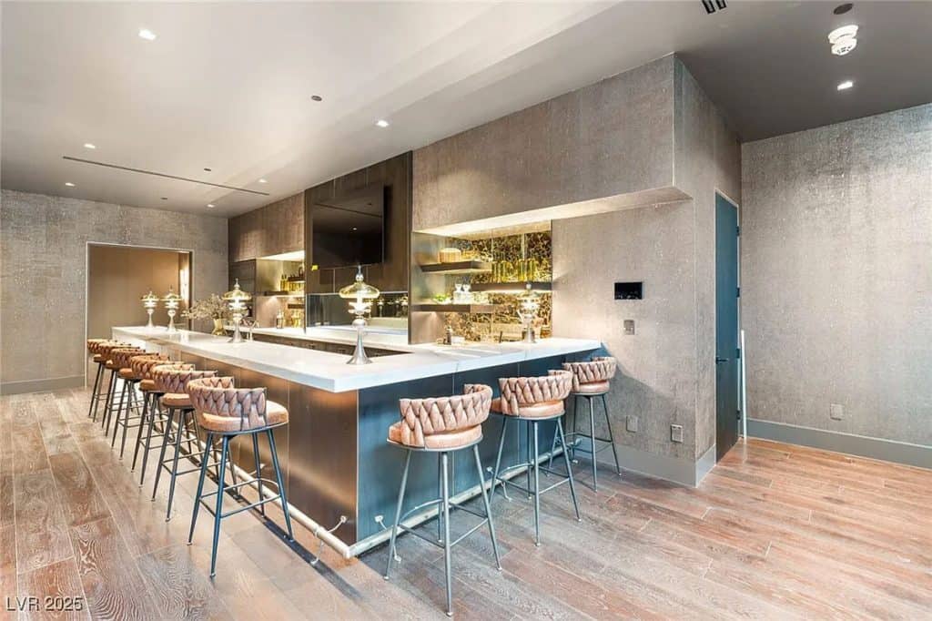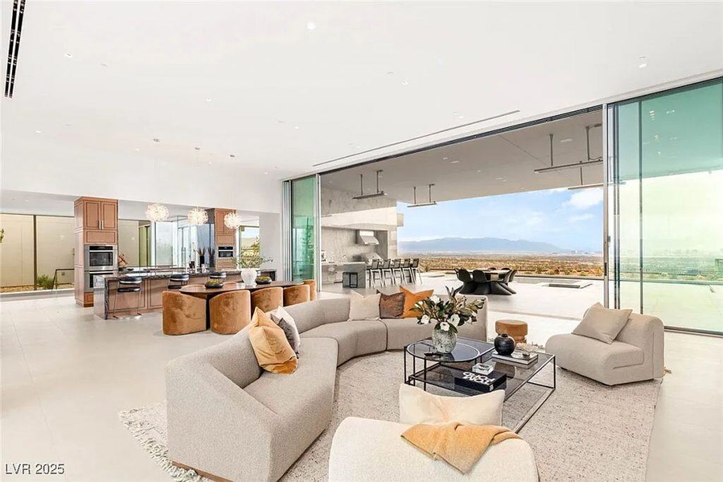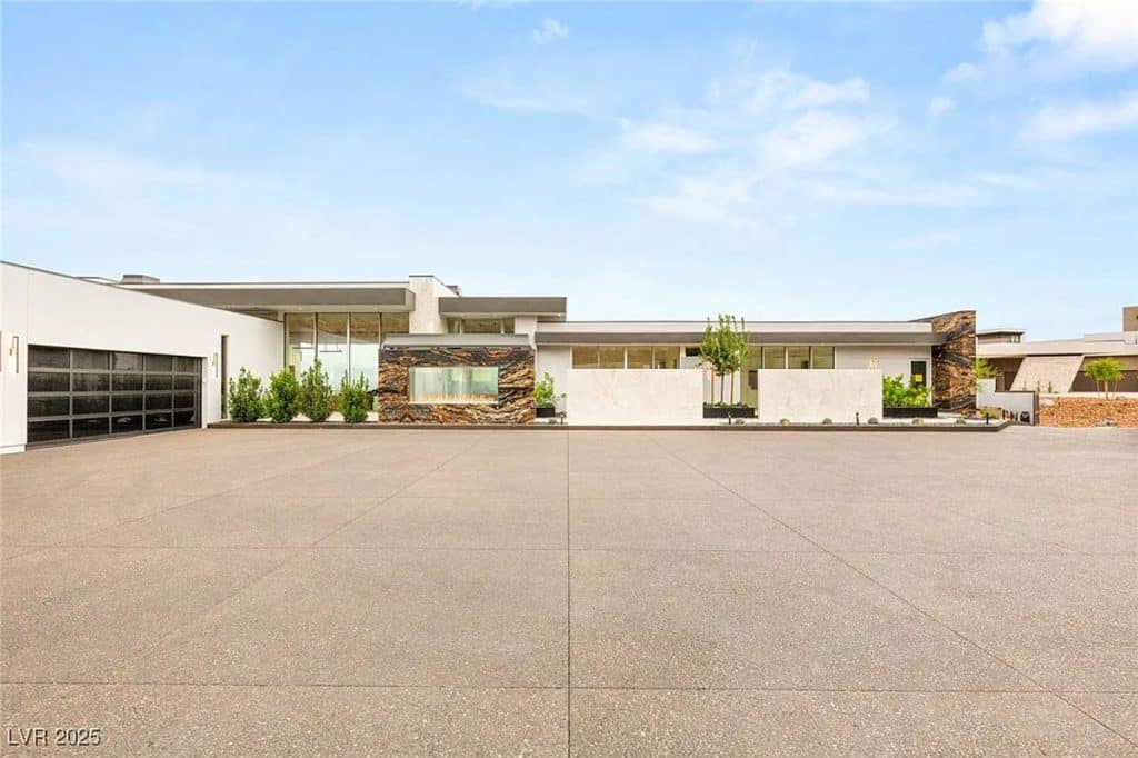 Brand new and never occupied, this stylish mansion features a private elevator leading to a theater, bar, and guest suite on the upper level, while all primary living spaces and bedrooms are gracefully situated on the ground floor. Flames flicker throughout—from the floating glass courtyard fireplace to the dual marble-surround fireplaces that adorn the great room and patio, as well as the firepits at the pool’s sunken lounge and outside the primary suite’s secluded retreat. Towering glass walls disappear to reveal breathtaking views of the Strip, mountains, and cityscape. The lavish primary suite captivates with expansive vistas, an indoor-outdoor shower, and a boutique-style closet. A resort-style pool, spa, outdoor kitchen, extravagant patios, and a 6-car gallery garage round out this architectural masterpiece.