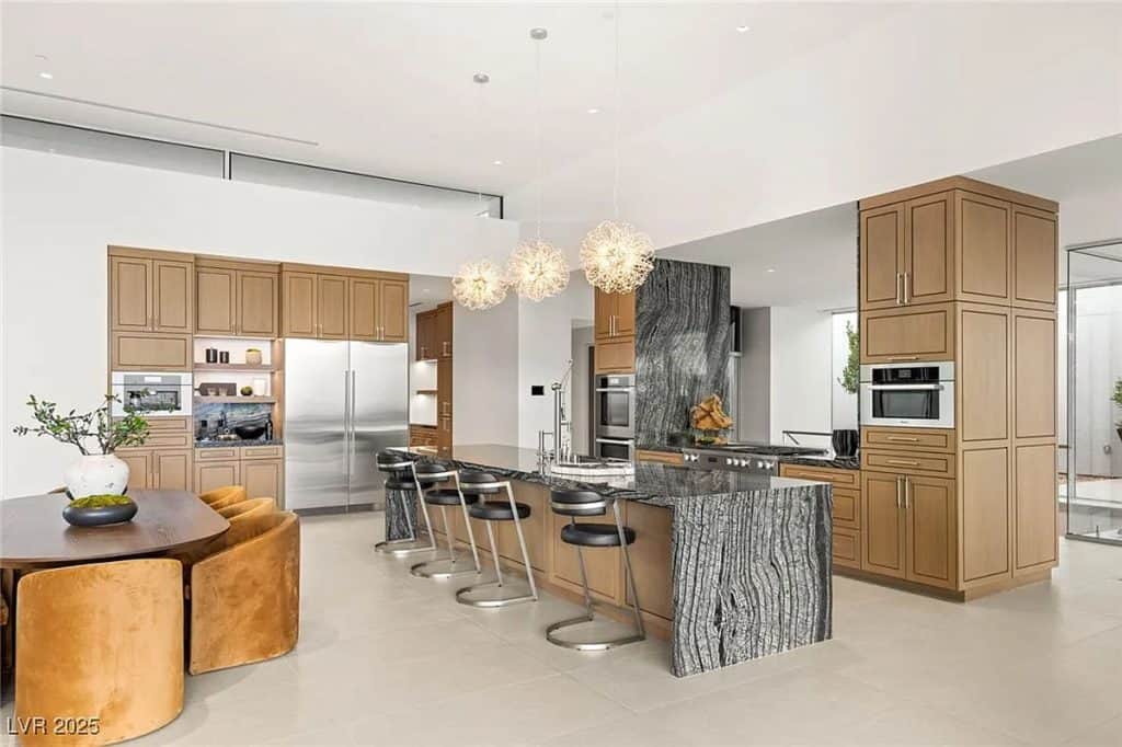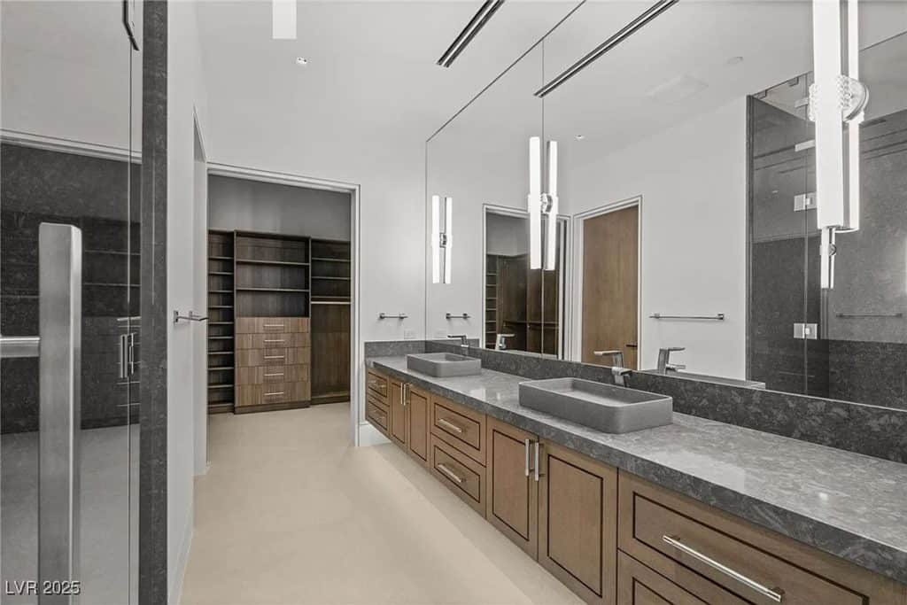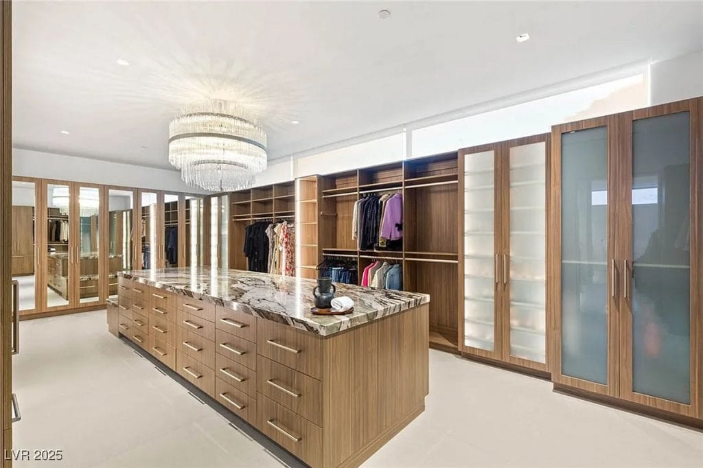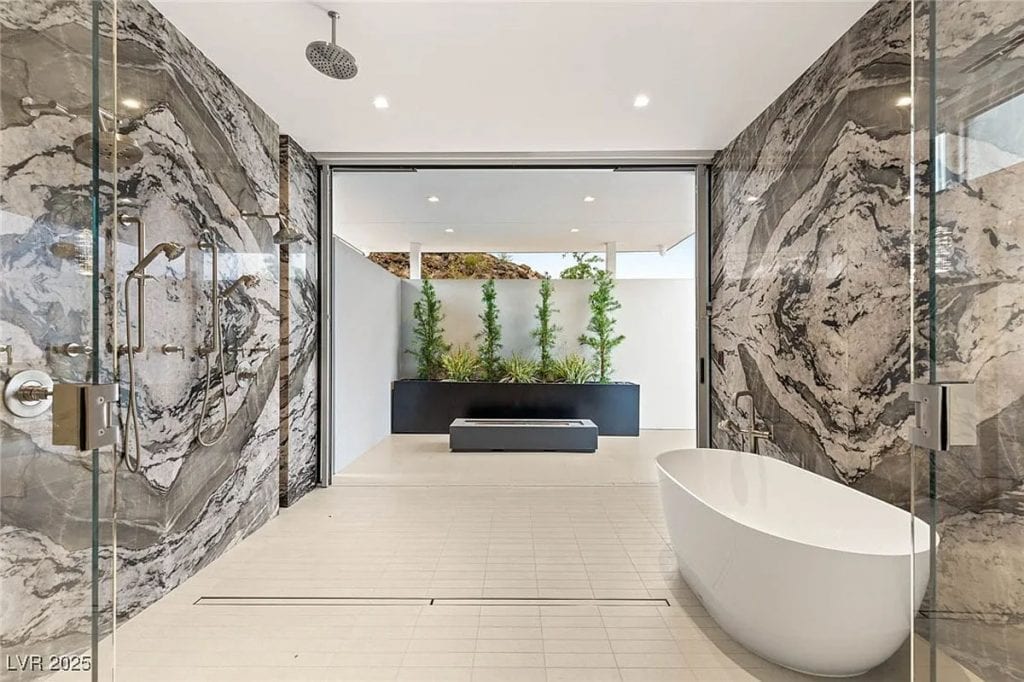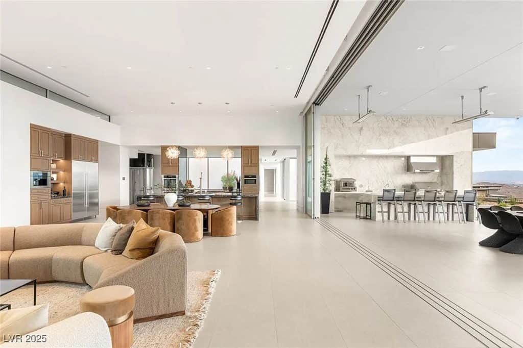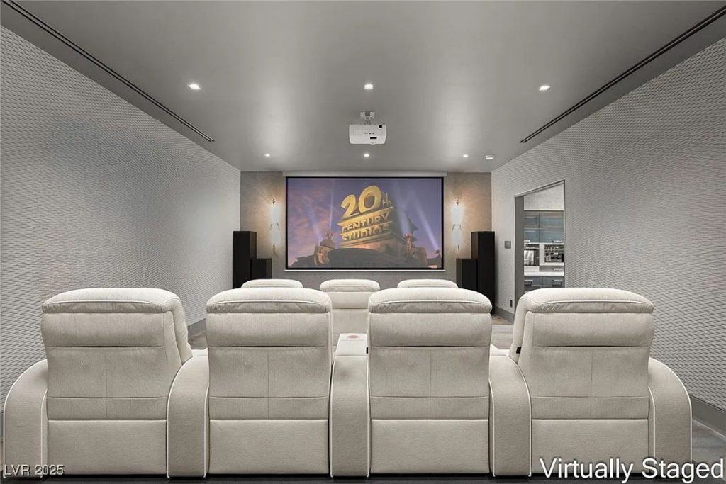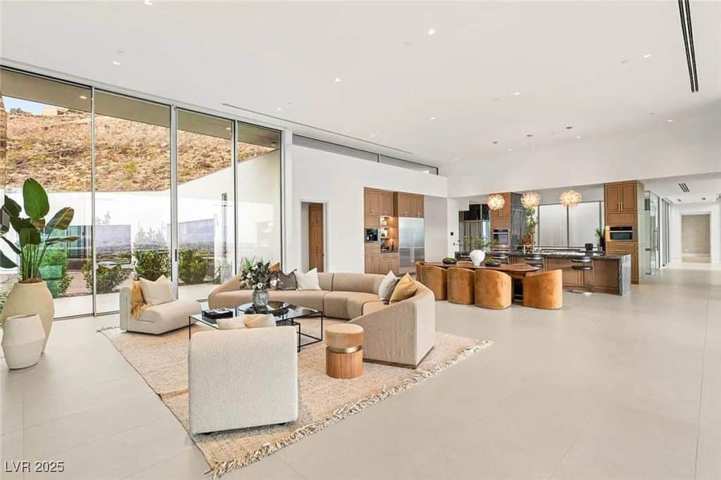 Brand new and never occupied, this stylish mansion features a private elevator leading to a theater, bar, and guest suite on the upper level, while all primary living spaces and bedrooms are gracefully situated on the ground floor. Flames flicker throughout—from the floating glass courtyard fireplace to the dual marble-surround fireplaces that adorn the great room and patio, as well as the firepits at the pool’s sunken lounge and outside the primary suite’s secluded retreat. Towering glass walls disappear to reveal breathtaking views of the Strip, mountains, and cityscape. The lavish primary suite captivates with expansive vistas, an indoor-outdoor shower, and a boutique-style closet. A resort-style pool, spa, outdoor kitchen, extravagant patios, and a 6-car gallery garage round out this architectural masterpiece.