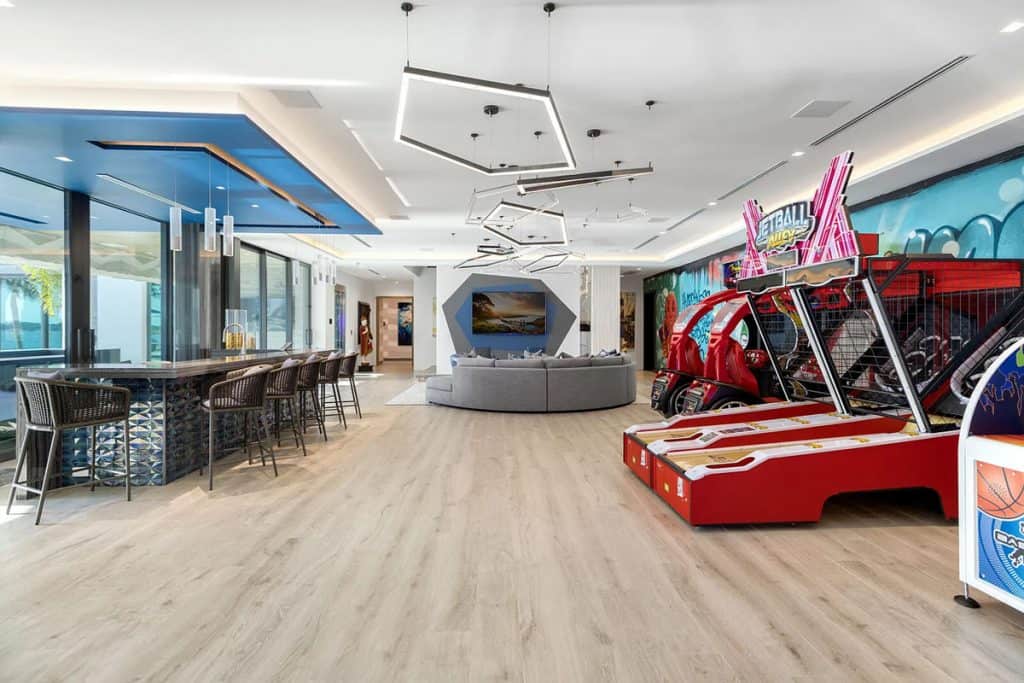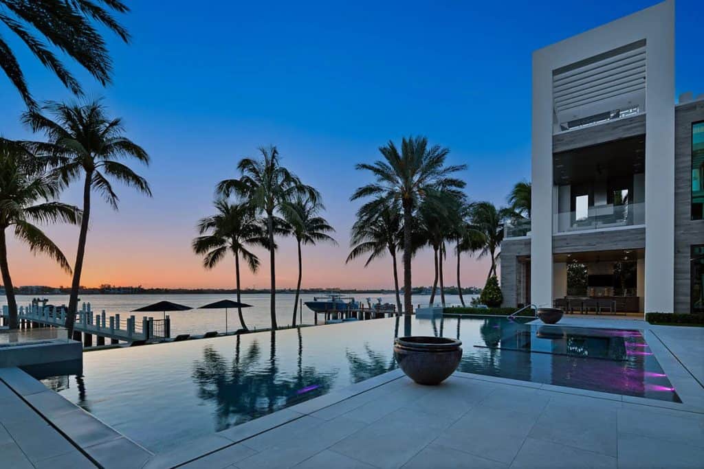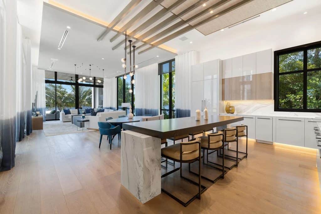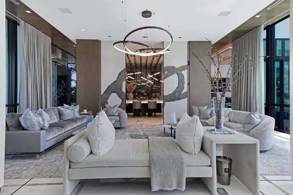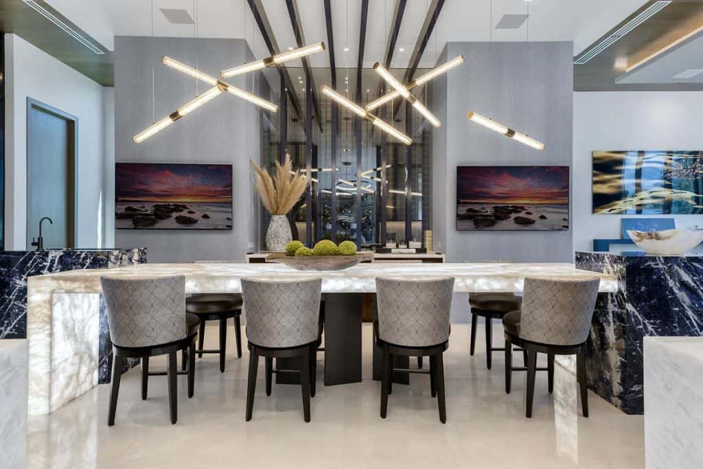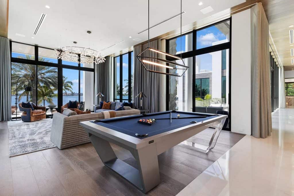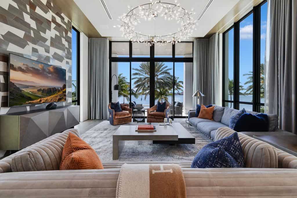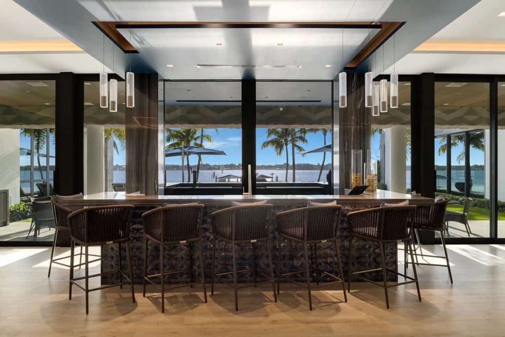 This property has been meticulously designed using the most exquisite and luxurious materials, including fabrics, stones, and natural resources: a tunnel leading to a private beachfront cabana, a private dock, two bowling alleys, a wellness spa, a steam room, a massage room, a fitness center, a movie theater, a game room, a craft room, an elevator, and a scullery kitchen. The design reflects nautical influences that evoke a breezy and tranquil atmosphere, capturing the spirit of modern sophistication and coastal living.