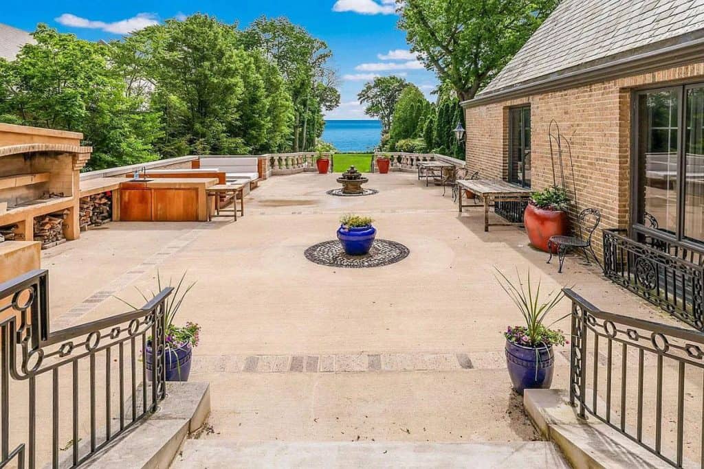 Outdoors, the property truly shines. Immaculately maintained grounds lead to a stunning patio equipped with a stone fire oven, all set against breathtaking panoramic views of Lake Michigan.