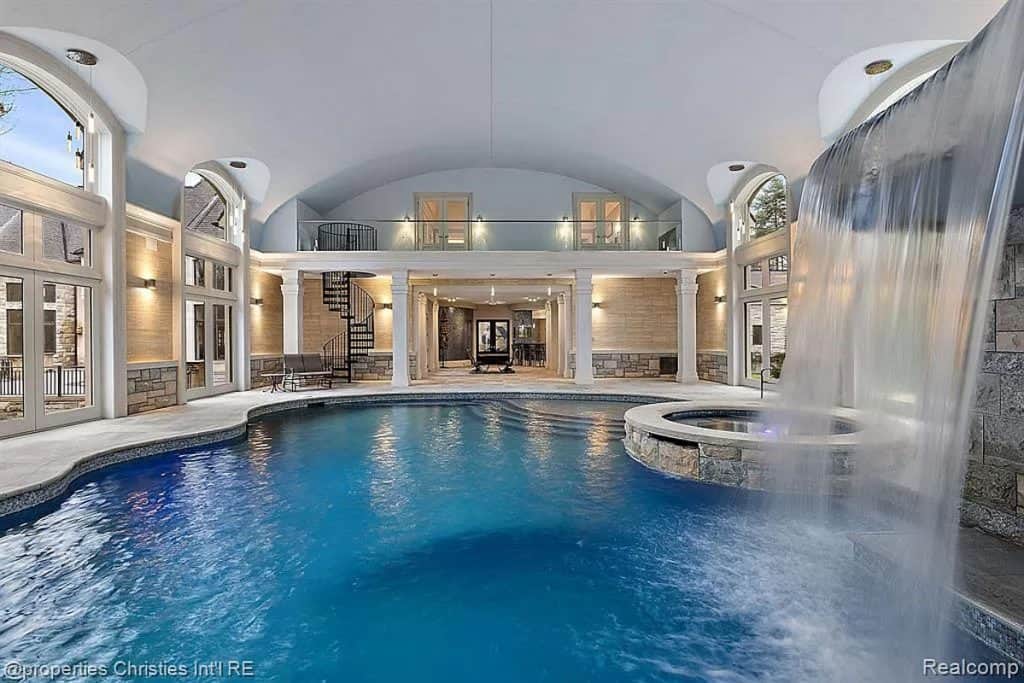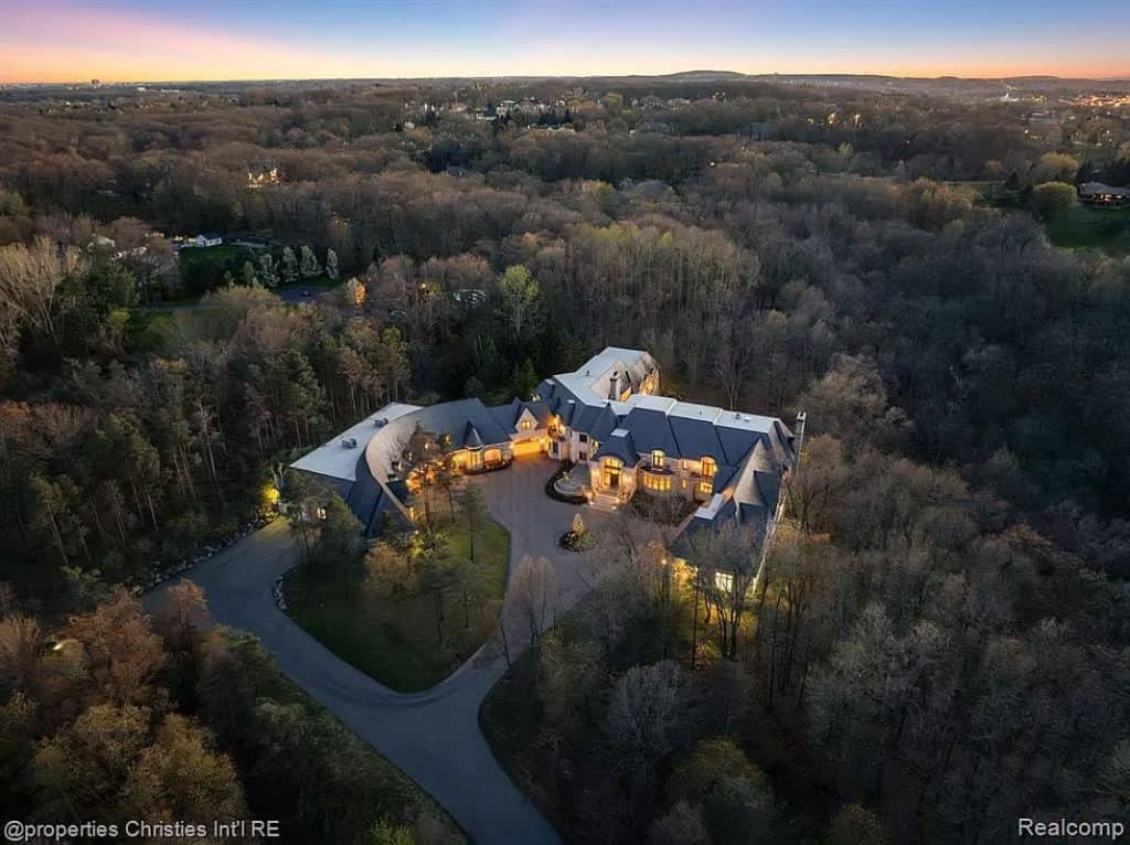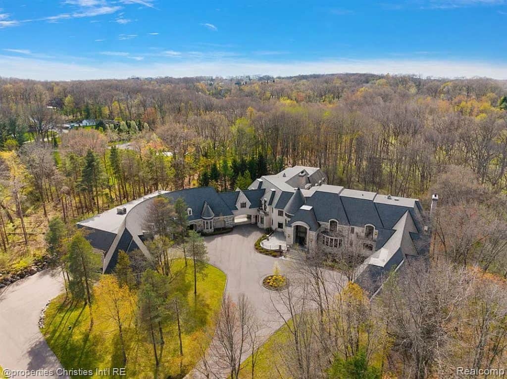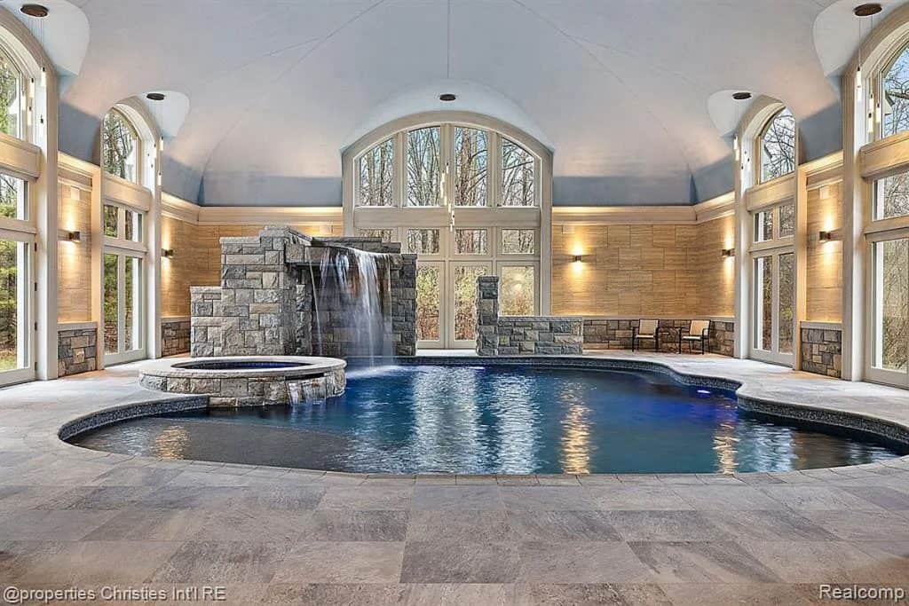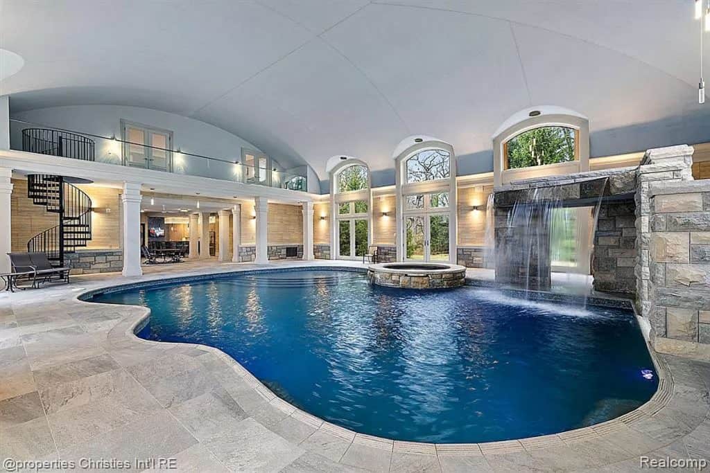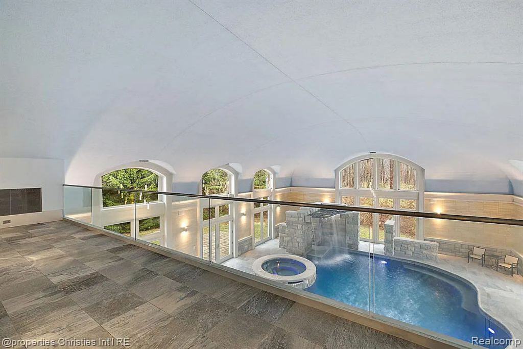 Welcome to a remarkable estate sprawled across nearly 8 acres, offering over 30,000 square feet of luxurious living space. Enter through the impressive foyer that opens up to a breathtaking main level, highlighted by a great room with exquisite woodwork. Enjoy entertainment in the first-floor theater, and unwind in your own private indoor paradise, complete with a cascading waterfall, hot tub, fully equipped kitchen, two full bathrooms, and a changing room, all within the indoor pool area. Enjoy exclusive amenities such as a private game room complete with a full bar. The property includes a distinctive garage equipped with an elevator lift that can hold more than 15 vehicles. An in-home elevator provides access to all floors, including the specially designed walkout lower level.