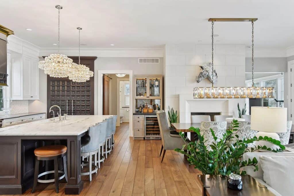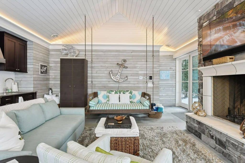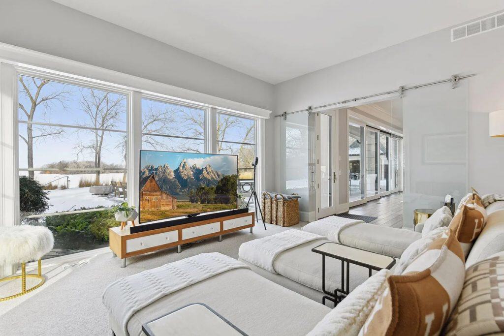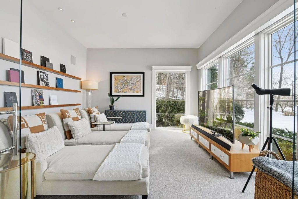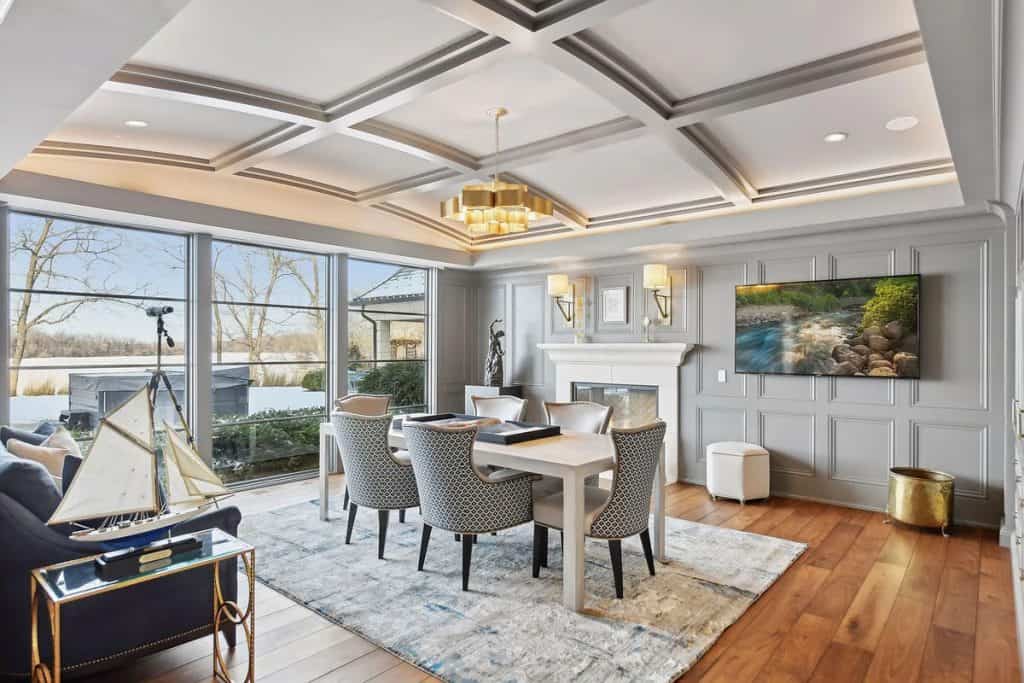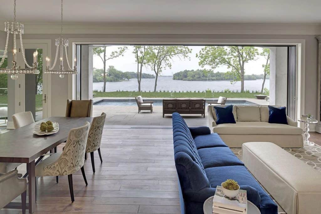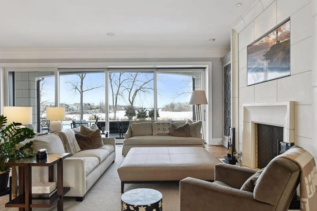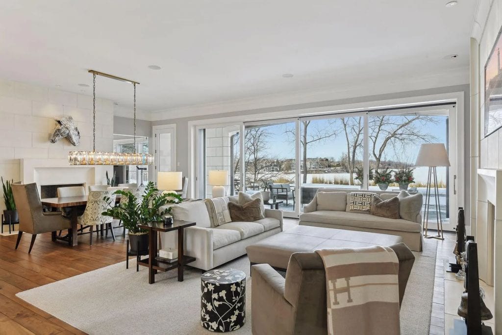 This stunning property spans 1.22 acres and features 210 feet of beautiful sandy shoreline, offering an exceptional lakefront lifestyle with stunning views of the private cove next to Smithtown Bay from almost every angle. The spacious and welcoming great room, complete with a 24-foot retractable glass wall, flows seamlessly into the gourmet kitchen, which is highlighted by honed marble and radiant mother-of-pearl tile, ensuring that no detail has been missed. Additional highlights include a glass-enclosed music and office area with coffered ceilings, a mirrored fitness room, and an elevator that connects all three levels. The resort-style amenities include a heated pool, a hot tub, a spacious patio, and a fully equipped pool house with a fireplace and an outdoor dining area—all strategically placed to take in the stunning lake views. With a garage that accommodates over 10 cars across three distinct areas, this estate combines exceptional practicality with luxurious design.