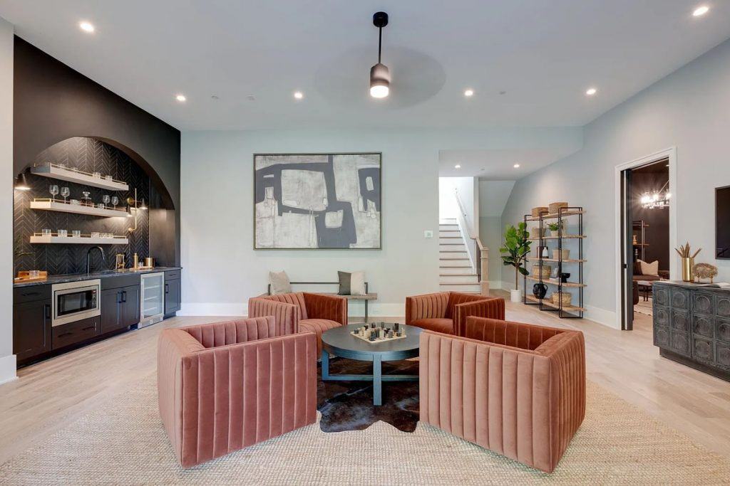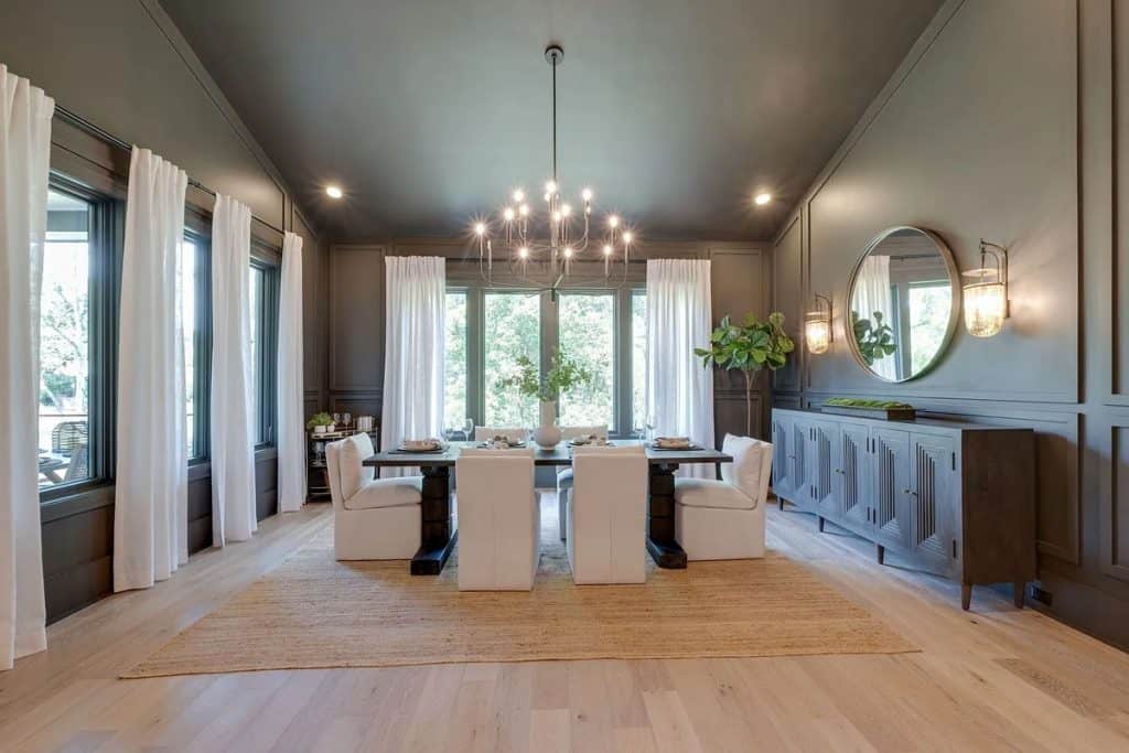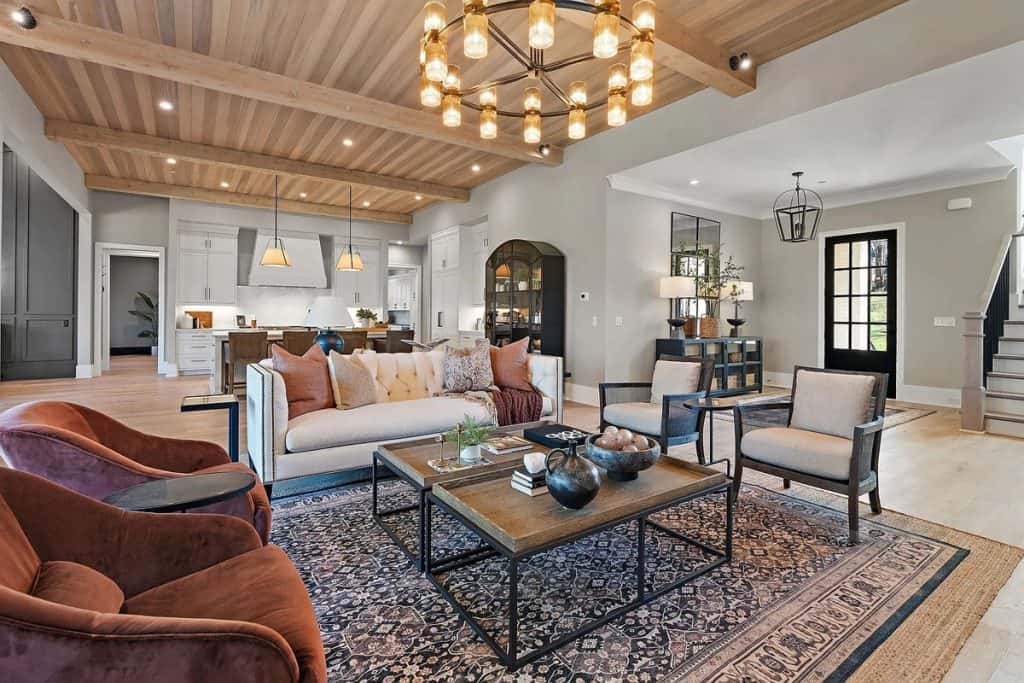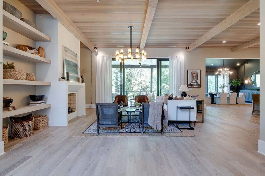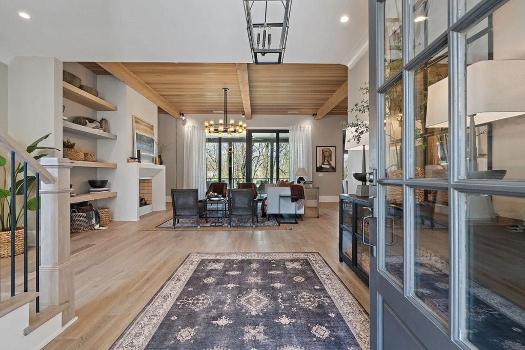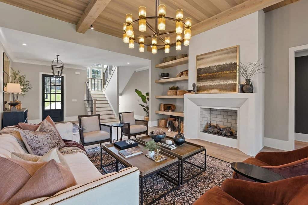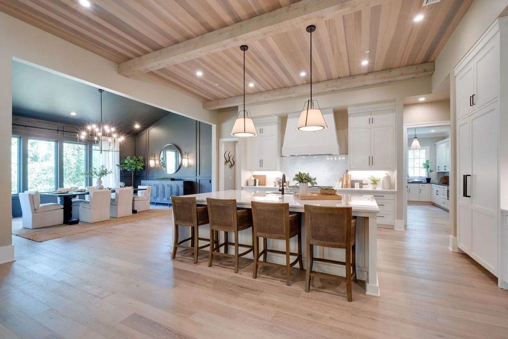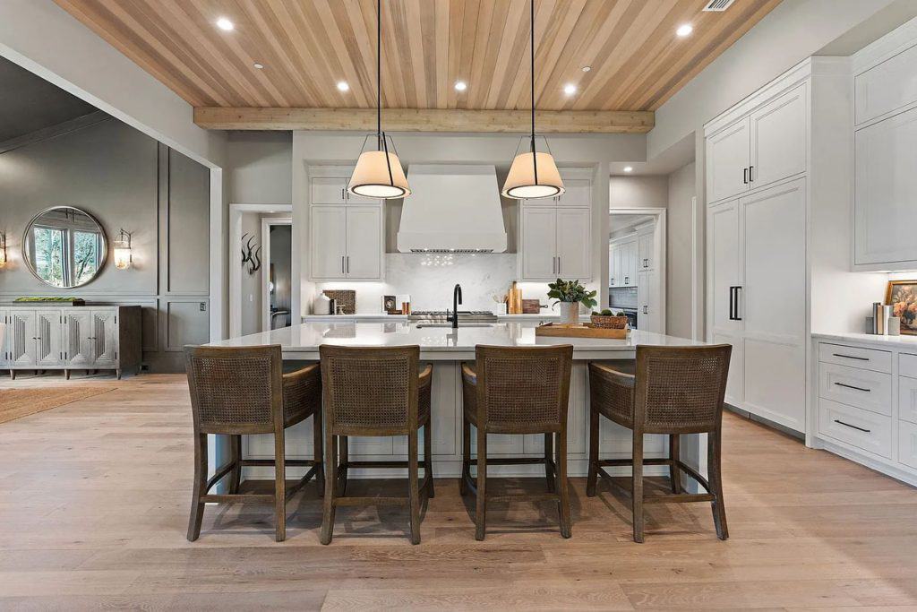 This home is incredibly grand, nestled within a gated community on nearly an acre of land. It features a spacious 3-car garage and boasts 12-foot ceilings adorned with beautiful warm white oak. The main level primary suite is vaulted and includes a luxurious soaking tub along with generous closet space. The open floor plan seamlessly combines modern design with classic sophistication. The gourmet kitchen is a chef’s paradise, complete with double ovens, a large prep kitchen, and an oversized island that will delight even the most particular culinary enthusiasts. Adjacent to the kitchen, you’ll find an au pair suite featuring its own private entrance and laundry facilities. There are covered porches with fireplaces on both the main and lower levels. The lower level, which leads out to the expansive backyard, provides ample space for a theater, fitness studio, billiards, and more.