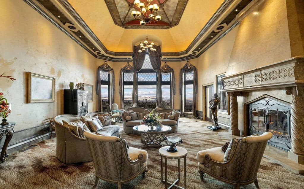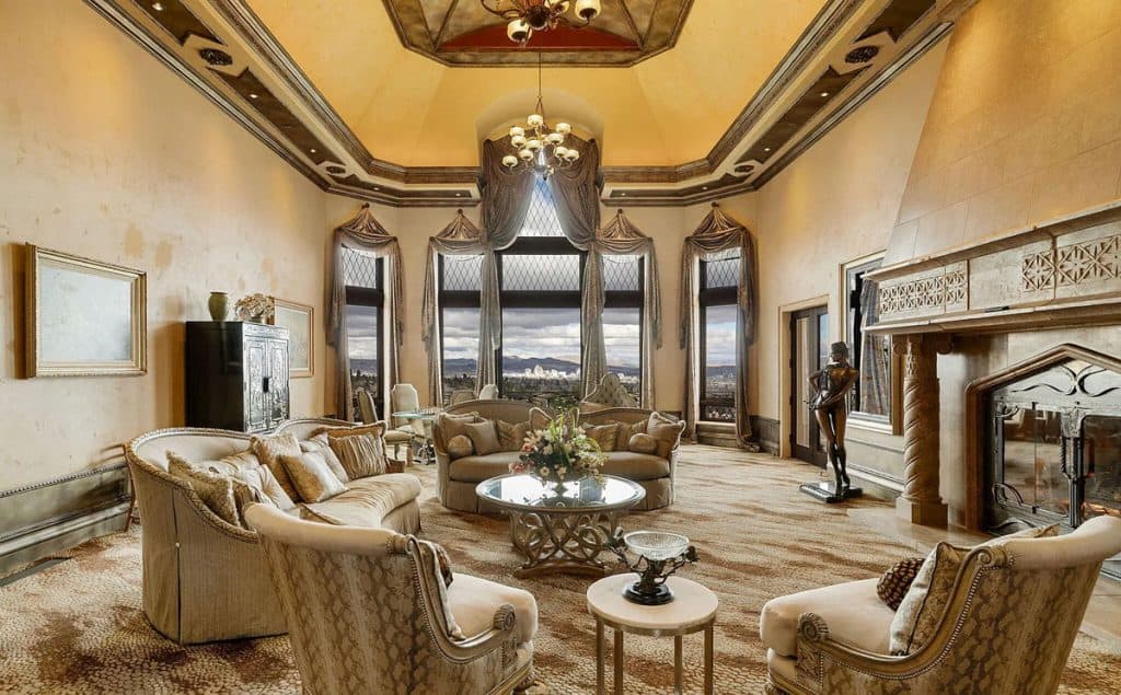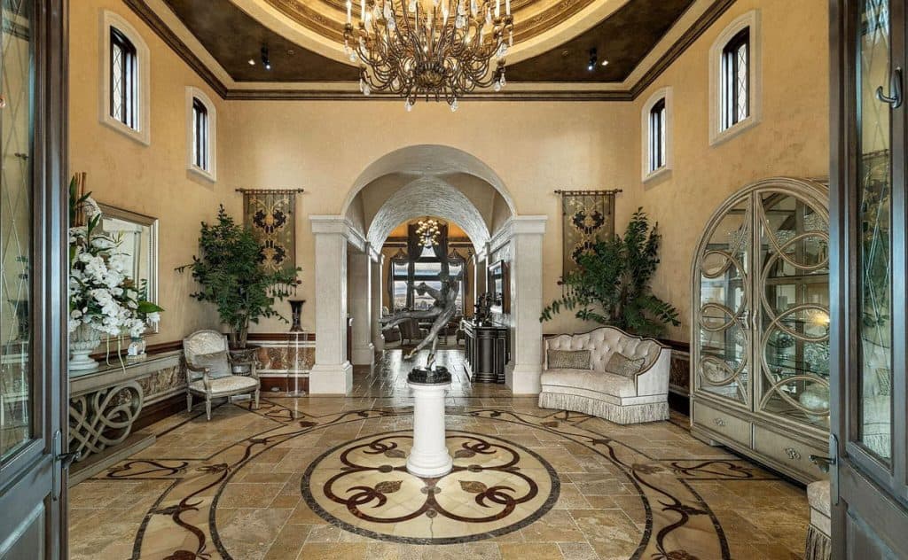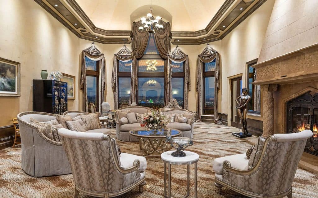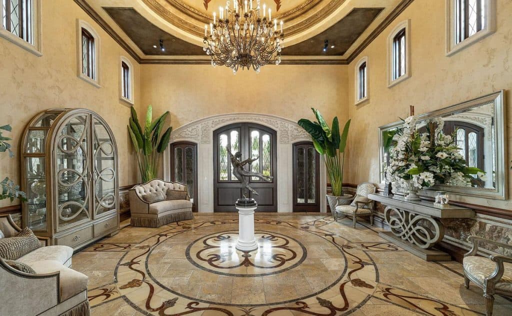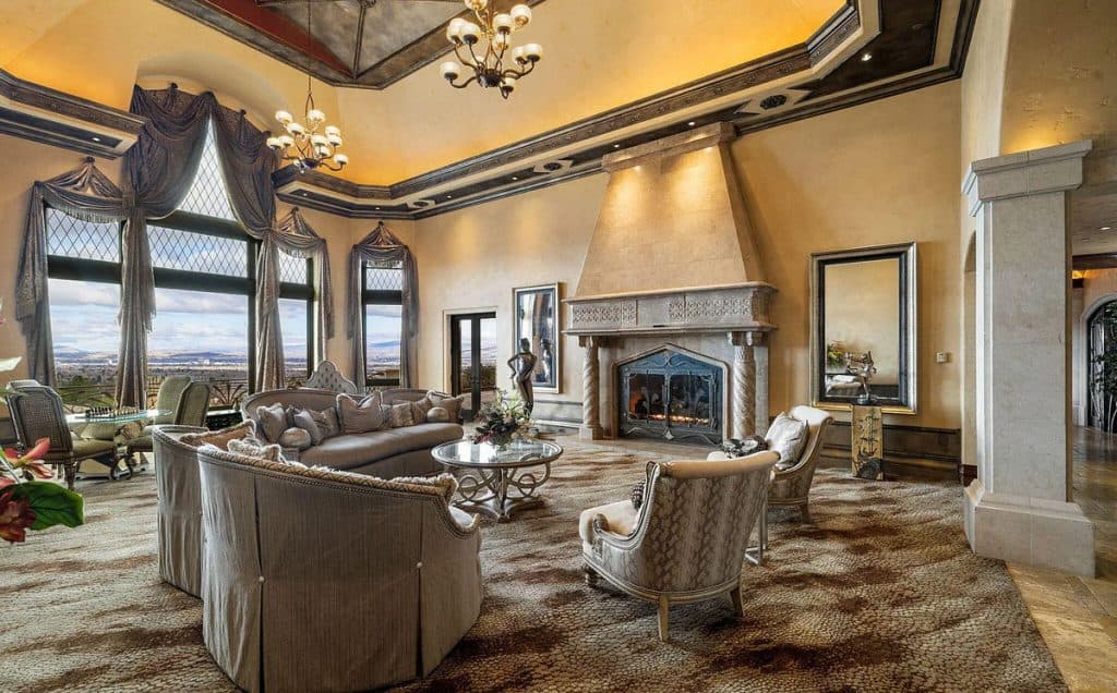A striking rotunda entry with soaring Venetian plaster ceilings welcomes you, leading into a grand living room that features a prominent fireplace and floor-to-ceiling windows that showcase those iconic views. The home encompasses over 19,000 square feet of luxurious living space, meticulously crafted with rare stones, exotic woods, and materials sourced from around the globe. Its flawless, intricate craftsmanship is sure to impress even the most selective buyer. A circular sunken bar connects effortlessly to a stone-lined wine cellar and billiards room. A stunning circular formal dining room provides a dramatic backdrop for intimate dinners or significant social occasions. The lower level of the home, accessible via a grand staircase or elevator, enhances the lifestyle experience with three spacious ensuite bedrooms (each leading to poolside patios), a full home theater with a snack bar, a large gym with a salon, a craft room, and a secured gallery room for showcasing historic arms, militaria, or other distinguished collections. The outdoor area features statues, a magnificent fountain, expansive lawns, an in-ground pool and spa complete with a built-in kitchen, and yet another impressive fireplace to enhance the outdoor experience.