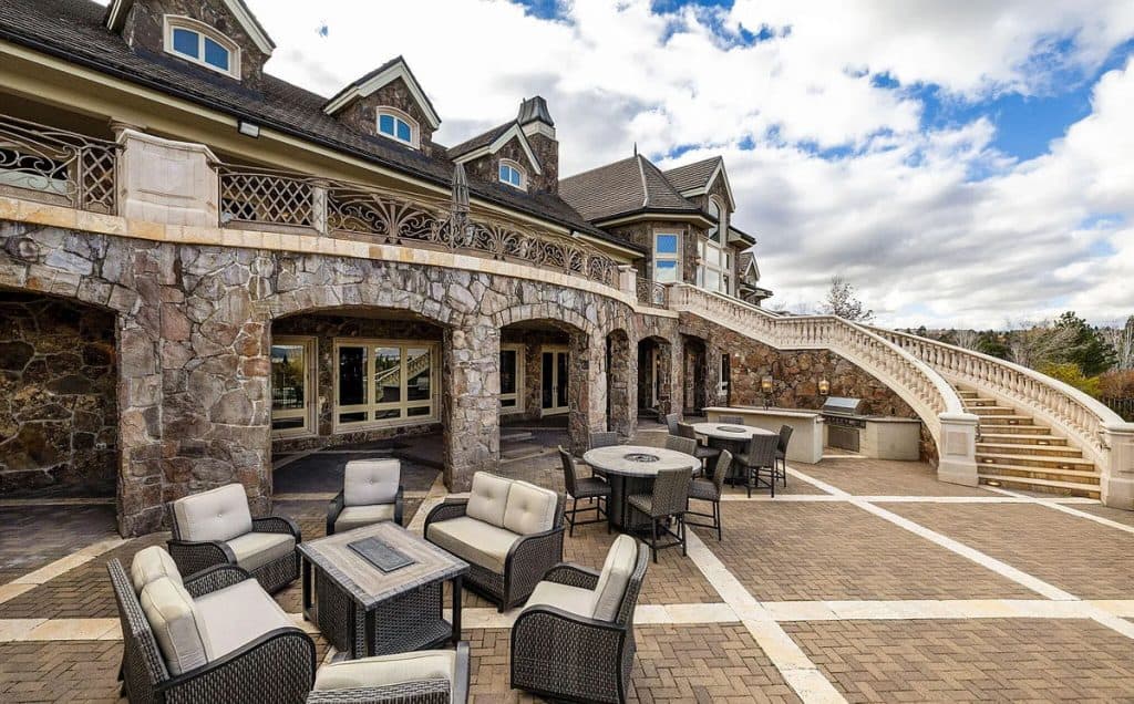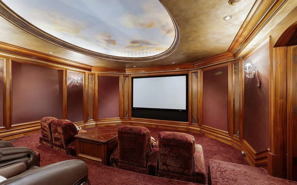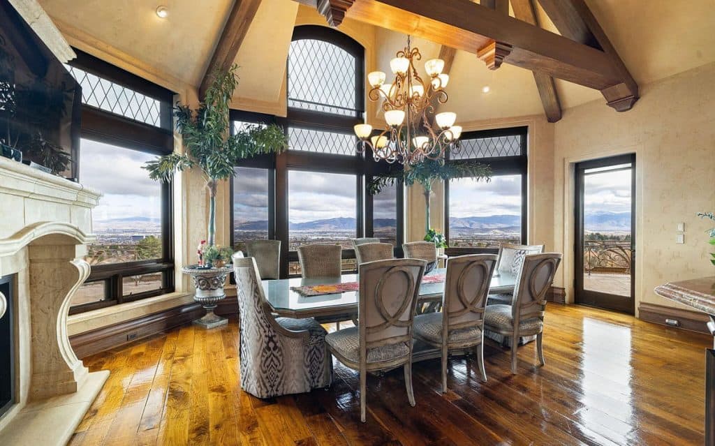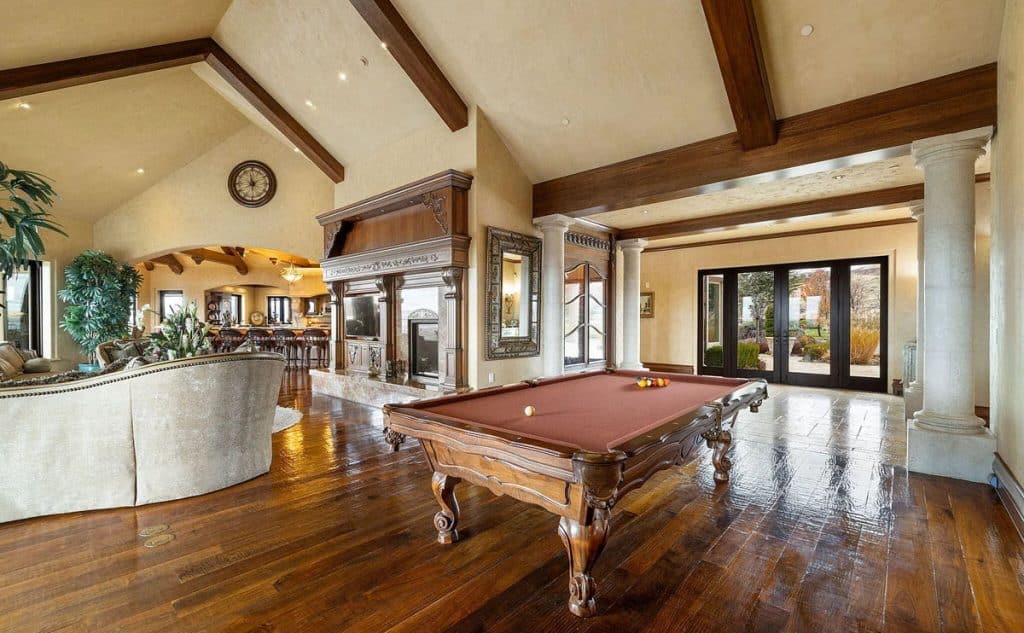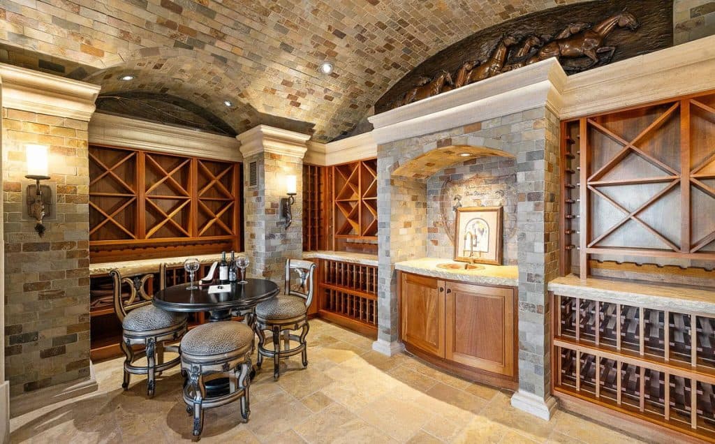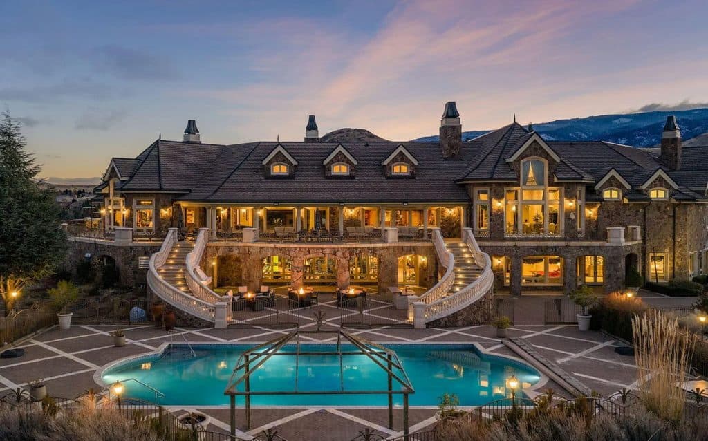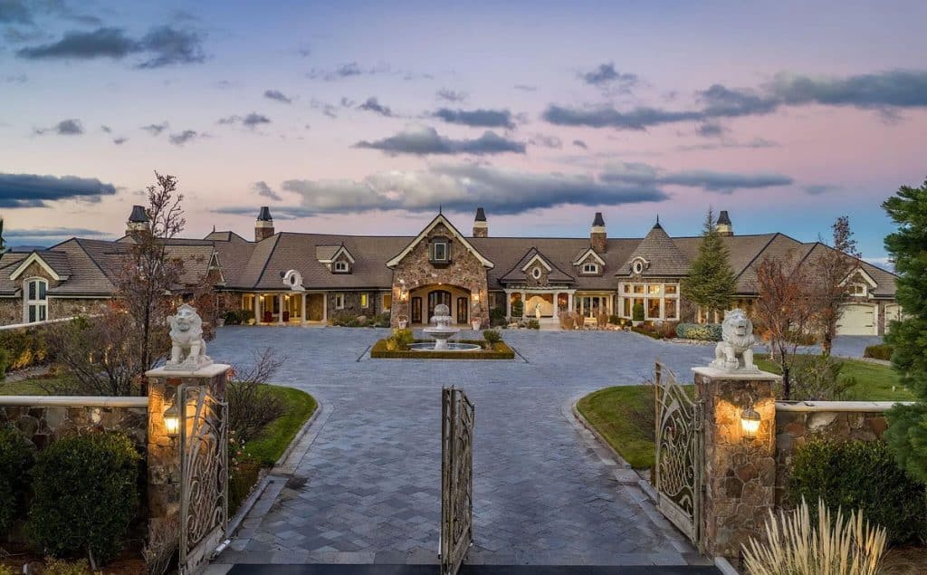 A striking rotunda entry with soaring Venetian plaster ceilings welcomes you, leading into a grand living room that features a prominent fireplace and floor-to-ceiling windows that showcase those iconic views. The home encompasses over 19,000 square feet of luxurious living space, meticulously crafted with rare stones, exotic woods, and materials sourced from around the globe. Its flawless, intricate craftsmanship is sure to impress even the most selective buyer. A circular sunken bar connects effortlessly to a stone-lined wine cellar and billiards room. A stunning circular formal dining room provides a dramatic backdrop for intimate dinners or significant social occasions. The lower level of the home, accessible via a grand staircase or elevator, enhances the lifestyle experience with three spacious ensuite bedrooms (each leading to poolside patios), a full home theater with a snack bar, a large gym with a salon, a craft room, and a secured gallery room for showcasing historic arms, militaria, or other distinguished collections. The outdoor area features statues, a magnificent fountain, expansive lawns, an in-ground pool and spa complete with a built-in kitchen, and yet another impressive fireplace to enhance the outdoor experience.