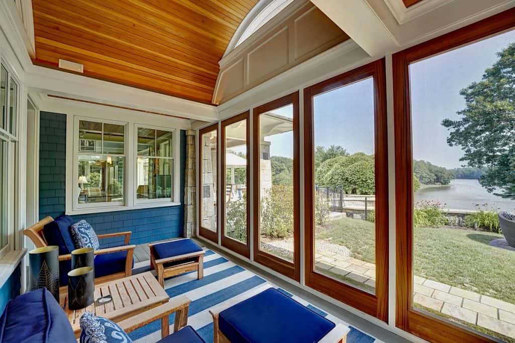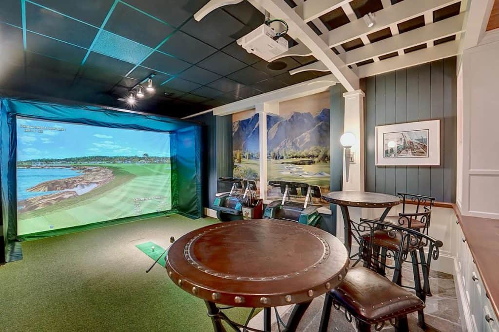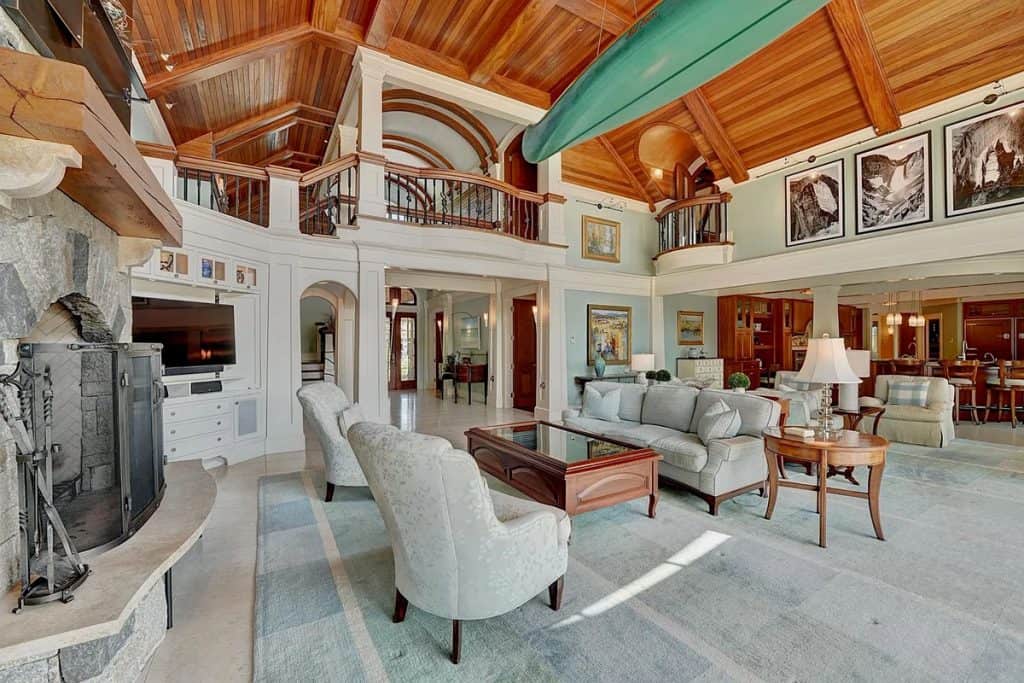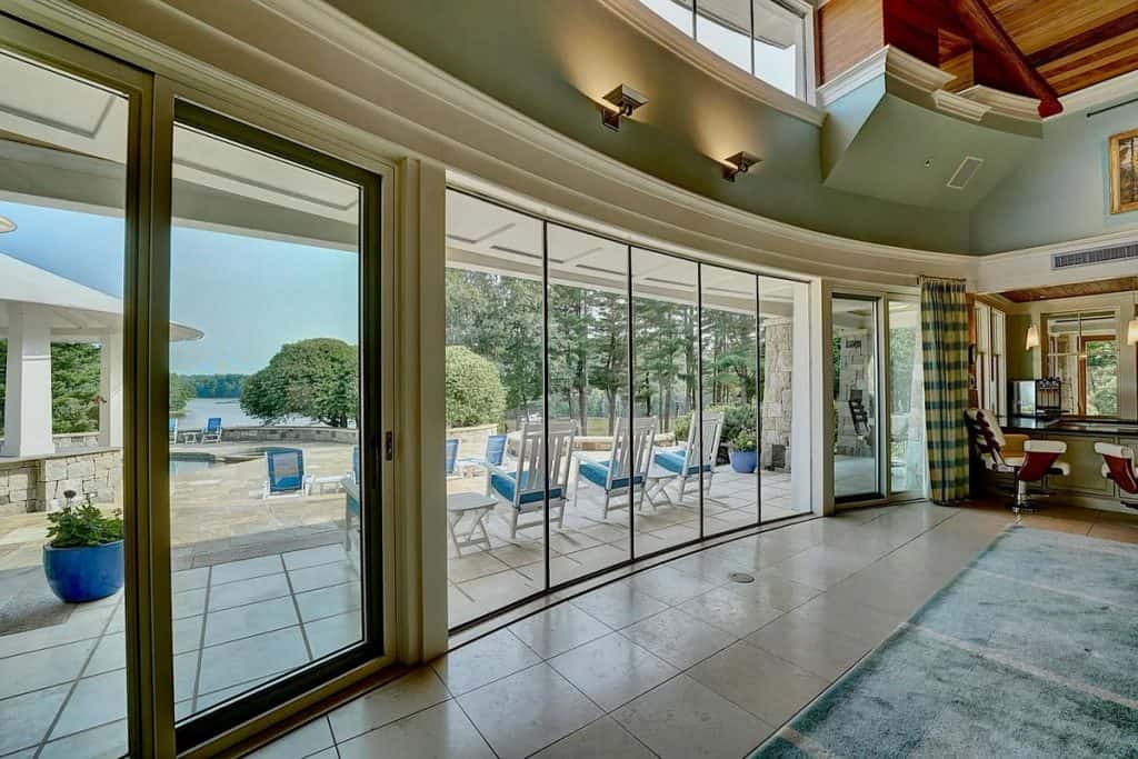 This exclusive retreat features a tennis/pickleball court, a bocce court, a golf green, a serene pond, and a private dock. A suspended canoe and curved glass walls enhance the breathtaking views of the river. The sunroom, complete with a fireplace, can easily be converted into a screened porch. The front rooms provide a surprisingly cozy atmosphere while overlooking an infinity pool and spa, accompanied by an outdoor covered kitchen. This property features a lower-level game room, a theater, a wine cellar, a fitness room, a sauna, a golf simulator, and a sports room.