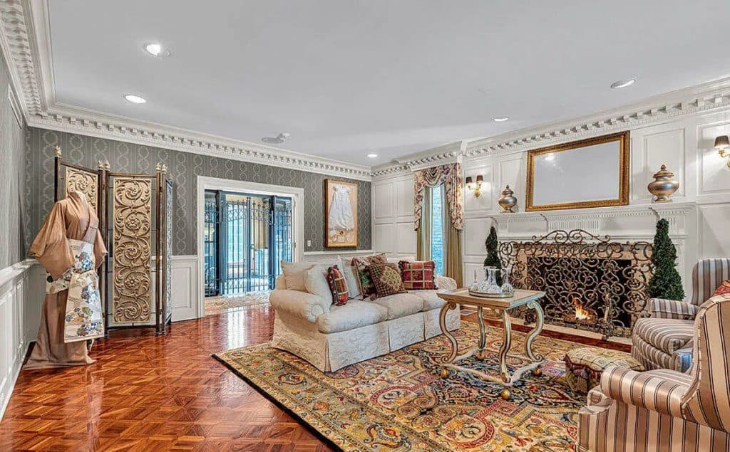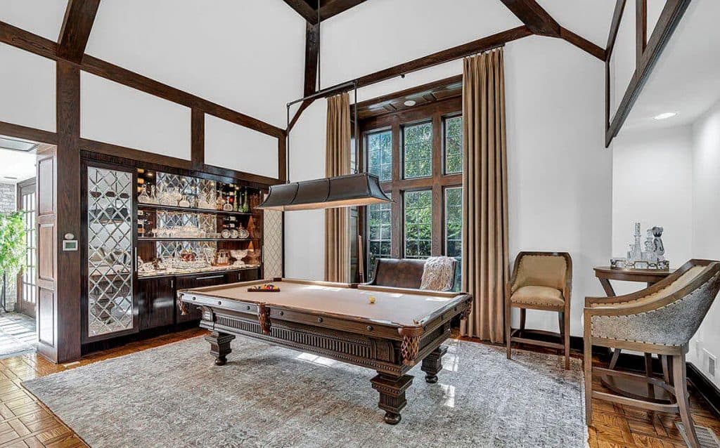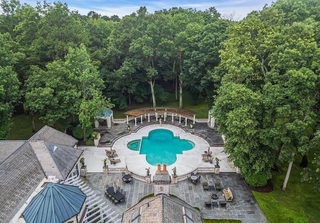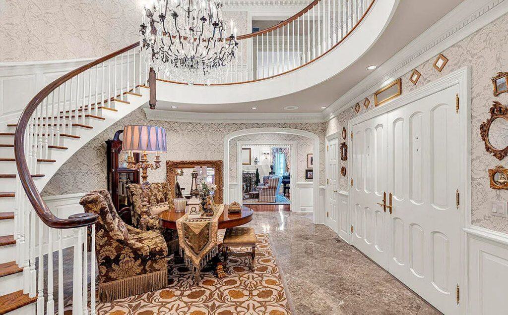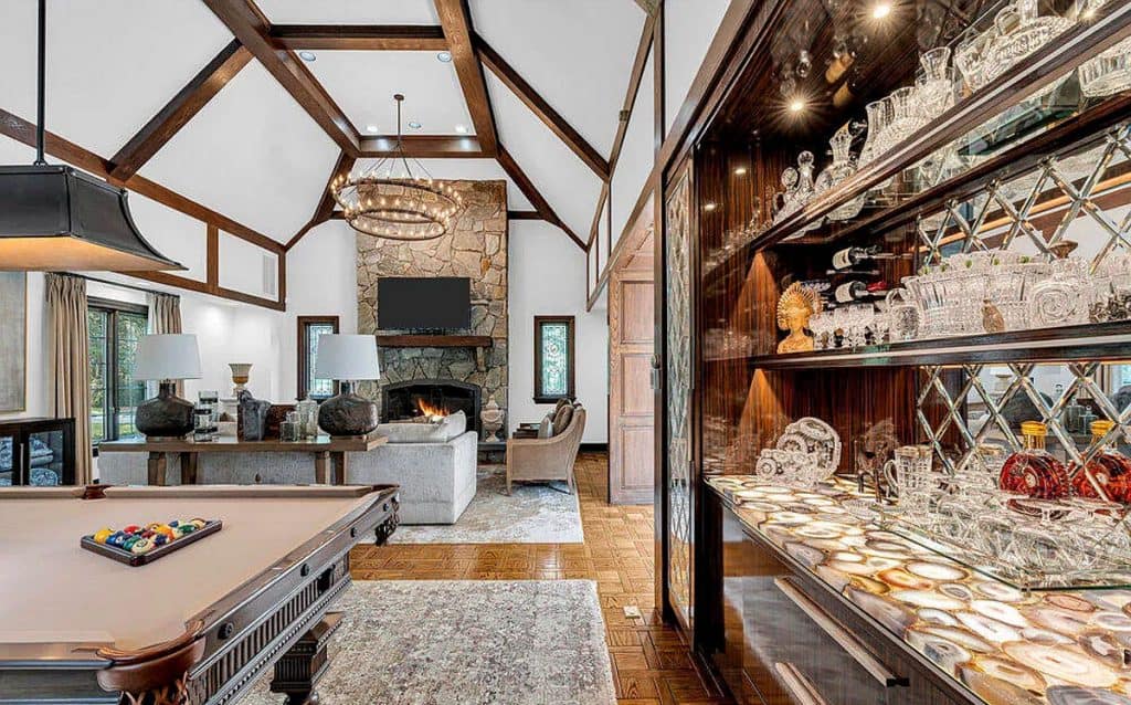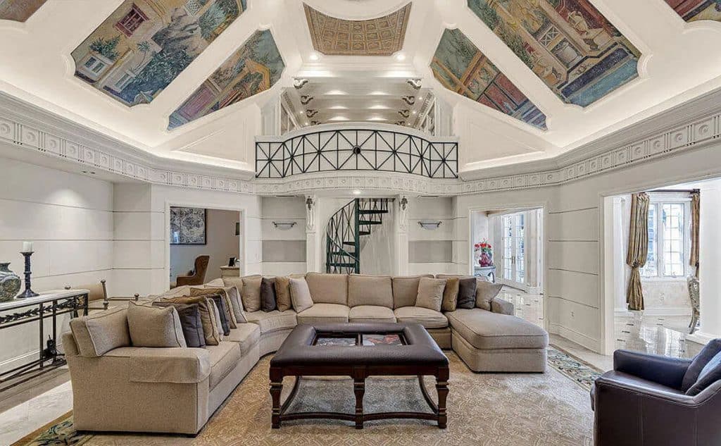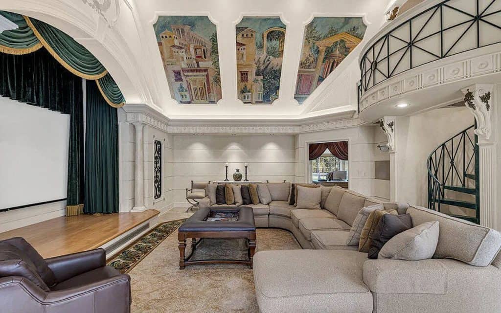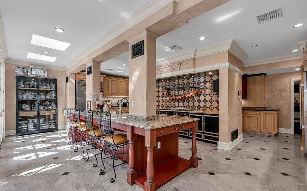Upon entering, a soaring double-height foyer establishes the tone for the home’s impressive scale and opulence. A beautifully paneled library exudes classic charm, while an adjacent temperature-controlled wine cellar combines purpose-built storage with elegant design in perfect harmony. At the heart of the home, the French-inspired kitchen combines timeless elegance with contemporary luxury, showcasing a La Cornue range, marble countertops, custom cabinetry, and a sunken breakfast area that seamlessly connects to the stunning main living room. In this space, a built-in stage, concealed projector, hand-painted ceiling, and a Juliet balcony leading to a media room create an environment perfect for both entertaining and peaceful evenings. The outdoor space showcases a custom clover-leaf shaped swimming pool with a jacuzzi spa, all surrounded by a 2,000 sqft slate patio.