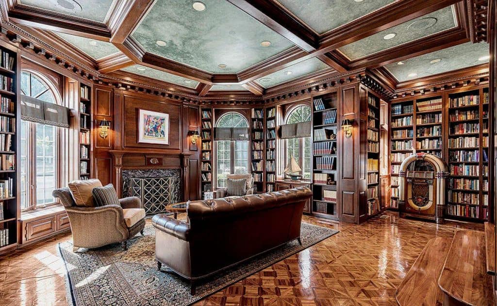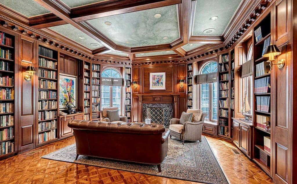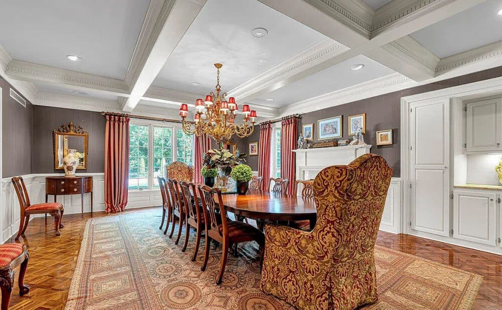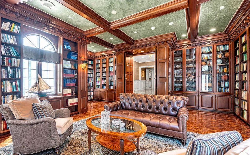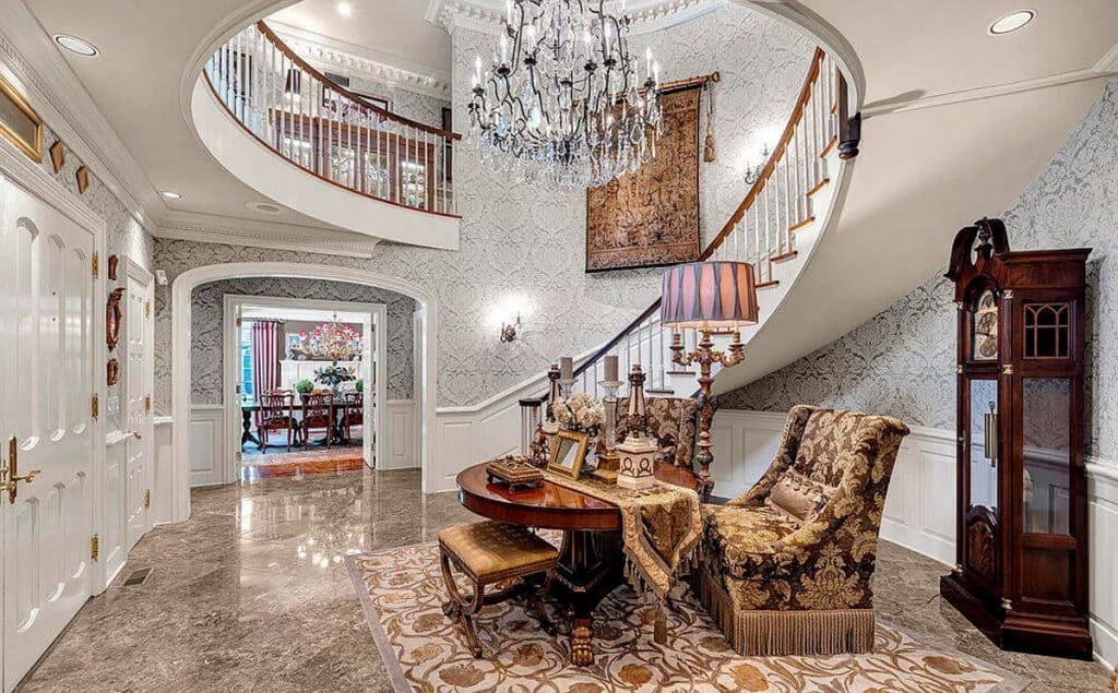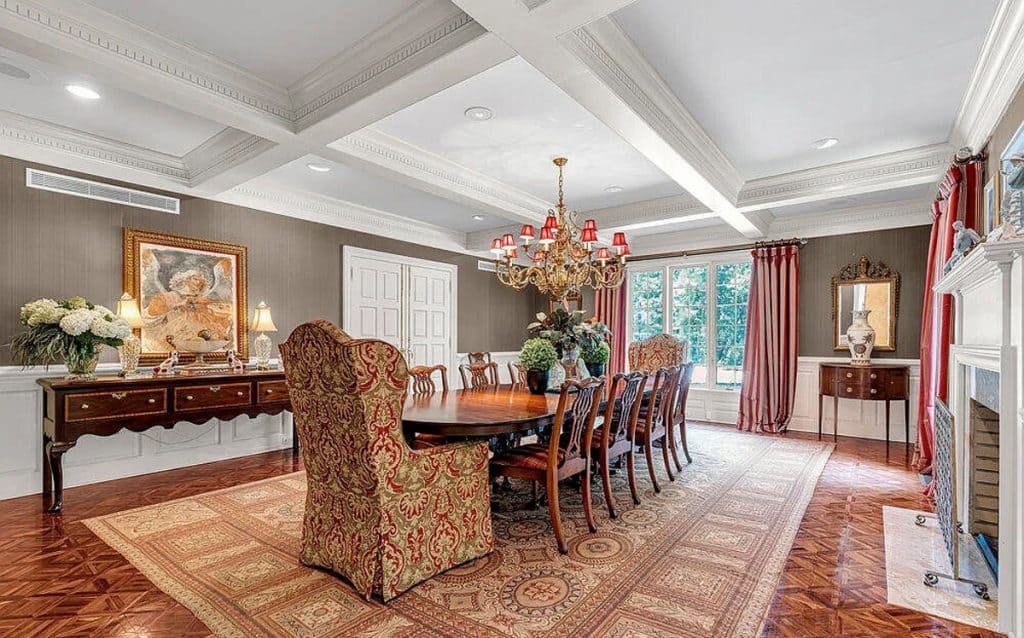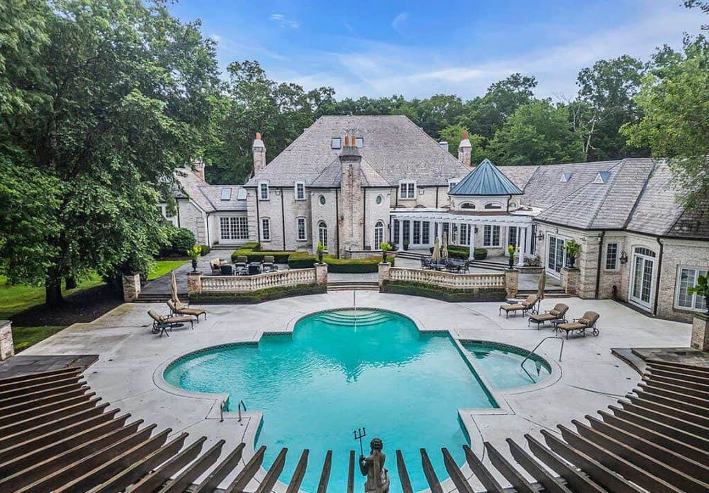 Upon entering, a soaring double-height foyer establishes the tone for the home’s impressive scale and opulence. A beautifully paneled library exudes classic charm, while an adjacent temperature-controlled wine cellar combines purpose-built storage with elegant design in perfect harmony. At the heart of the home, the French-inspired kitchen combines timeless elegance with contemporary luxury, showcasing a La Cornue range, marble countertops, custom cabinetry, and a sunken breakfast area that seamlessly connects to the stunning main living room. In this space, a built-in stage, concealed projector, hand-painted ceiling, and a Juliet balcony leading to a media room create an environment perfect for both entertaining and peaceful evenings. The outdoor space showcases a custom clover-leaf shaped swimming pool with a jacuzzi spa, all surrounded by a 2,000 sqft slate patio.