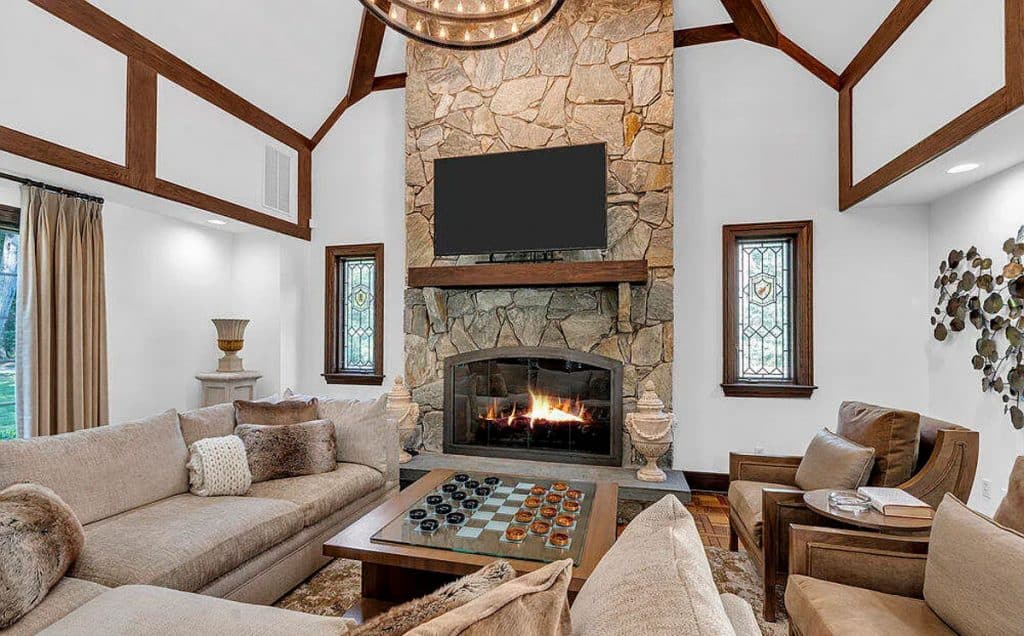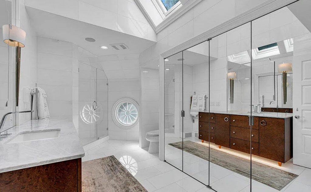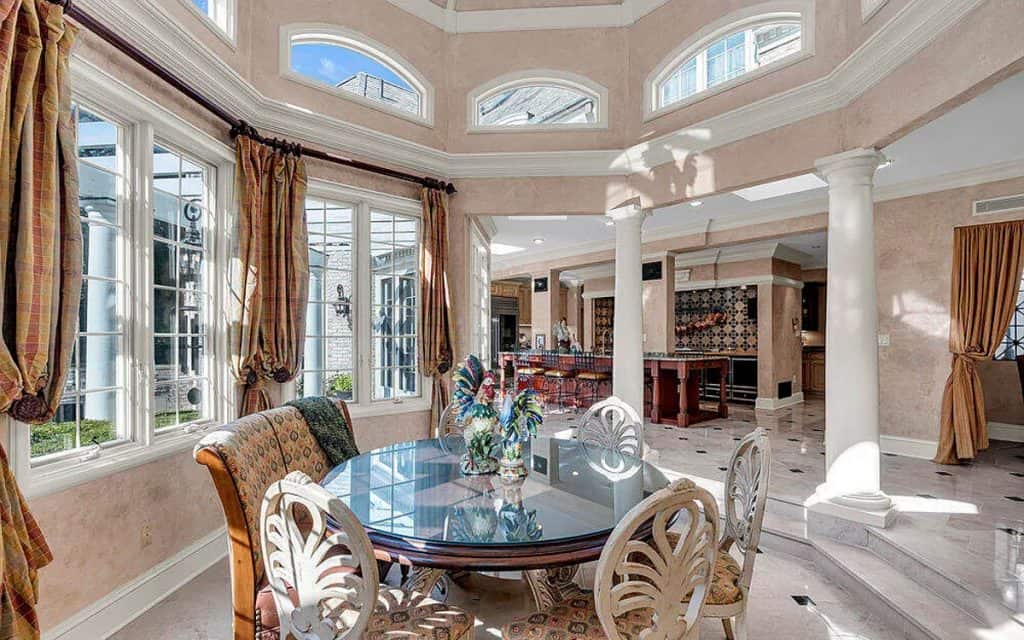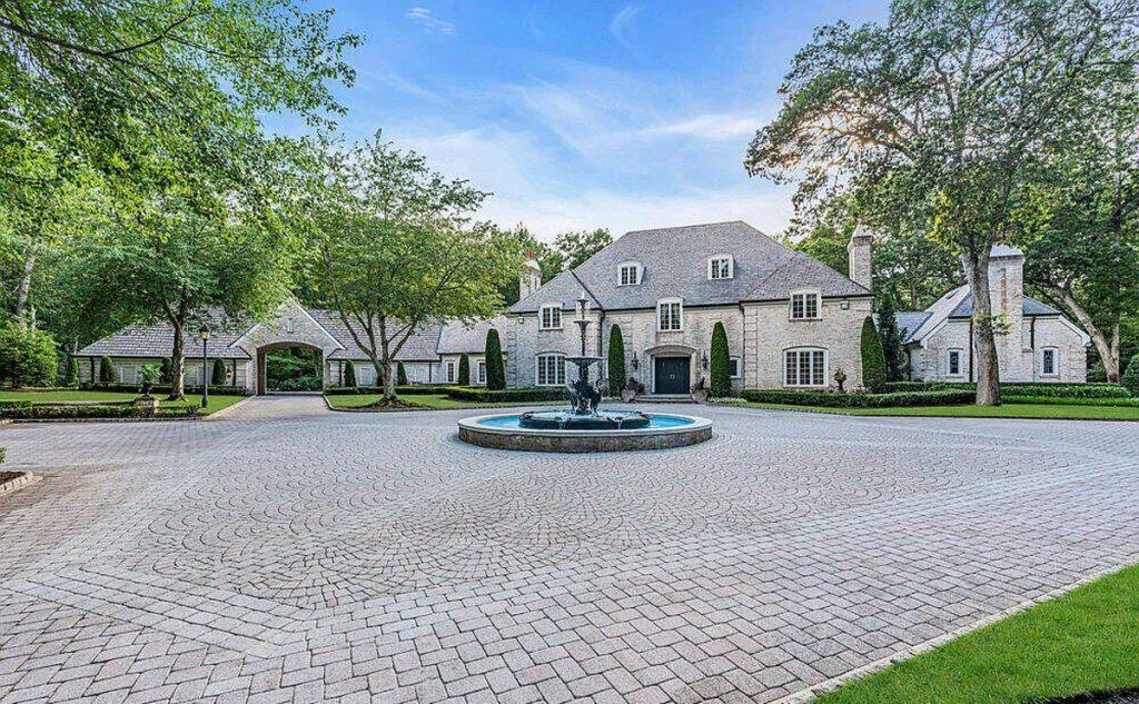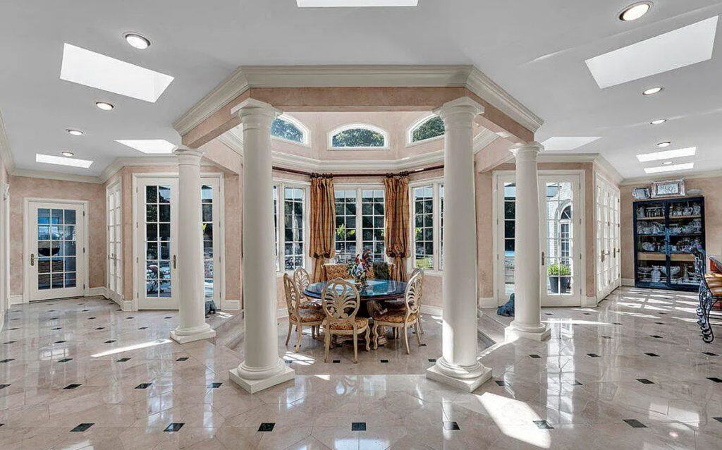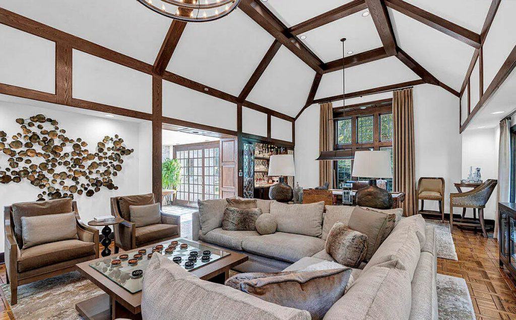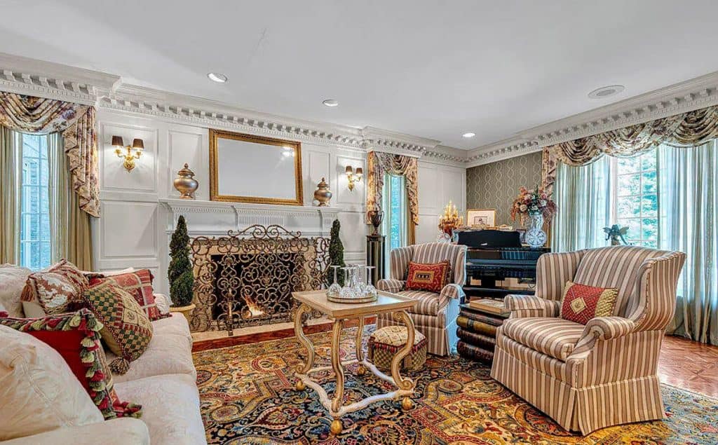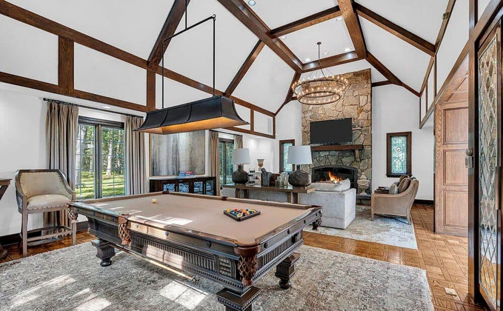 Upon entering, a soaring double-height foyer establishes the tone for the home’s impressive scale and opulence. A beautifully paneled library exudes classic charm, while an adjacent temperature-controlled wine cellar combines purpose-built storage with elegant design in perfect harmony. At the heart of the home, the French-inspired kitchen combines timeless elegance with contemporary luxury, showcasing a La Cornue range, marble countertops, custom cabinetry, and a sunken breakfast area that seamlessly connects to the stunning main living room. In this space, a built-in stage, concealed projector, hand-painted ceiling, and a Juliet balcony leading to a media room create an environment perfect for both entertaining and peaceful evenings. The outdoor space showcases a custom clover-leaf shaped swimming pool with a jacuzzi spa, all surrounded by a 2,000 sqft slate patio.