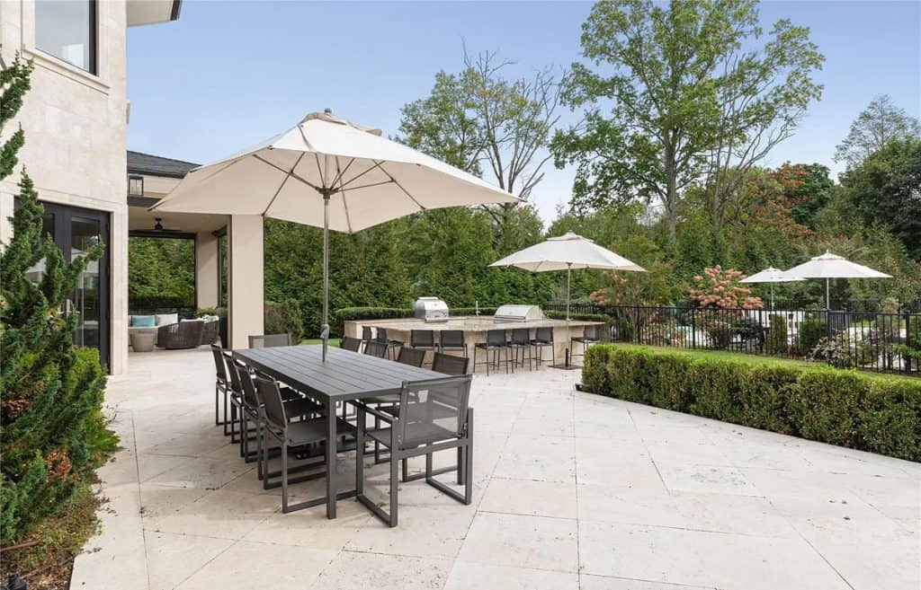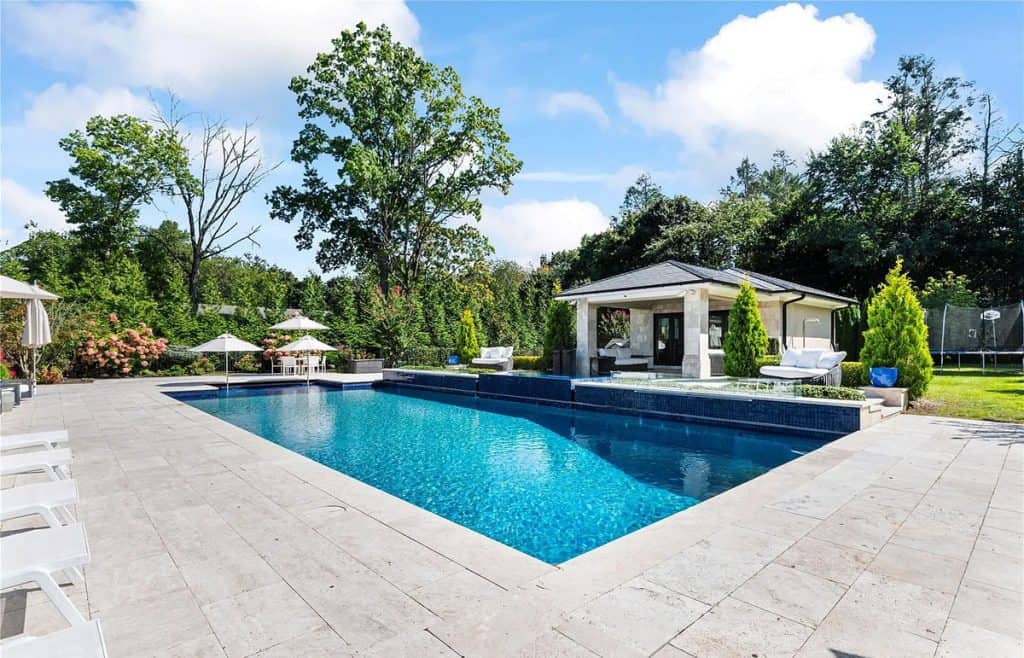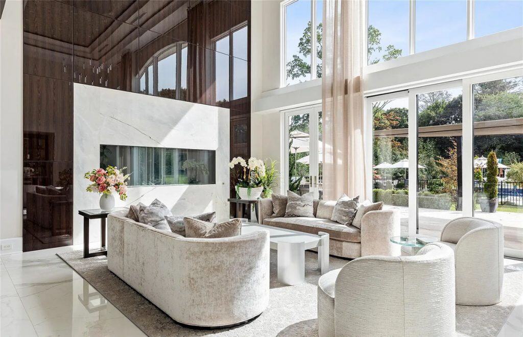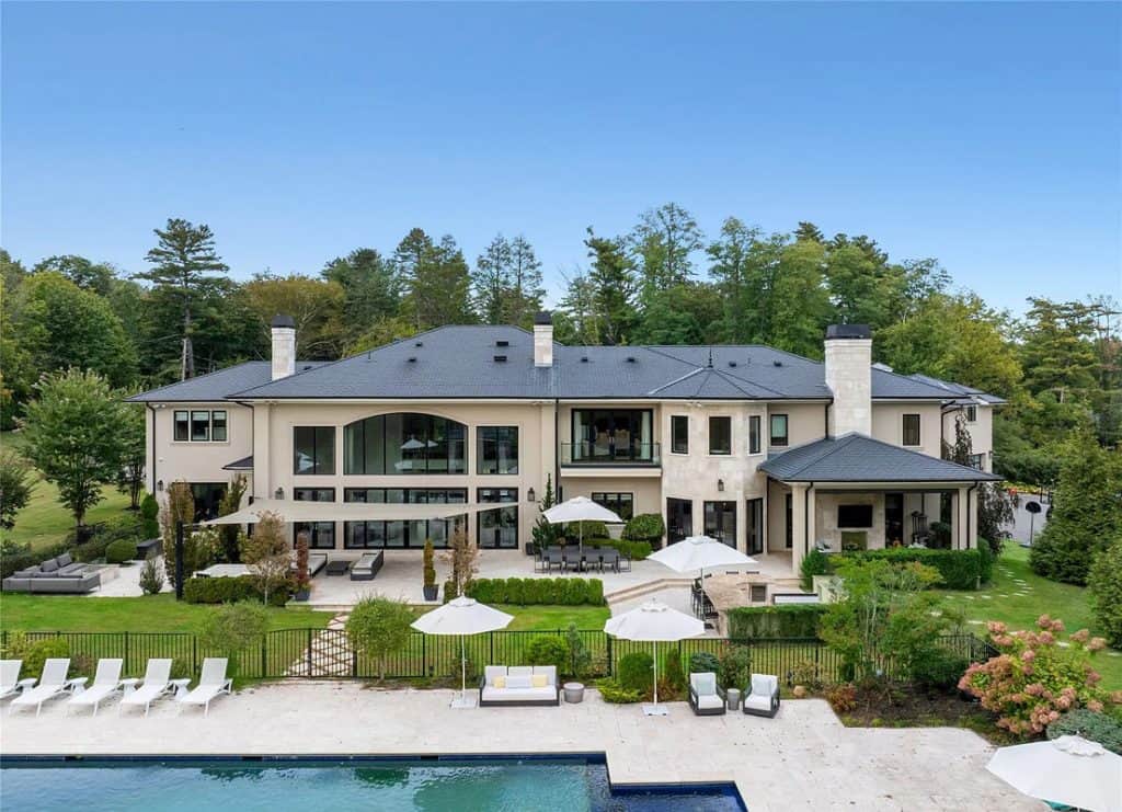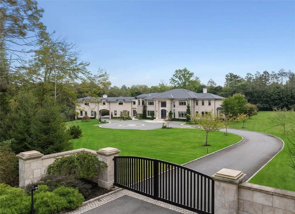 Nestled behind two exclusive gates in one of Long Island’s most esteemed neighborhoods, this newly built estate features 10 bedrooms and 15 bathrooms, showcasing a perfect blend of sophisticated design and opulent living. Inside, a grand marble foyer featuring a sweeping spiral staircase reveals the core of the home: a spacious great room with high ceilings, a modern gas fireplace, a custom wet bar, and expansive glass walls that blur the line between the interior and exterior. The inviting family room includes a cozy fireplace with a custom stone mantel and lovely natural wood built-ins. On the upper floor, the primary wing brings to mind the ambiance of a luxury hotel, featuring a private lounge, a dressing and vanity area, a spa-like bathroom with a large rain shower and soaking tub, heated floors, and several walk-in closets with custom wardrobe designs. It features a one-bedroom guest suite, a media or den area, a full bathroom, a cutting-edge gym equipped with a sound system and sauna, and a full-scale golf simulator for year-round enjoyment. Outside, the luxurious amenities continue with a covered patio that includes a fireplace, a built-in kitchen, and a beautiful in-ground pool and spa.