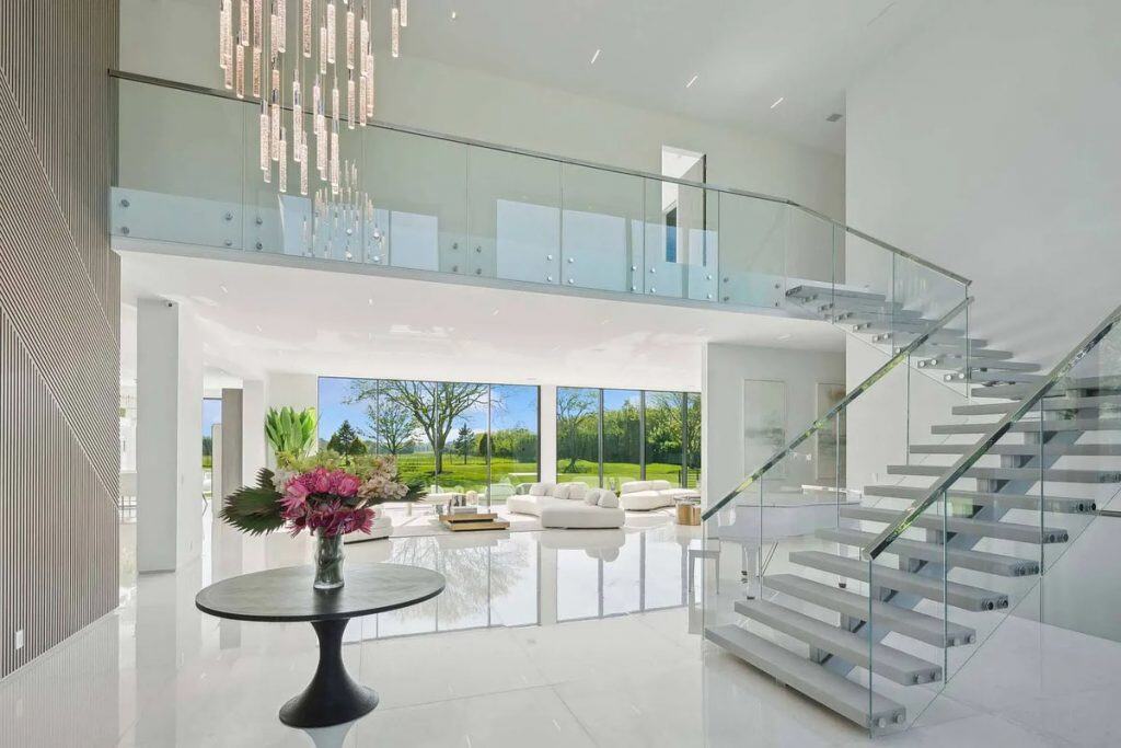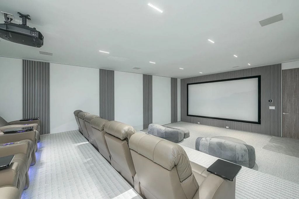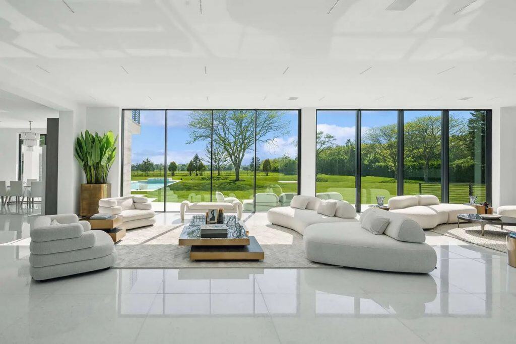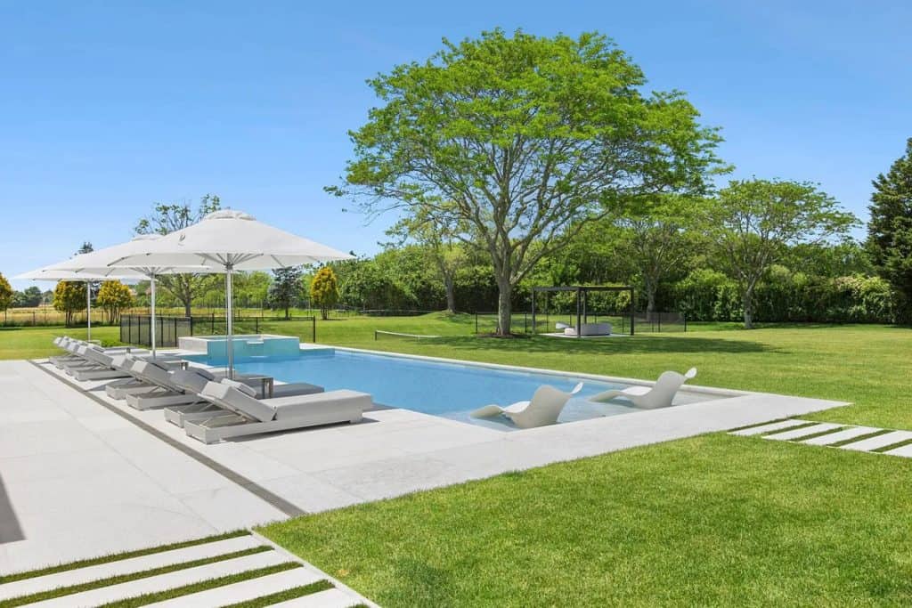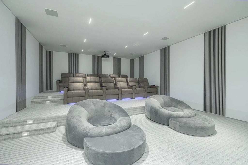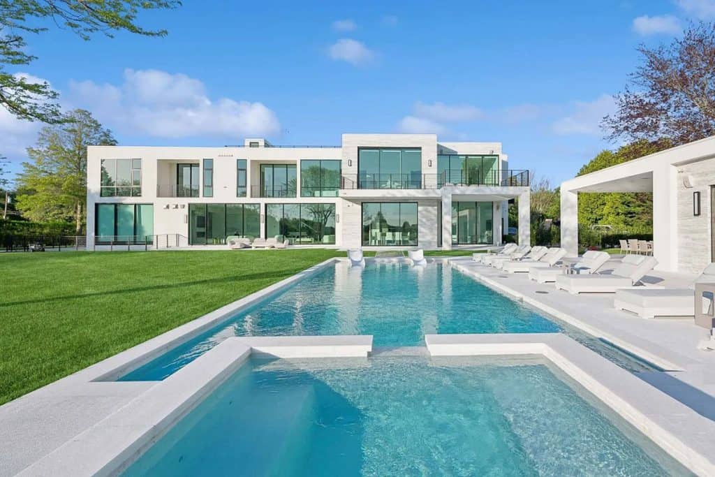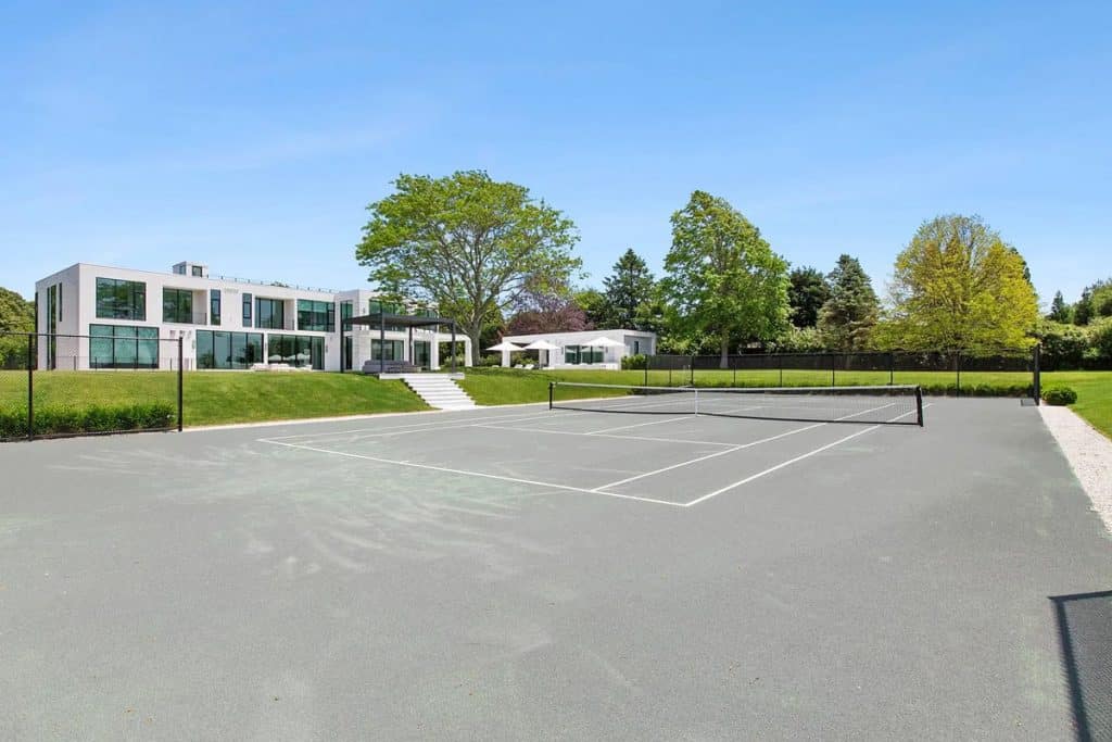 Enjoy a rooftop deck on the third floor, a sunny pool area, a pool house, and a tennis court. Beyond the impressive entry foyer, the first floor features a seamless open-concept design that flows through the expansive great room. This area includes a cozy living room complete with a fireplace, a stunning eat-in kitchen, and a separate chef’s kitchen, highlighted by a stylish glass wine display. This luxurious space includes a generous primary suite that boasts its own private terrace, a wet bar, a bathroom, and walk-in closets. Downstairs, the lower level is designed for year-round enjoyment, featuring a full movie theater with stadium seating, a game room, a golf simulator, a spacious gym complete with a full bath, and a living room equipped with a refreshment area. Experience the great outdoors with a spacious 18’x50′ pool and spa, along with a clay tennis court.