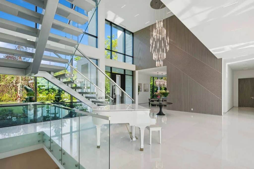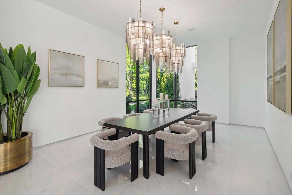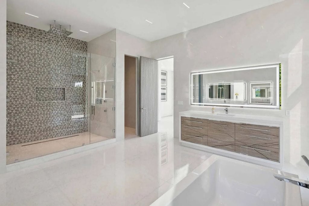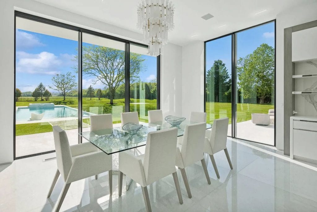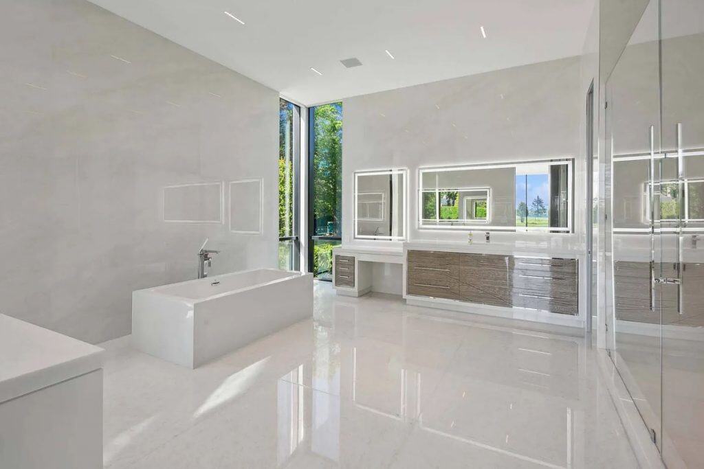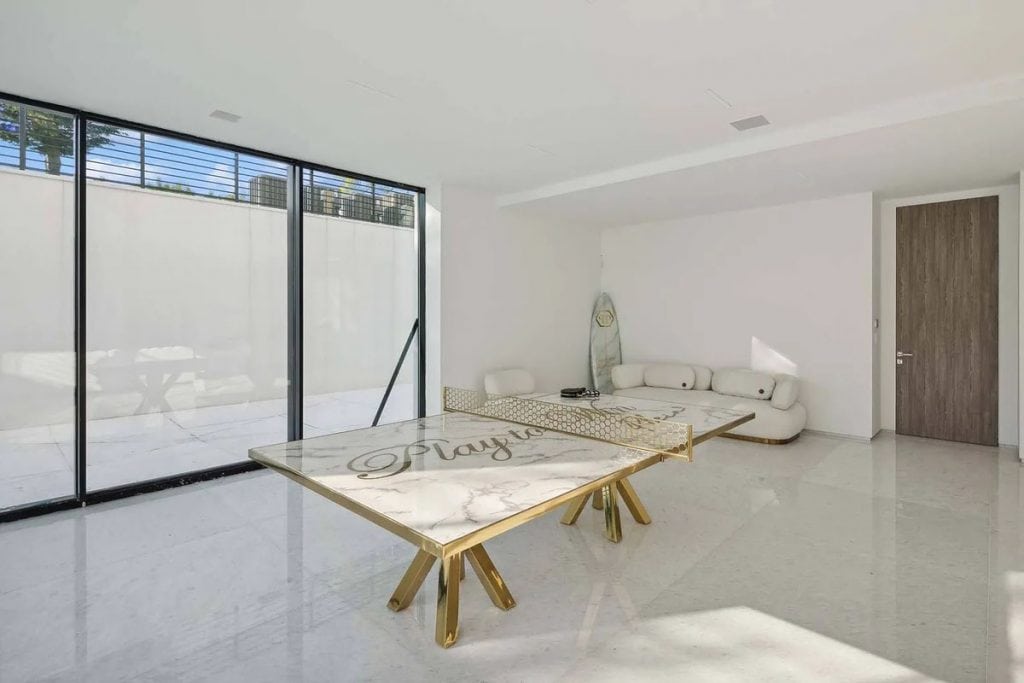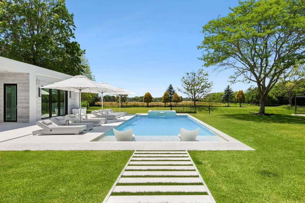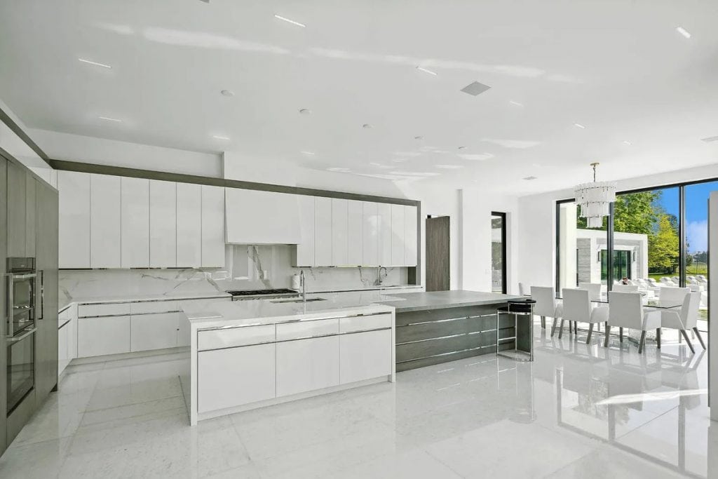 Enjoy a rooftop deck on the third floor, a sunny pool area, a pool house, and a tennis court. Beyond the impressive entry foyer, the first floor features a seamless open-concept design that flows through the expansive great room. This area includes a cozy living room complete with a fireplace, a stunning eat-in kitchen, and a separate chef’s kitchen, highlighted by a stylish glass wine display. This luxurious space includes a generous primary suite that boasts its own private terrace, a wet bar, a bathroom, and walk-in closets. Downstairs, the lower level is designed for year-round enjoyment, featuring a full movie theater with stadium seating, a game room, a golf simulator, a spacious gym complete with a full bath, and a living room equipped with a refreshment area. Experience the great outdoors with a spacious 18’x50′ pool and spa, along with a clay tennis court.