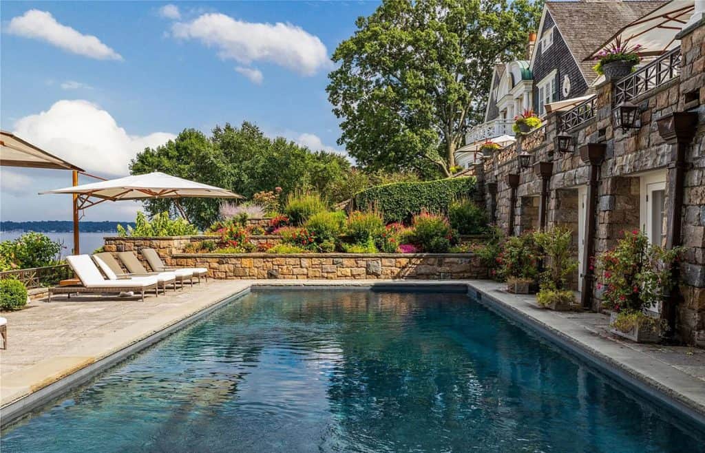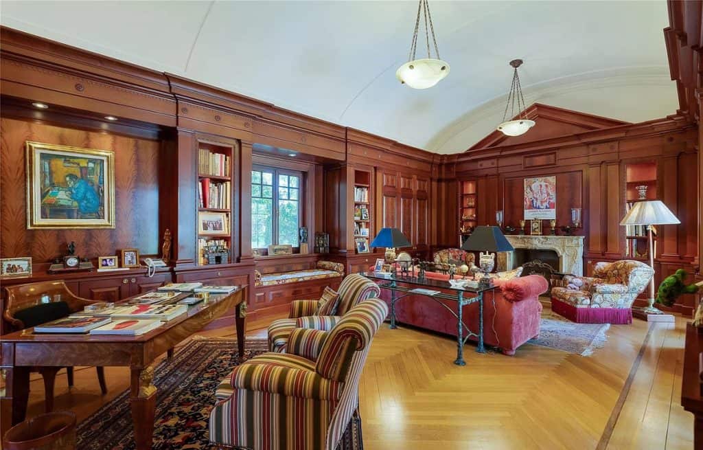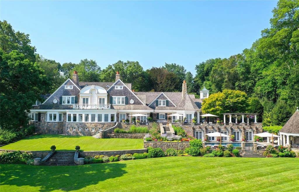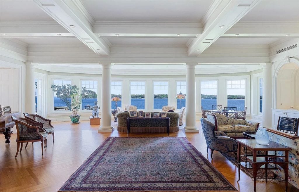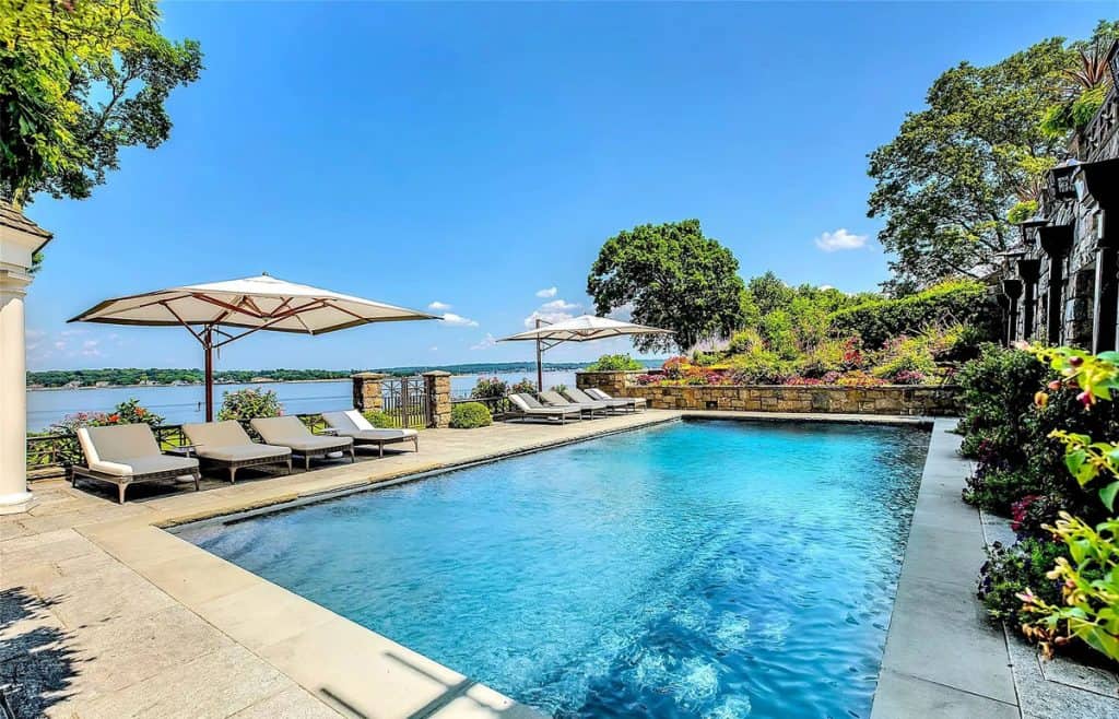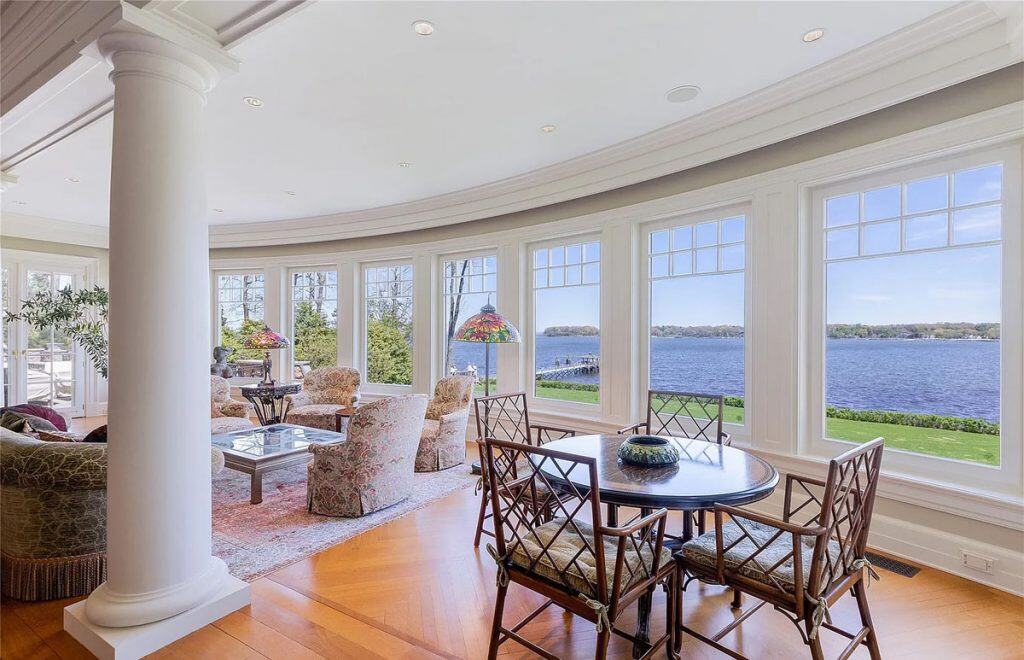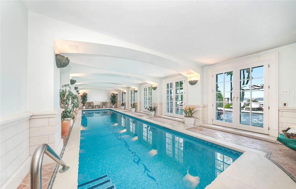 Inside, grand barrel ceilings and cove lighting welcome you into two formal libraries – one adorned with English oak, the other with mahogany – each featuring twin 18th-century fireplaces as a focal point. The elegant dining room showcases an antique fireplace, a crystal chandelier, French doors, and stunning custom millwork, all flowing effortlessly to a stone patio that overlooks the waterfront. The lower level is home to an indoor saltwater lap pool that opens up to the outdoors through French doors, along with a gaming area, a temperature-controlled wine cellar, and changing rooms. The main residence is complemented by an outdoor saltwater pool featuring a slate patio and an entertaining pavilion, while a separate guest cottage with two bedrooms and two bathrooms provides extra lodging.