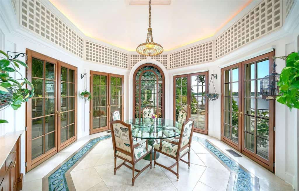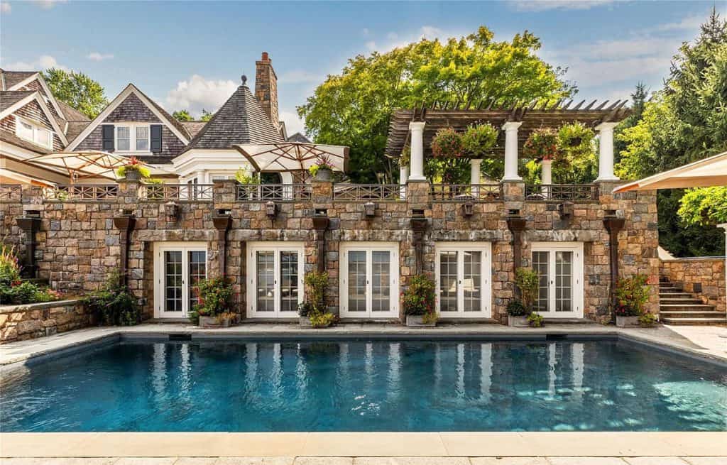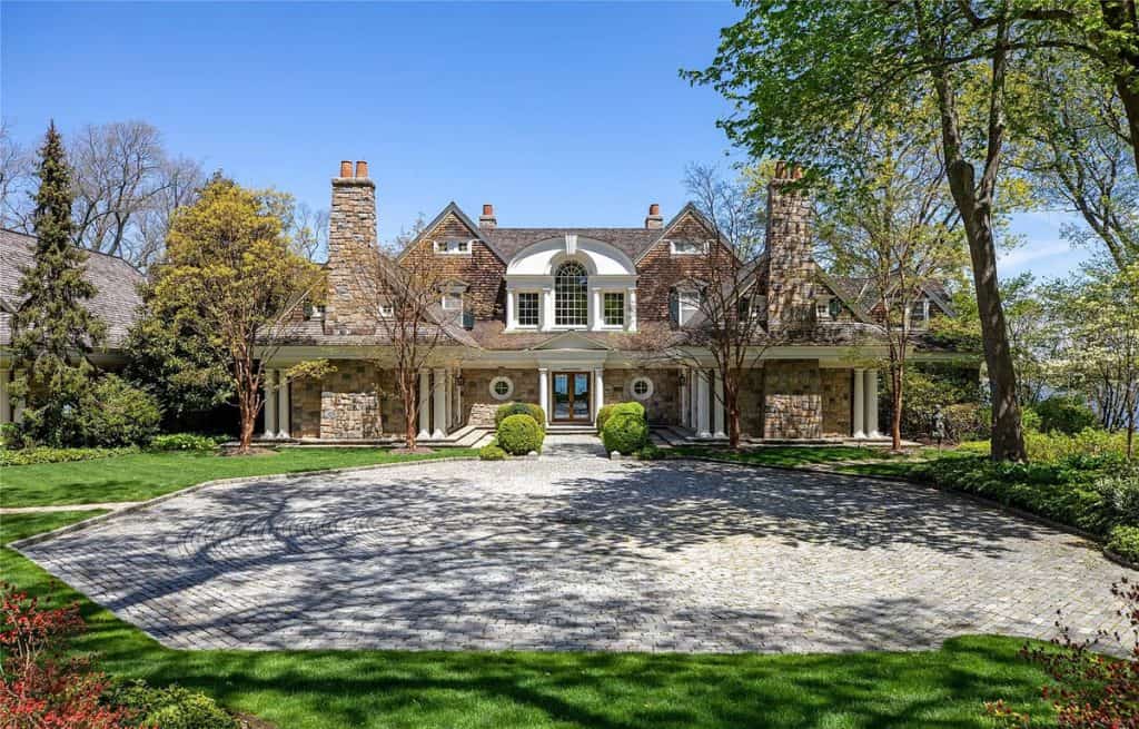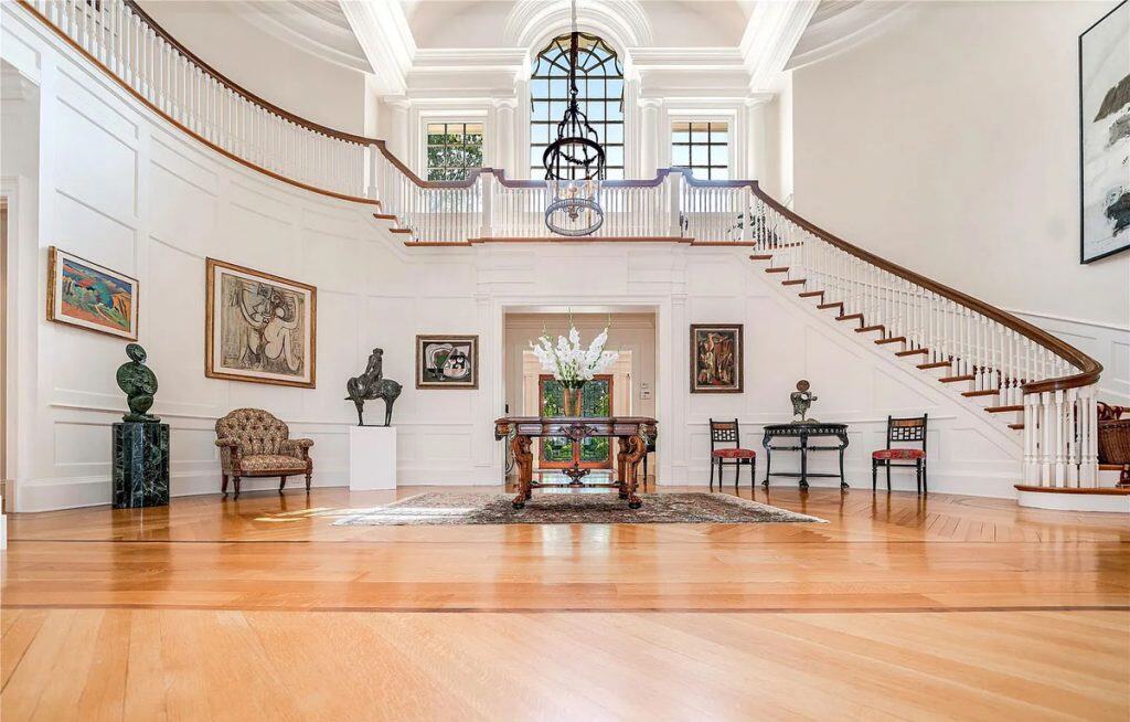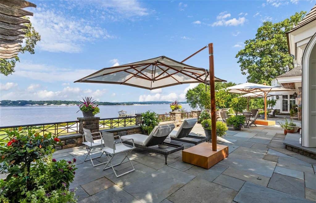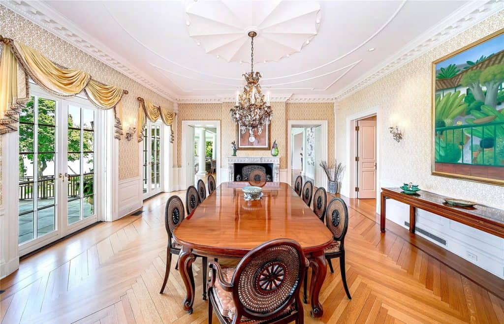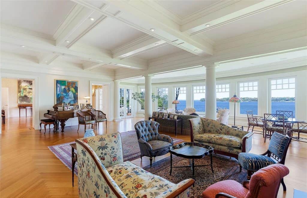 Inside, grand barrel ceilings and cove lighting welcome you into two formal libraries – one adorned with English oak, the other with mahogany – each featuring twin 18th-century fireplaces as a focal point. The elegant dining room showcases an antique fireplace, a crystal chandelier, French doors, and stunning custom millwork, all flowing effortlessly to a stone patio that overlooks the waterfront. The lower level is home to an indoor saltwater lap pool that opens up to the outdoors through French doors, along with a gaming area, a temperature-controlled wine cellar, and changing rooms. The main residence is complemented by an outdoor saltwater pool featuring a slate patio and an entertaining pavilion, while a separate guest cottage with two bedrooms and two bathrooms provides extra lodging.