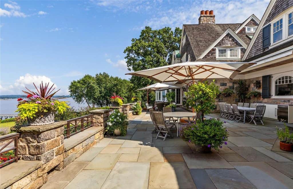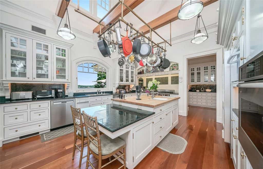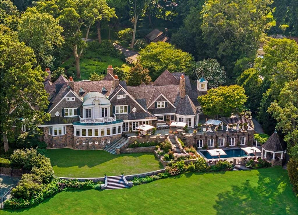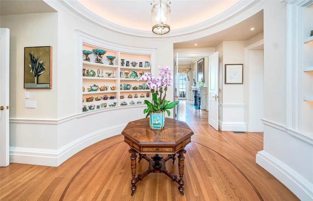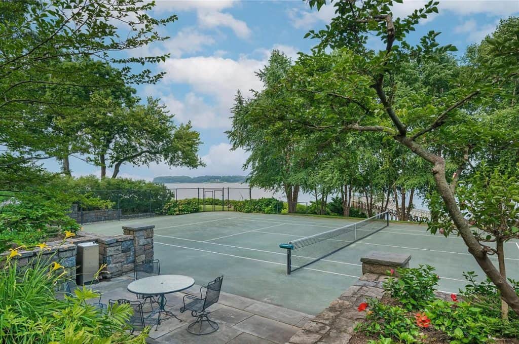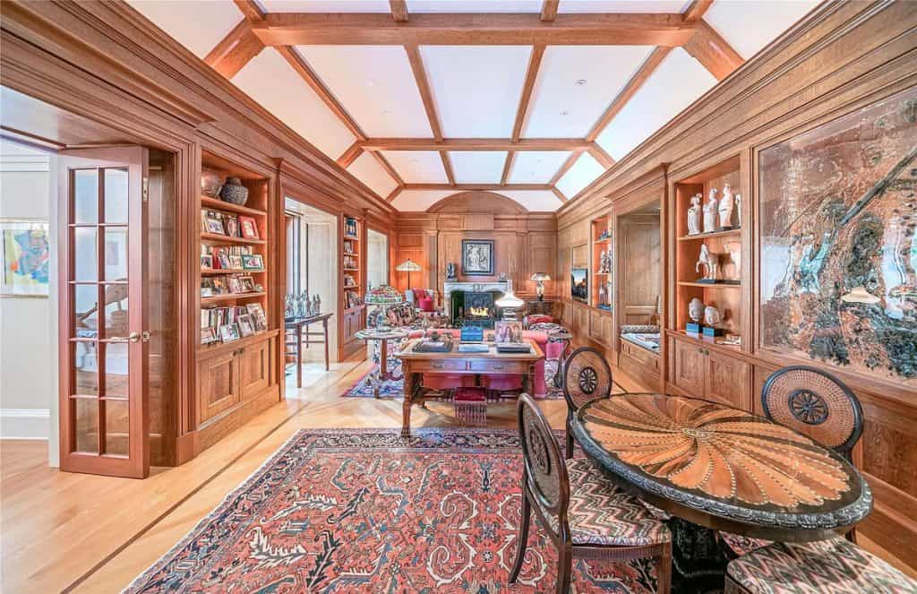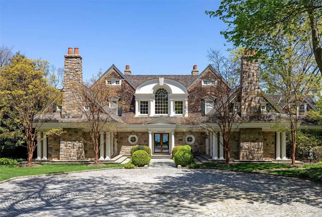 Inside, grand barrel ceilings and cove lighting welcome you into two formal libraries – one adorned with English oak, the other with mahogany – each featuring twin 18th-century fireplaces as a focal point. The elegant dining room showcases an antique fireplace, a crystal chandelier, French doors, and stunning custom millwork, all flowing effortlessly to a stone patio that overlooks the waterfront. The lower level is home to an indoor saltwater lap pool that opens up to the outdoors through French doors, along with a gaming area, a temperature-controlled wine cellar, and changing rooms. The main residence is complemented by an outdoor saltwater pool featuring a slate patio and an entertaining pavilion, while a separate guest cottage with two bedrooms and two bathrooms provides extra lodging.
