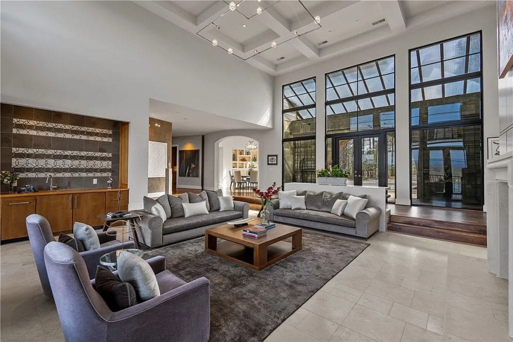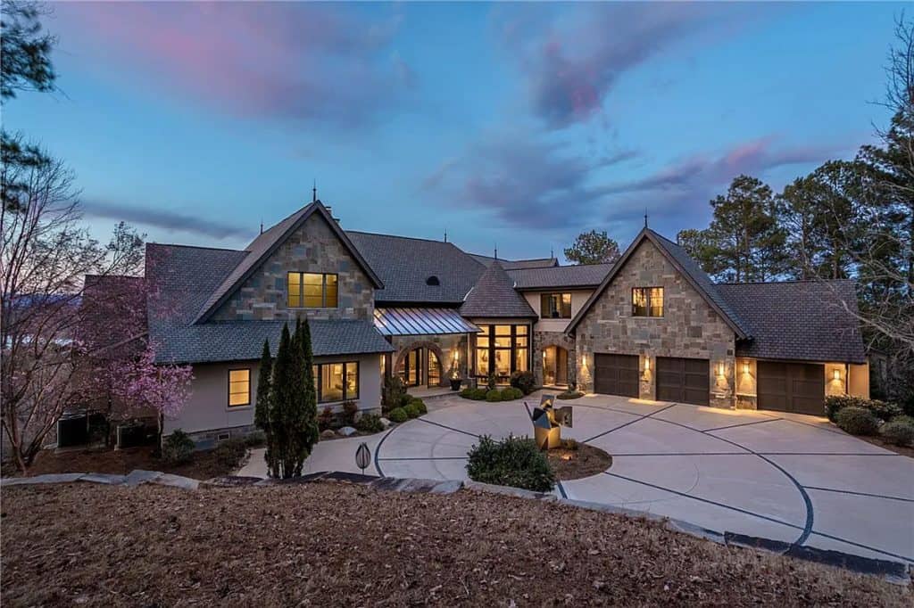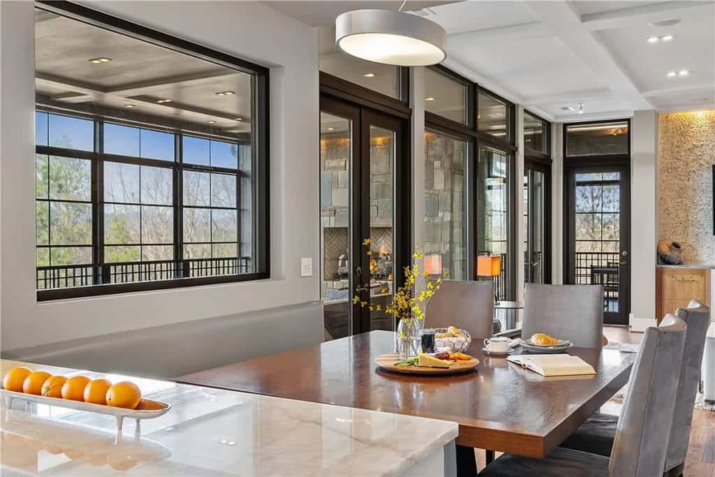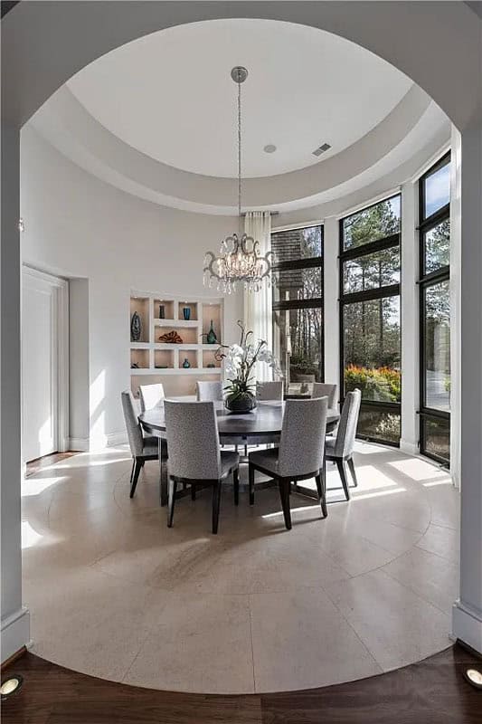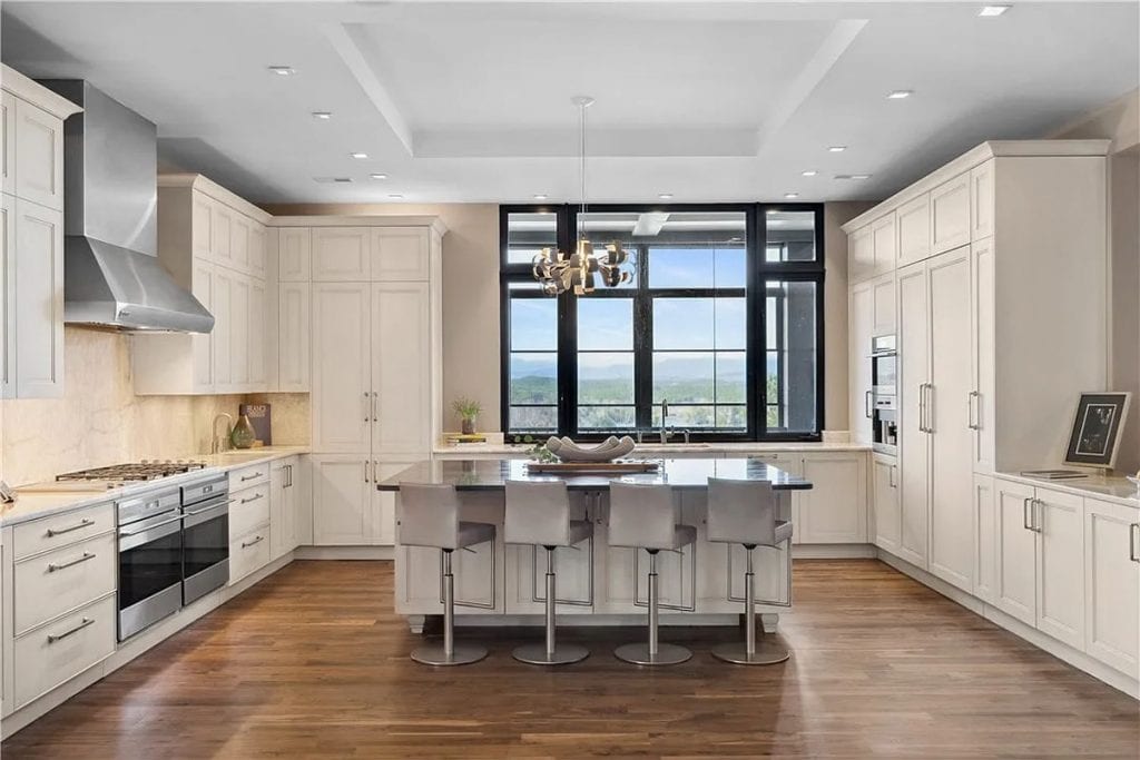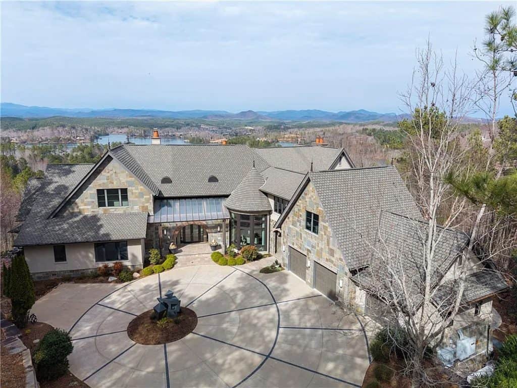Nestled on nearly 6 acres, this stunning retreat boasts breathtaking panoramic views of Lake Keowee and the impressive Blue Ridge Mountains, ensuring that every moment here feels like a masterpiece. Upon entering, you’ll be greeted by stunning black walnut floors and impressive 22-foot hurricane-rated windows that let in abundant light and offer stunning views of the lake and mountains, seamlessly integrating nature into your living space. The living and dining areas feature elegant limestone floors from Paris Ceramics, and an artistic wet bar embellished with exquisite tiles from Artistic Tile adds a striking touch to the inviting atmosphere. These areas are perfect for entertaining, allowing guests to enjoy drinks while surrounded by carefully curated art that reflects the owners’ passion for collecting.