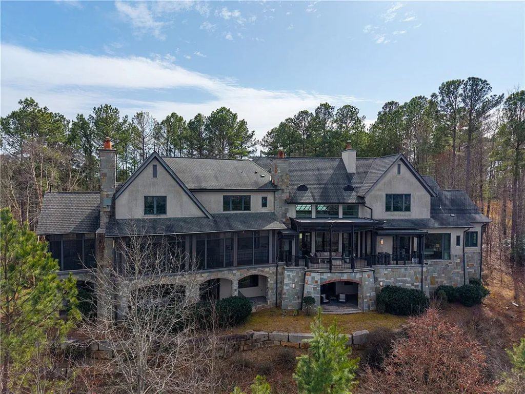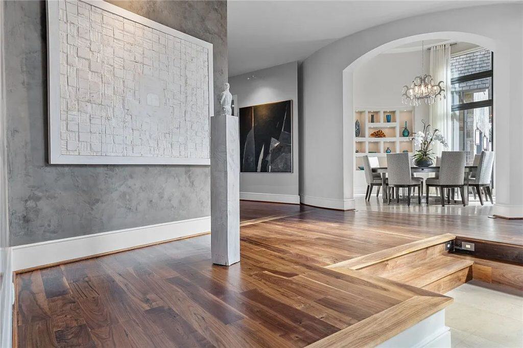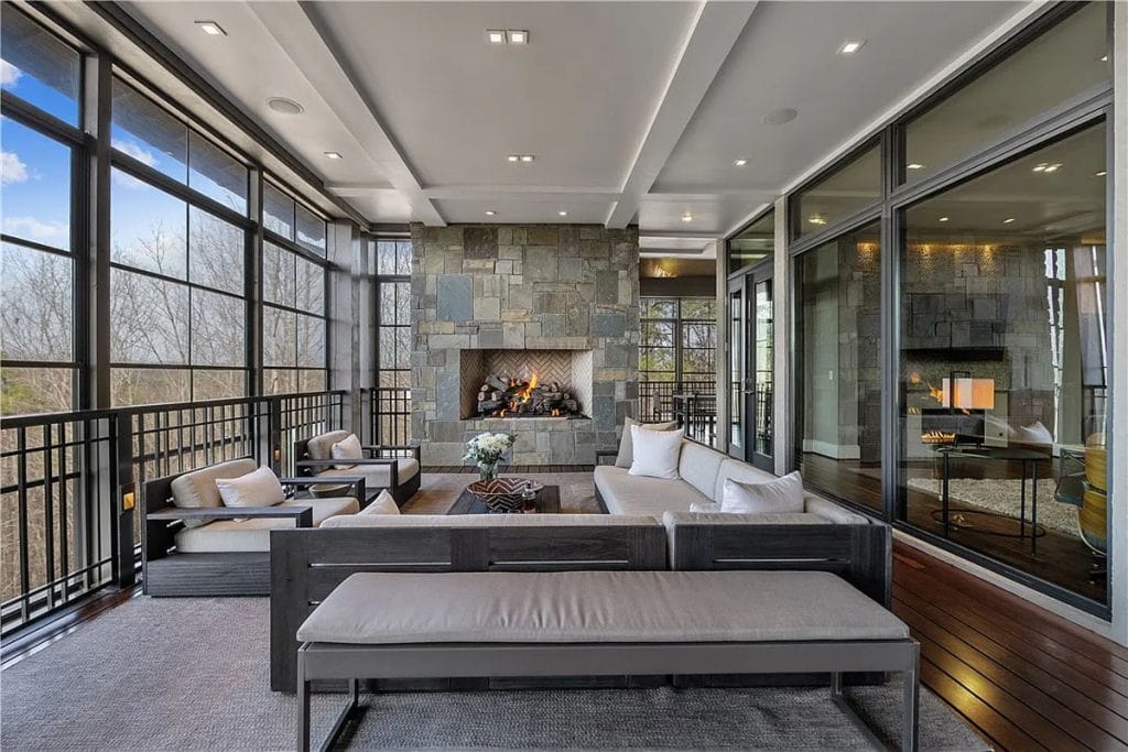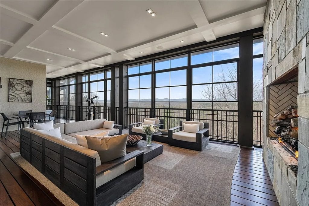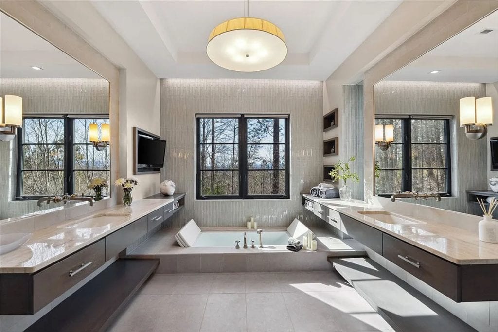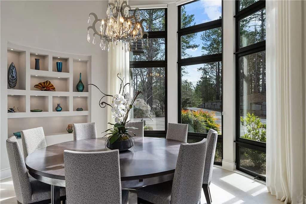 Nestled on nearly 6 acres, this stunning retreat boasts breathtaking panoramic views of Lake Keowee and the impressive Blue Ridge Mountains, ensuring that every moment here feels like a masterpiece. Upon entering, you’ll be greeted by stunning black walnut floors and impressive 22-foot hurricane-rated windows that let in abundant light and offer stunning views of the lake and mountains, seamlessly integrating nature into your living space. The living and dining areas feature elegant limestone floors from Paris Ceramics, and an artistic wet bar embellished with exquisite tiles from Artistic Tile adds a striking touch to the inviting atmosphere. These areas are perfect for entertaining, allowing guests to enjoy drinks while surrounded by carefully curated art that reflects the owners’ passion for collecting.