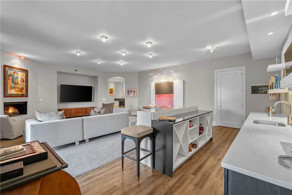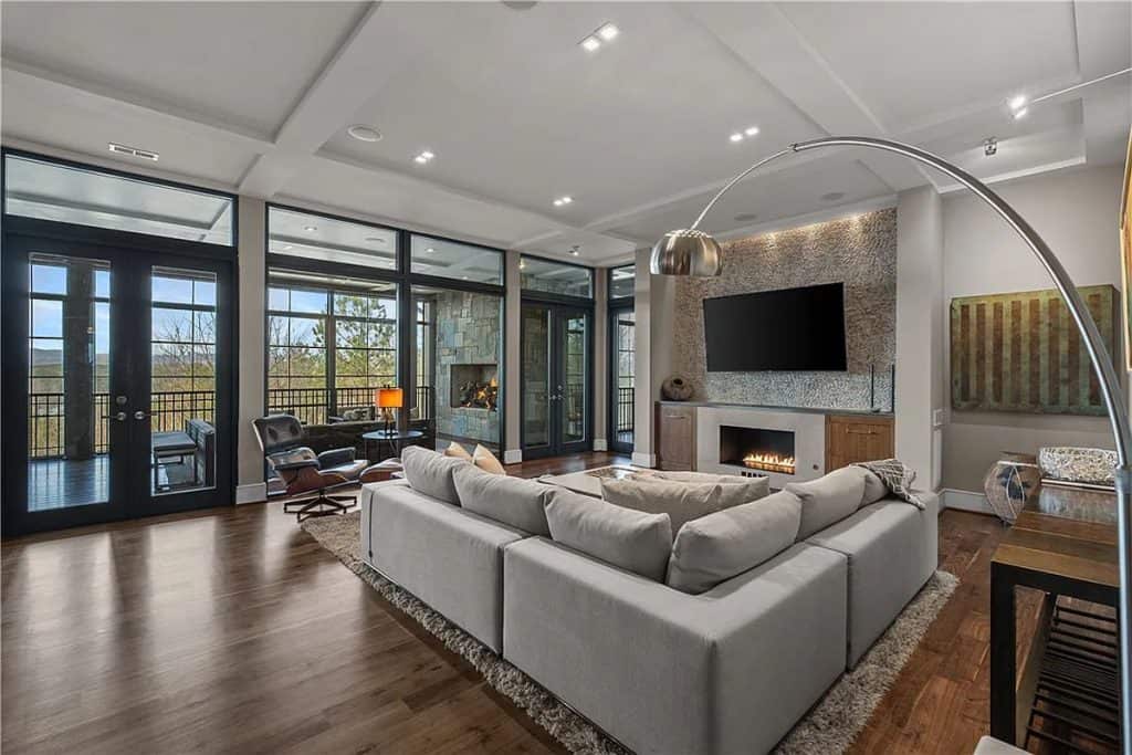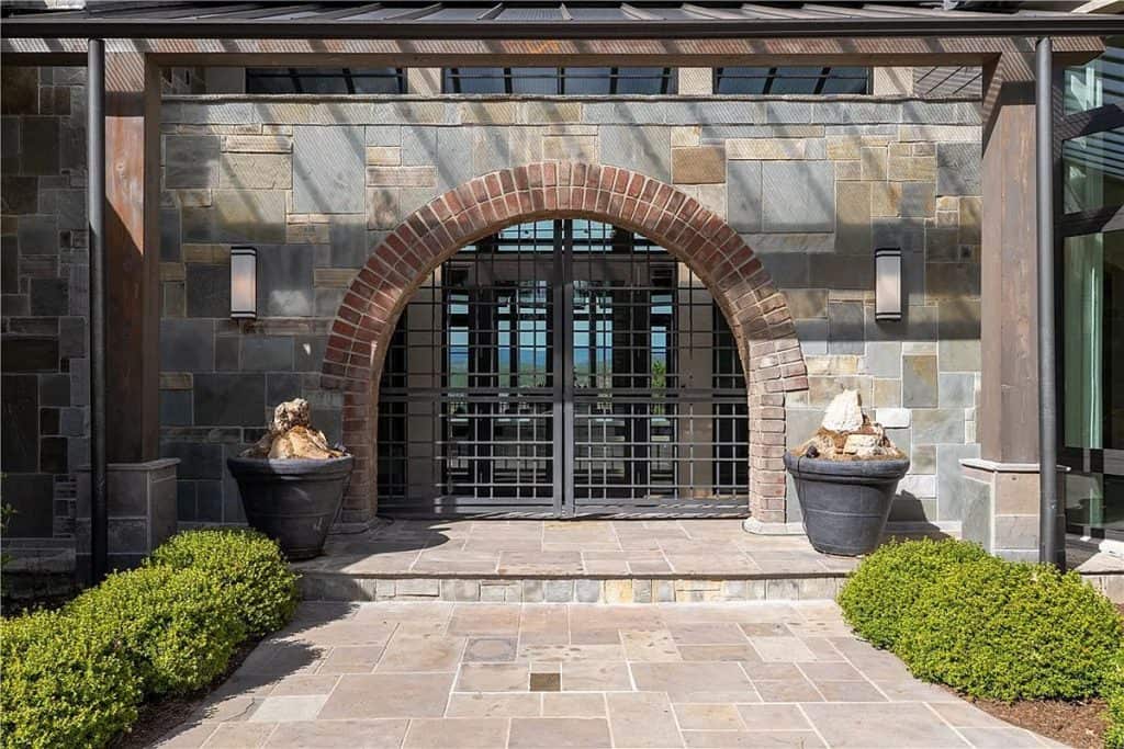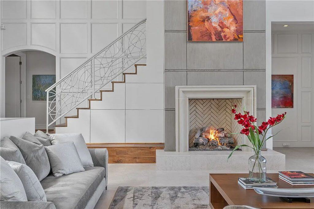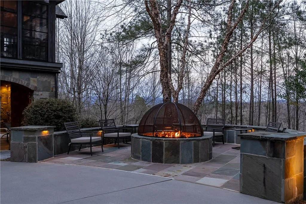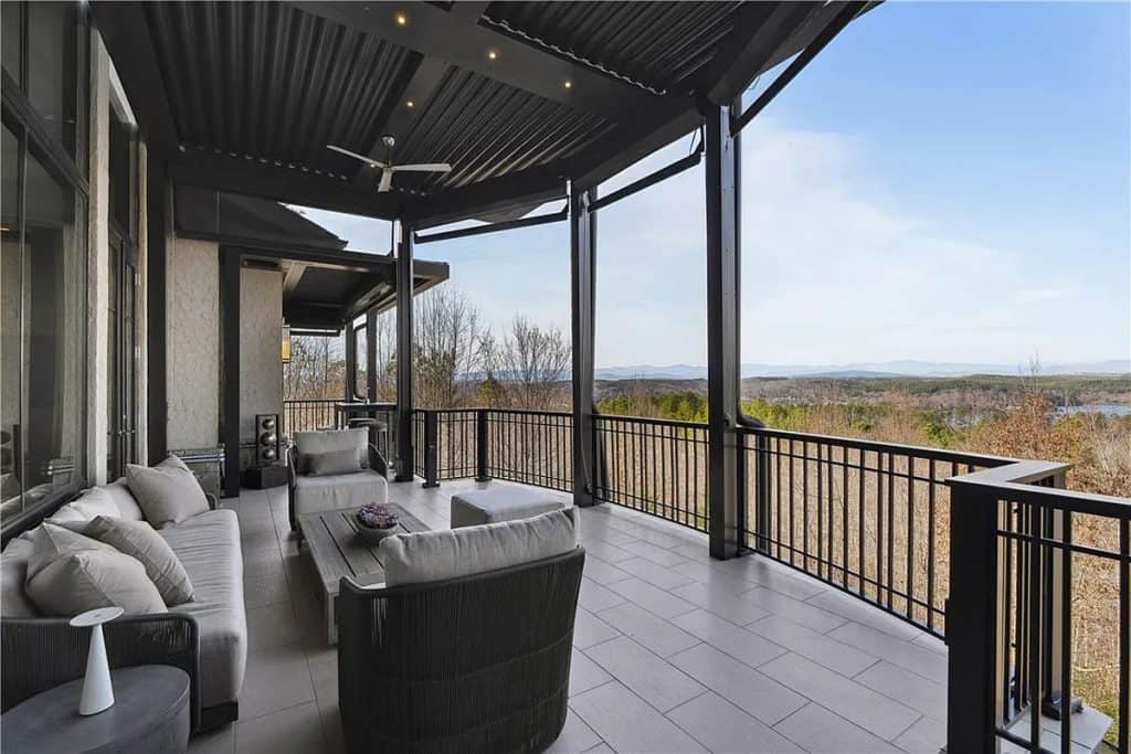 Nestled on nearly 6 acres, this stunning retreat boasts breathtaking panoramic views of Lake Keowee and the impressive Blue Ridge Mountains, ensuring that every moment here feels like a masterpiece. Upon entering, you’ll be greeted by stunning black walnut floors and impressive 22-foot hurricane-rated windows that let in abundant light and offer stunning views of the lake and mountains, seamlessly integrating nature into your living space. The living and dining areas feature elegant limestone floors from Paris Ceramics, and an artistic wet bar embellished with exquisite tiles from Artistic Tile adds a striking touch to the inviting atmosphere. These areas are perfect for entertaining, allowing guests to enjoy drinks while surrounded by carefully curated art that reflects the owners’ passion for collecting.