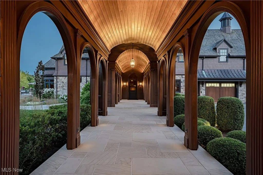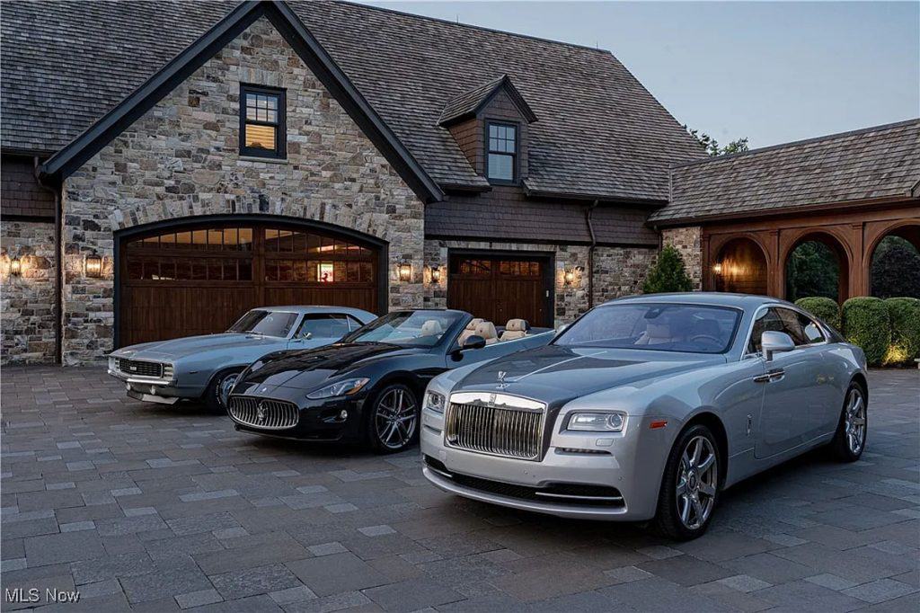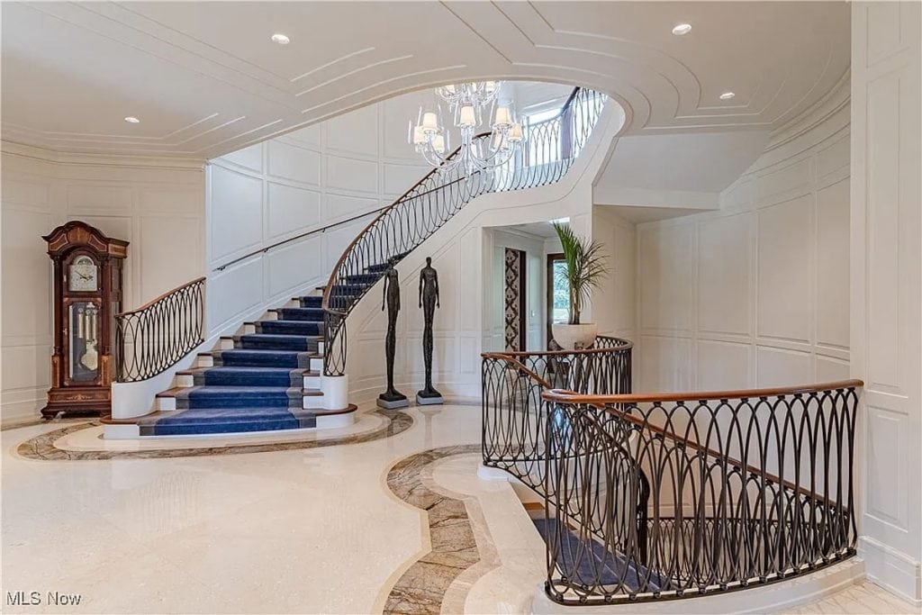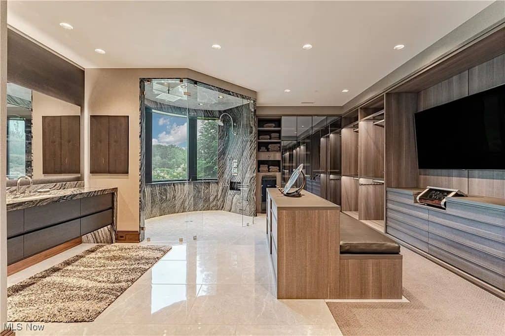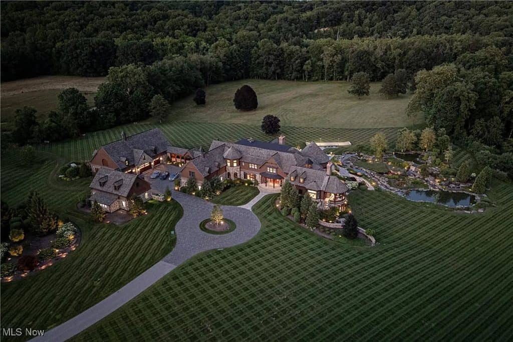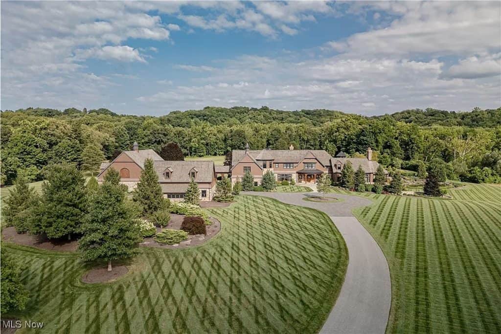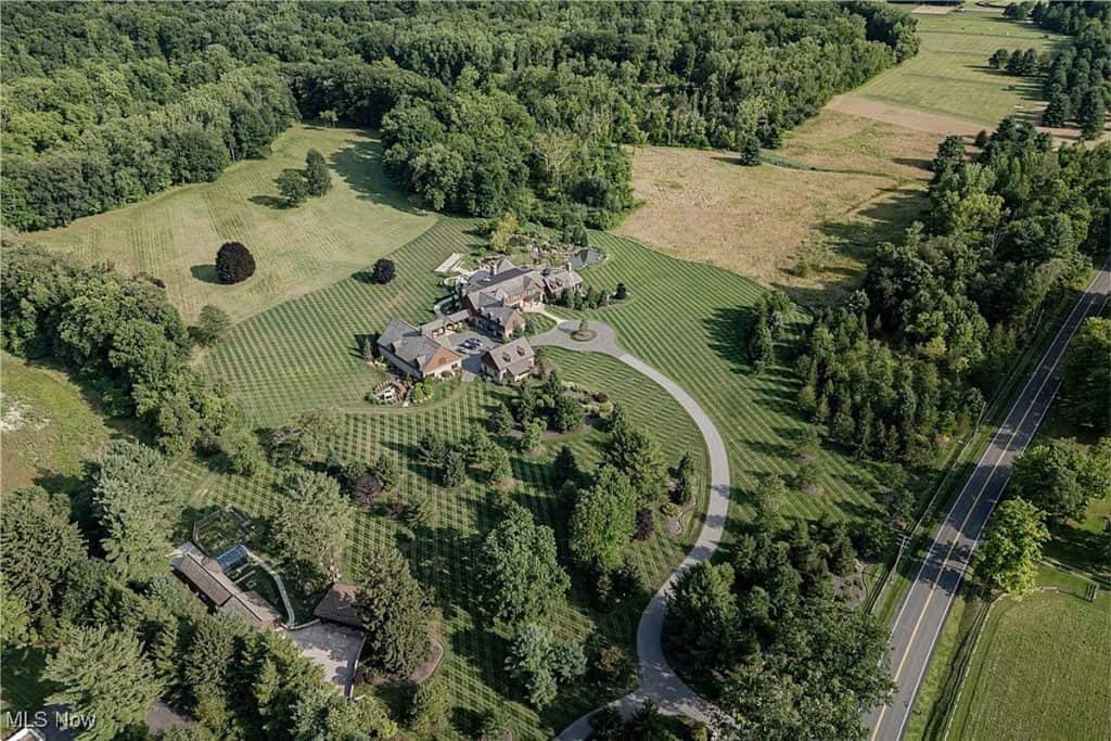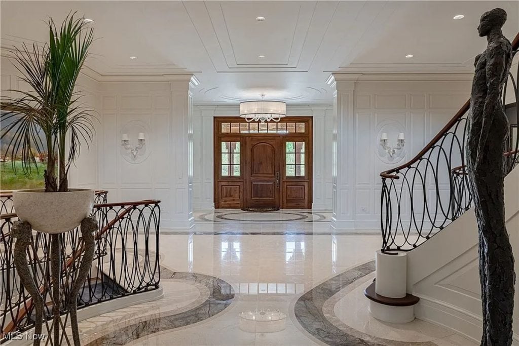 Step into the most remarkable property in the Midwest that stretches across 61 acres by the beautiful Chagrin River in Hunting Valley, OH. As you enter, you’ll be welcomed by a Bentley Home chandelier and gorgeous Italian marble flooring. On the left side of the foyer, you’ll find the dining room adorned with a breathtaking “Peacock mosaic mural” by SICIS. Take the winding staircase down or choose the elevator to access the lower level. This space features a modern gym, an extra primary bathroom and closet, a sauna, a steam room, and a spacious entertainment area that boasts a bar, billiards table, stage, and a wine room with temperature control, beautifully decorated with another stunning SICIS mural. The outdoor space is equipped with a four-season room, a plunge pool, a bocce ball court, and a greenhouse. A beautifully arched breezeway guides you to a separate garage that can accommodate up to 20 vehicles, featuring an upper level with a bar, golf simulator, and barber room.