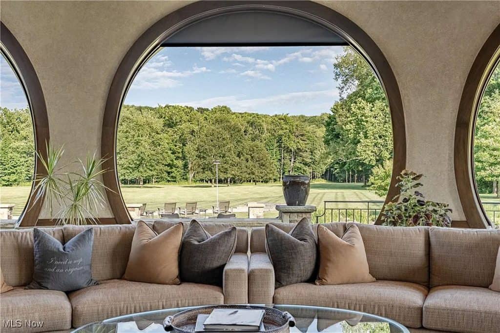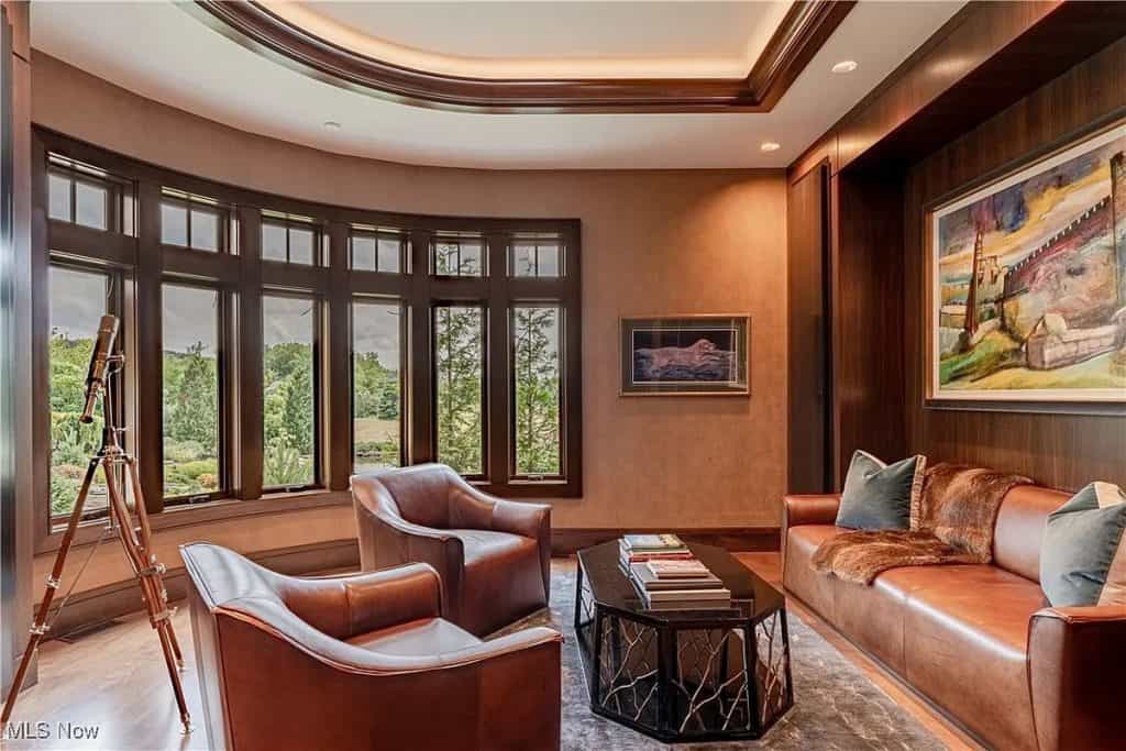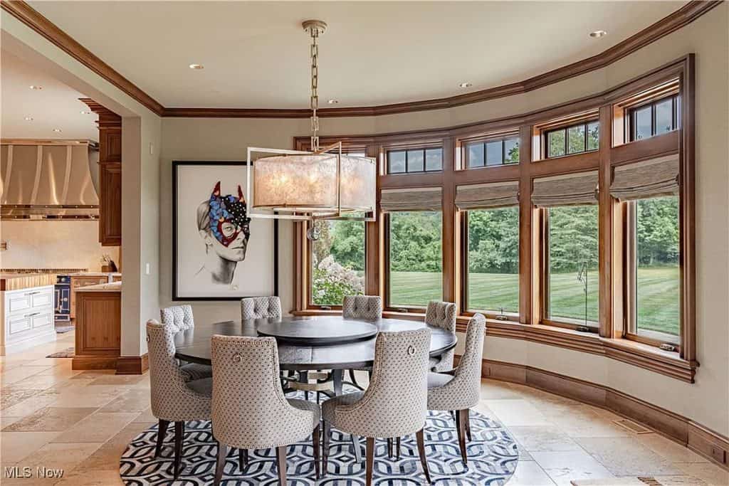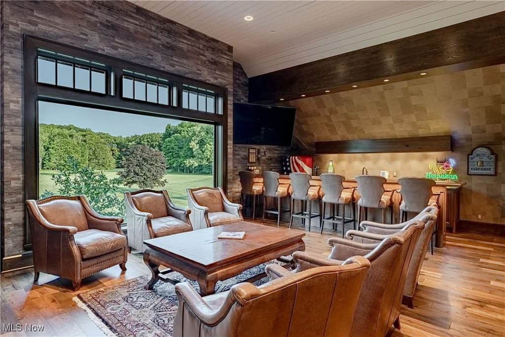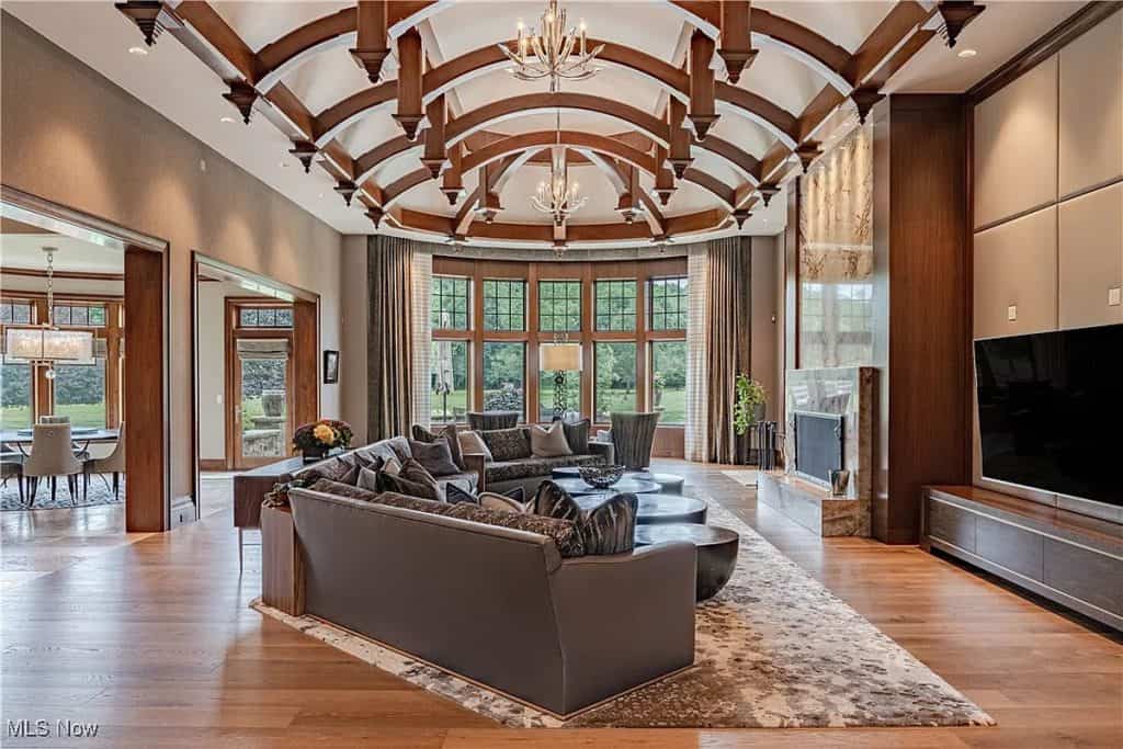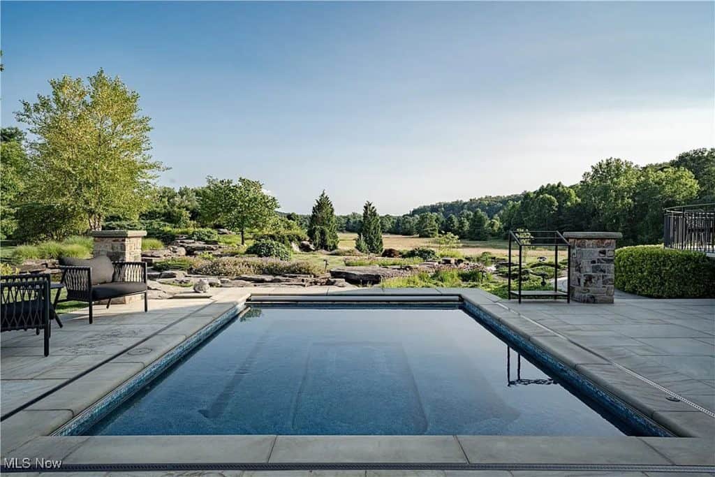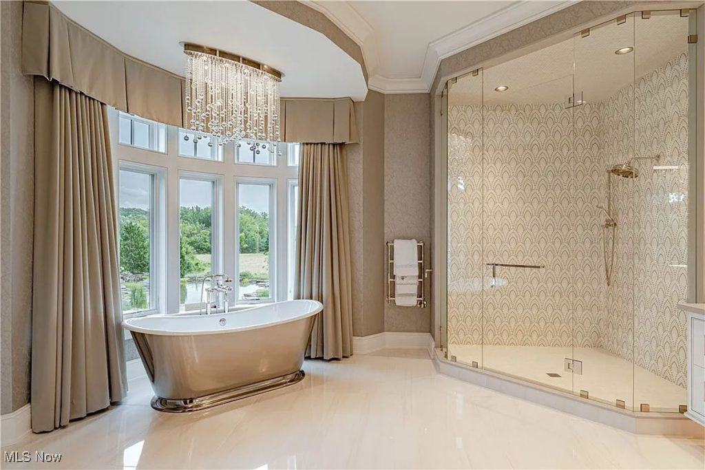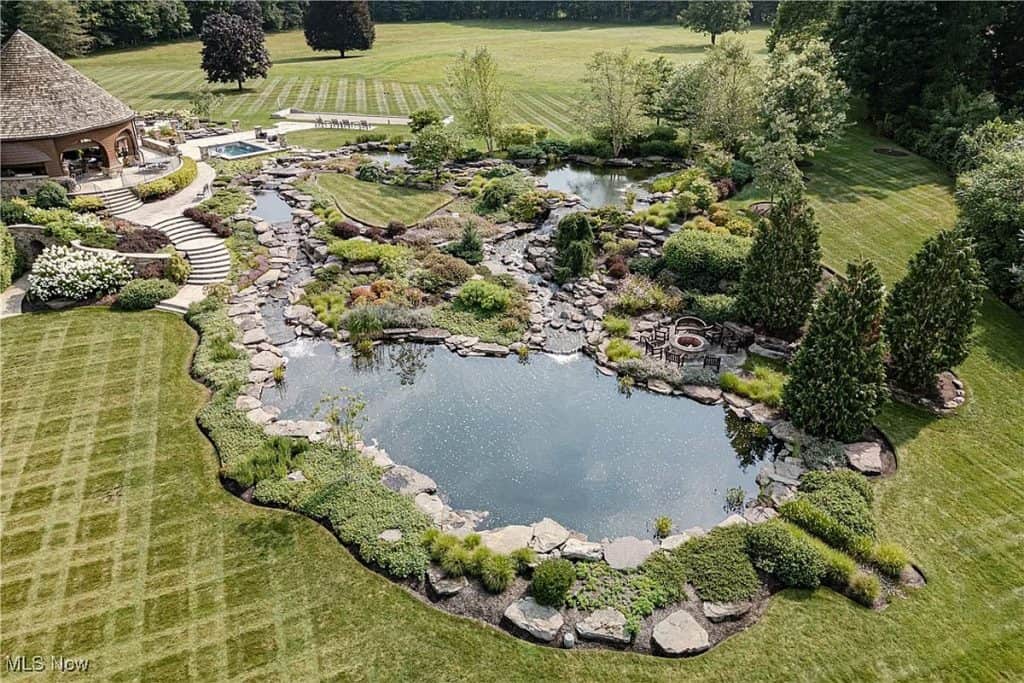 Step into the most remarkable property in the Midwest that stretches across 61 acres by the beautiful Chagrin River in Hunting Valley, OH. As you enter, you’ll be welcomed by a Bentley Home chandelier and gorgeous Italian marble flooring. On the left side of the foyer, you’ll find the dining room adorned with a breathtaking “Peacock mosaic mural” by SICIS. Take the winding staircase down or choose the elevator to access the lower level. This space features a modern gym, an extra primary bathroom and closet, a sauna, a steam room, and a spacious entertainment area that boasts a bar, billiards table, stage, and a wine room with temperature control, beautifully decorated with another stunning SICIS mural. The outdoor space is equipped with a four-season room, a plunge pool, a bocce ball court, and a greenhouse. A beautifully arched breezeway guides you to a separate garage that can accommodate up to 20 vehicles, featuring an upper level with a bar, golf simulator, and barber room.