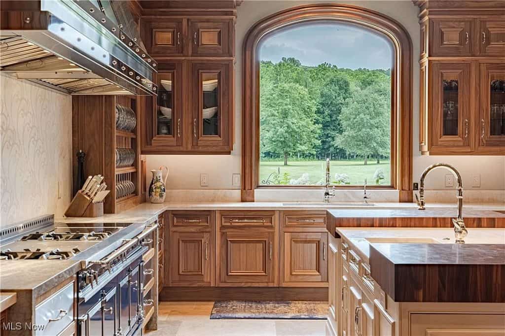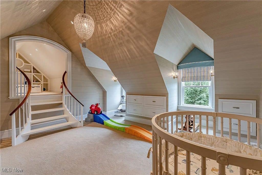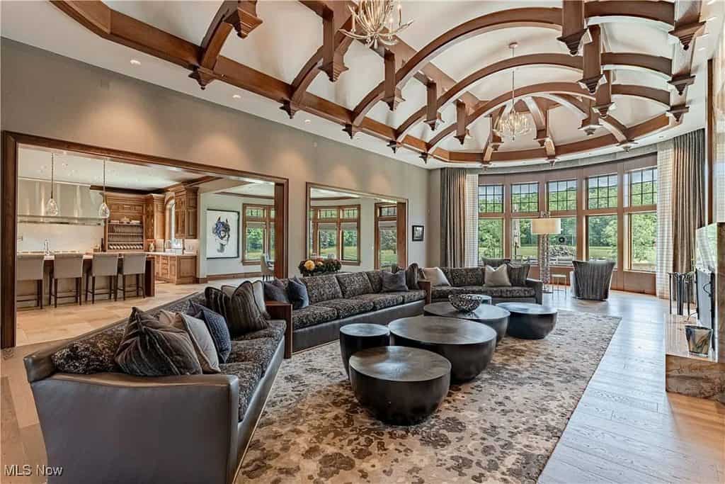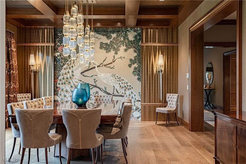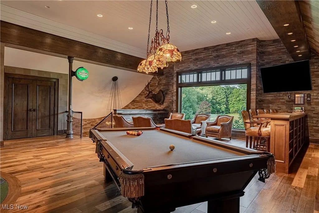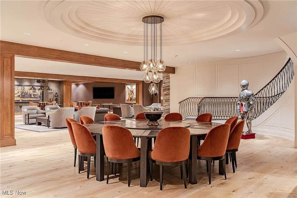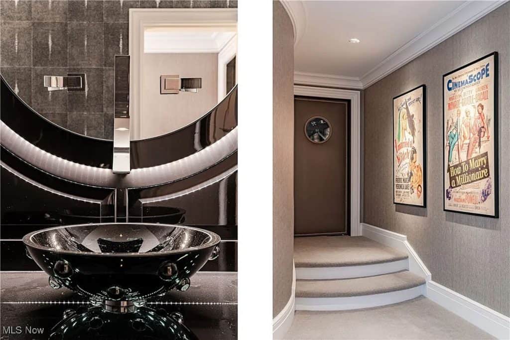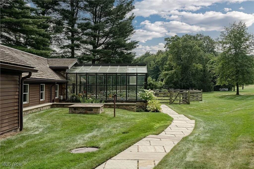 Step into the most remarkable property in the Midwest that stretches across 61 acres by the beautiful Chagrin River in Hunting Valley, OH. As you enter, you’ll be welcomed by a Bentley Home chandelier and gorgeous Italian marble flooring. On the left side of the foyer, you’ll find the dining room adorned with a breathtaking “Peacock mosaic mural” by SICIS. Take the winding staircase down or choose the elevator to access the lower level. This space features a modern gym, an extra primary bathroom and closet, a sauna, a steam room, and a spacious entertainment area that boasts a bar, billiards table, stage, and a wine room with temperature control, beautifully decorated with another stunning SICIS mural. The outdoor space is equipped with a four-season room, a plunge pool, a bocce ball court, and a greenhouse. A beautifully arched breezeway guides you to a separate garage that can accommodate up to 20 vehicles, featuring an upper level with a bar, golf simulator, and barber room.
