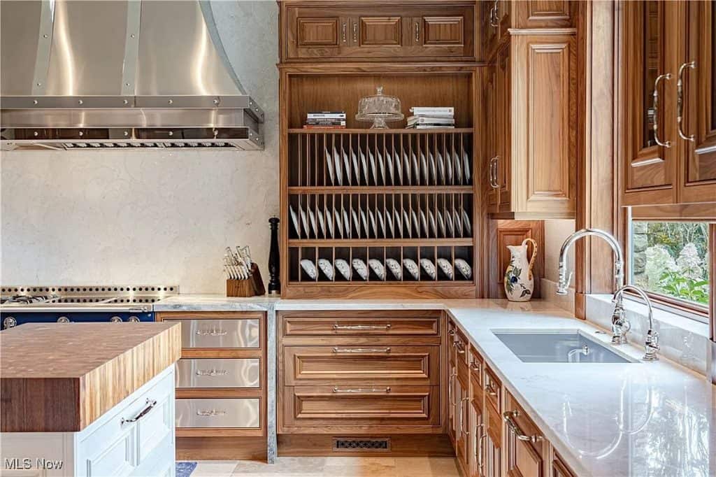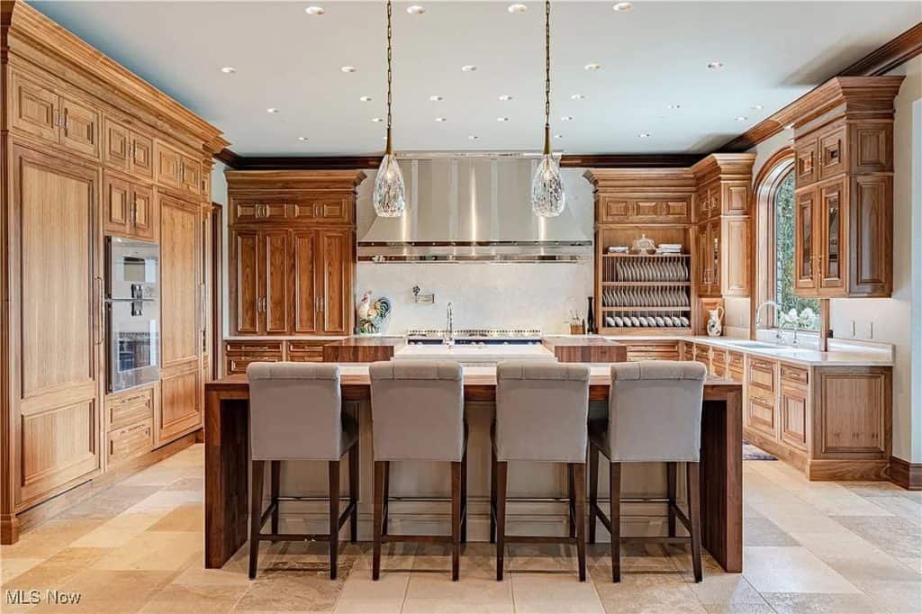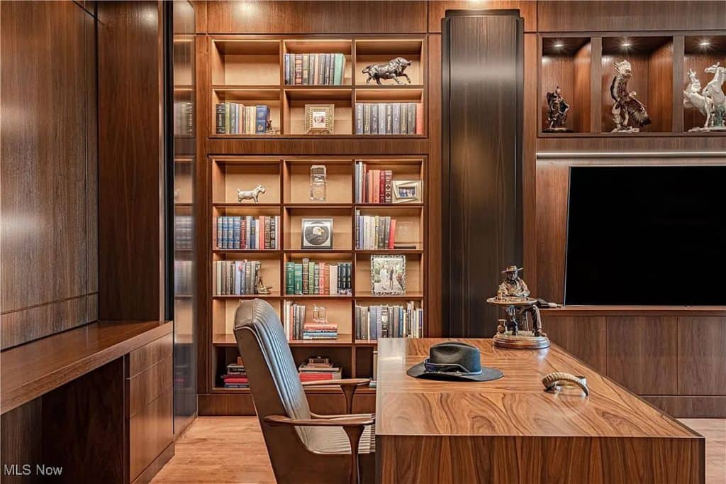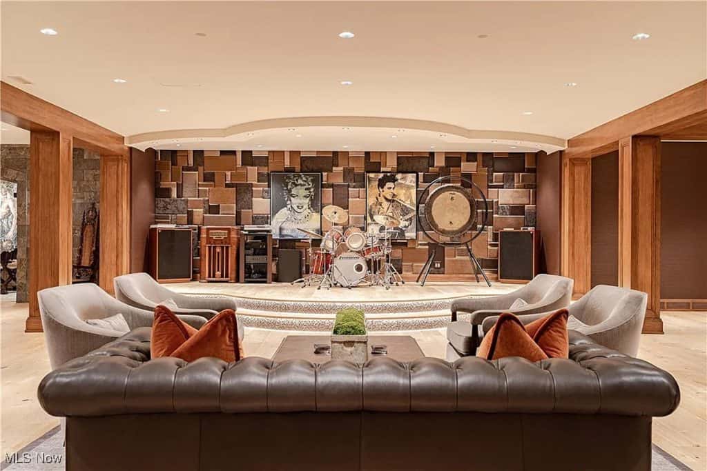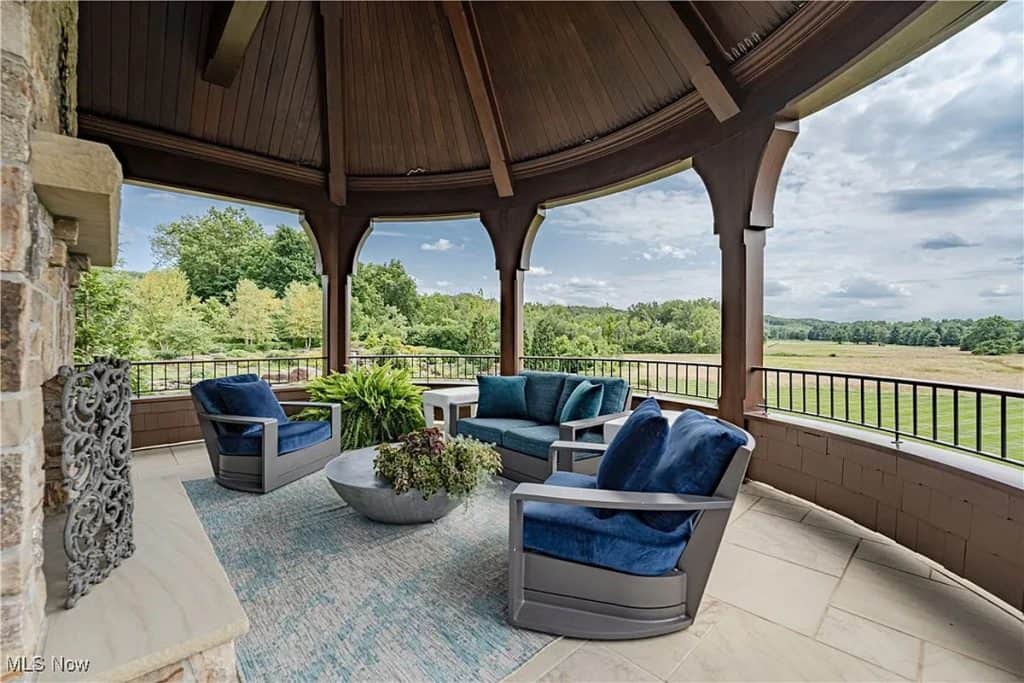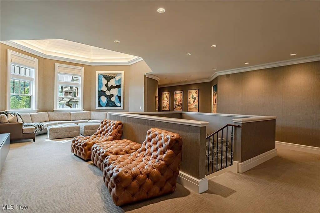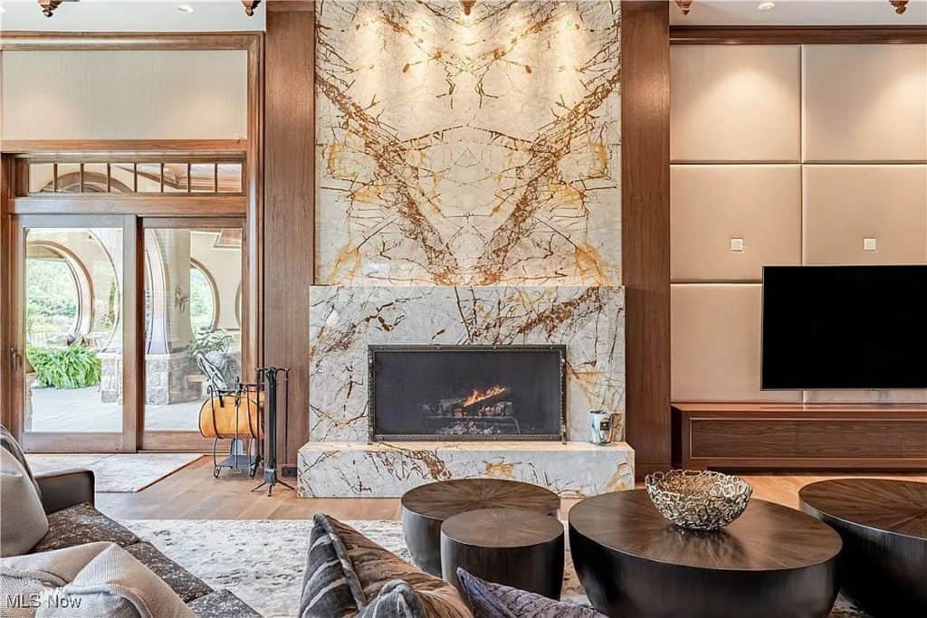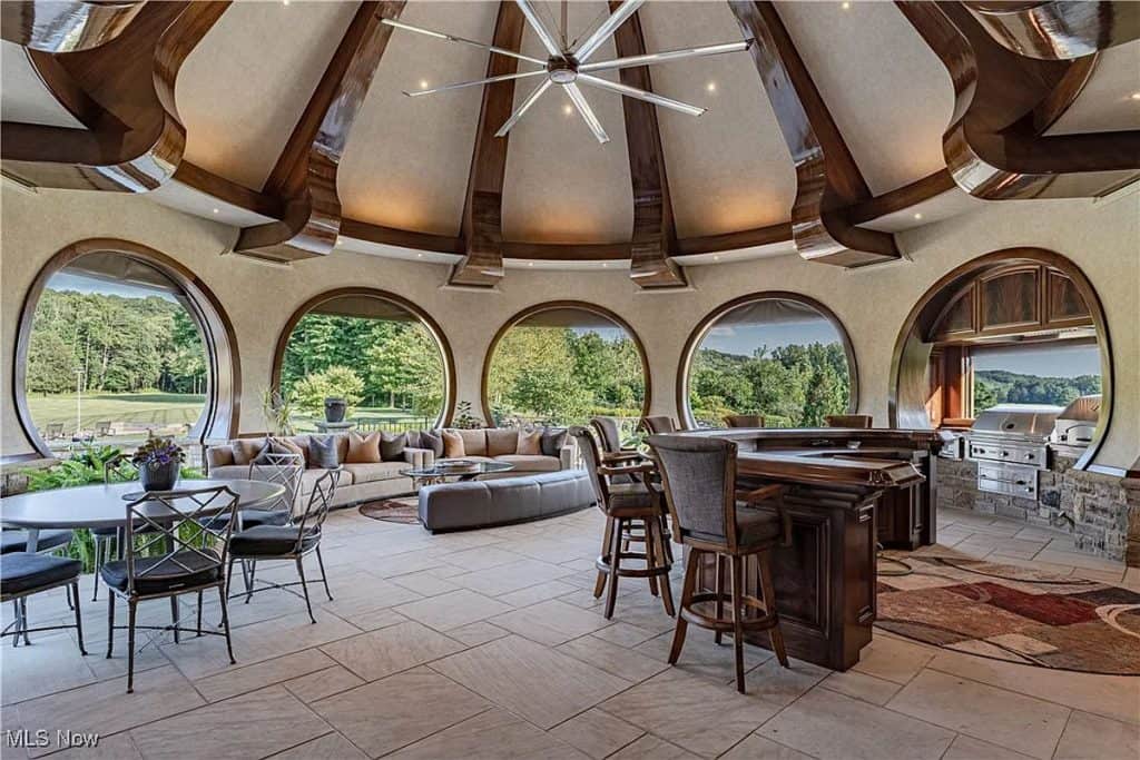 Step into the most remarkable property in the Midwest that stretches across 61 acres by the beautiful Chagrin River in Hunting Valley, OH. As you enter, you’ll be welcomed by a Bentley Home chandelier and gorgeous Italian marble flooring. On the left side of the foyer, you’ll find the dining room adorned with a breathtaking “Peacock mosaic mural” by SICIS. Take the winding staircase down or choose the elevator to access the lower level. This space features a modern gym, an extra primary bathroom and closet, a sauna, a steam room, and a spacious entertainment area that boasts a bar, billiards table, stage, and a wine room with temperature control, beautifully decorated with another stunning SICIS mural. The outdoor space is equipped with a four-season room, a plunge pool, a bocce ball court, and a greenhouse. A beautifully arched breezeway guides you to a separate garage that can accommodate up to 20 vehicles, featuring an upper level with a bar, golf simulator, and barber room.